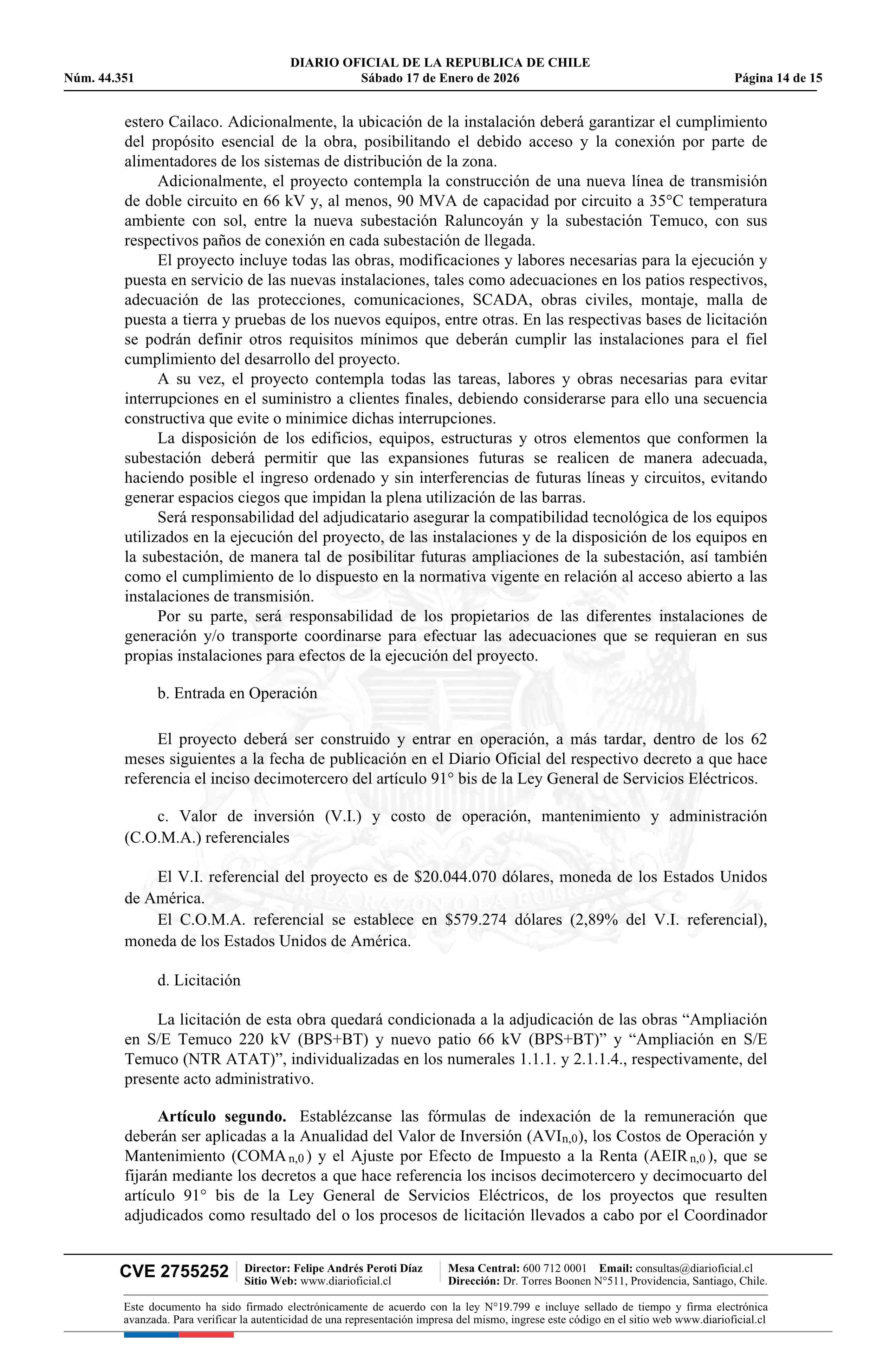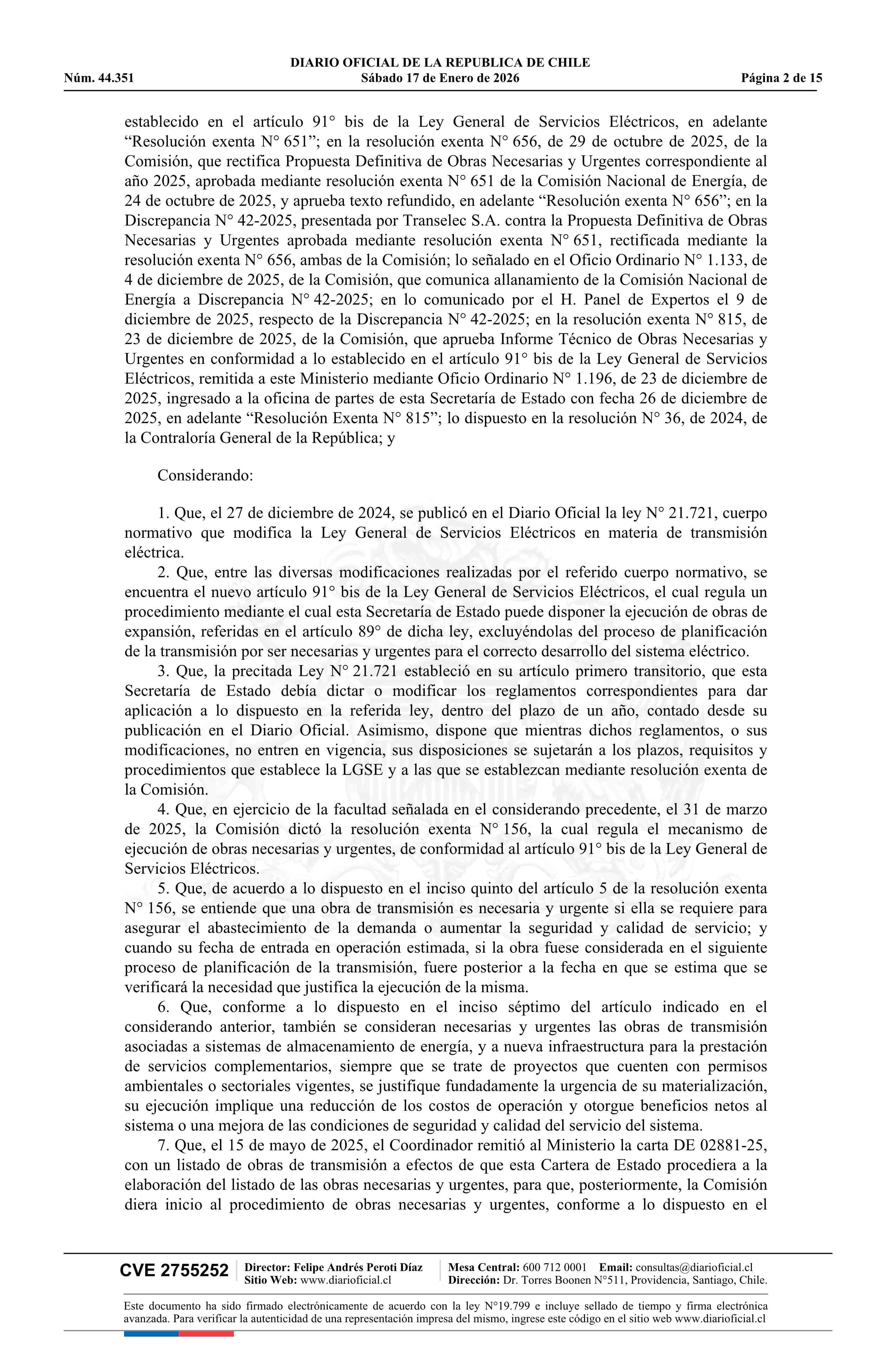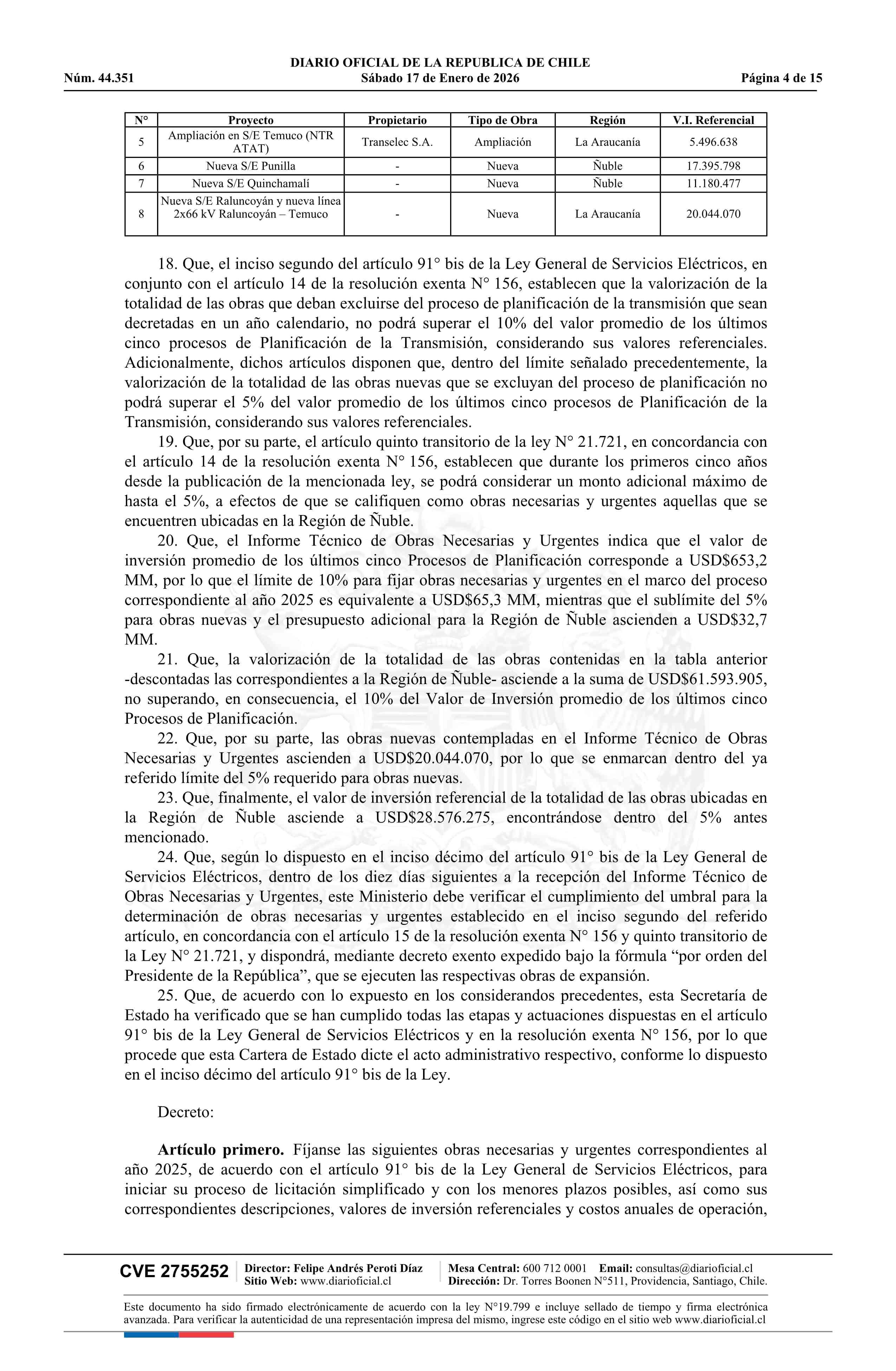 Título: Decreto exento número 10, de 2026.- Fija obras necesarias y urgentes correspondientes al año 2025, de acuerdo con el artículo 91° bis de la Ley General de Servicios Eléctricos, para iniciar su proceso de licitación