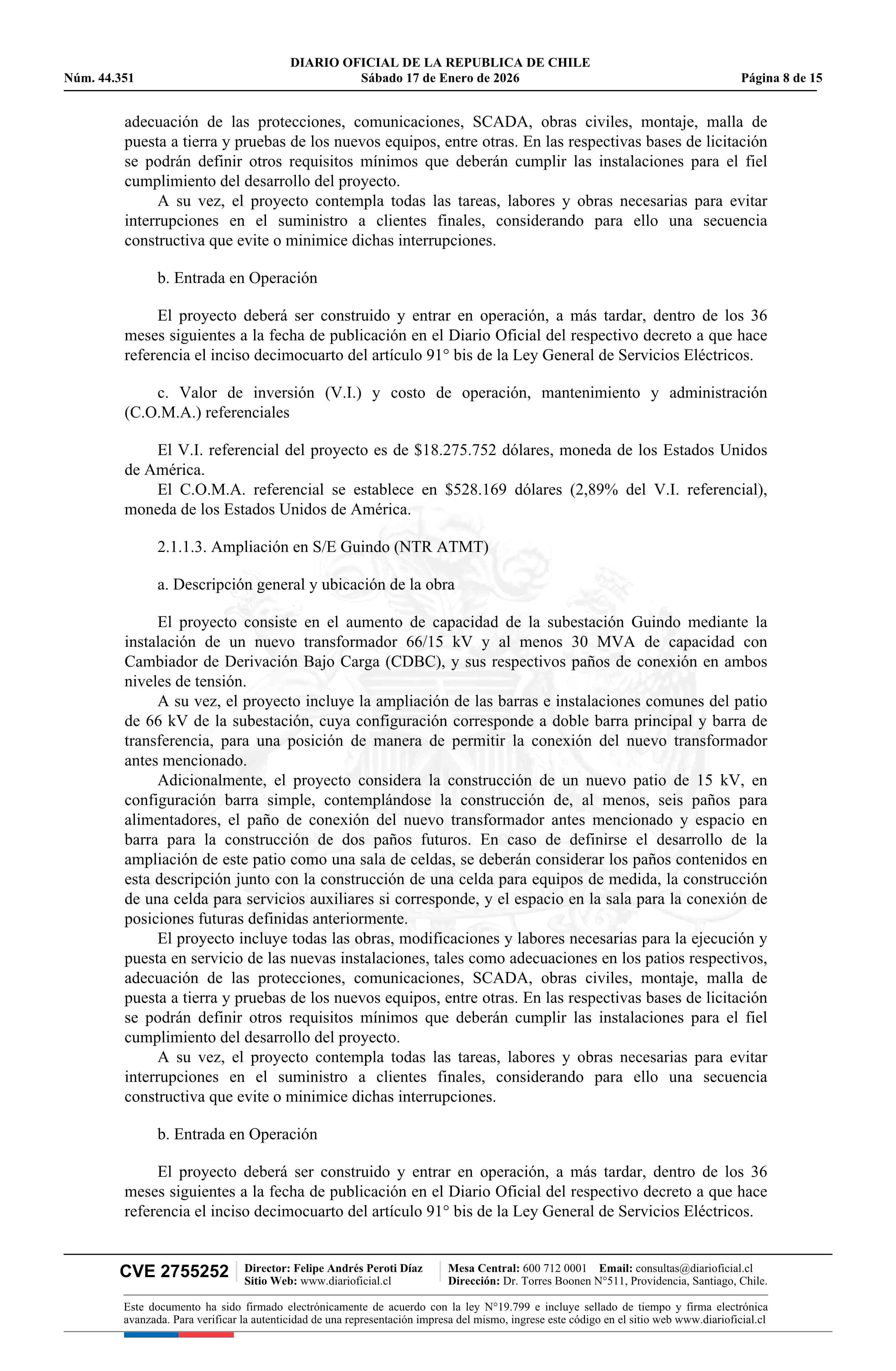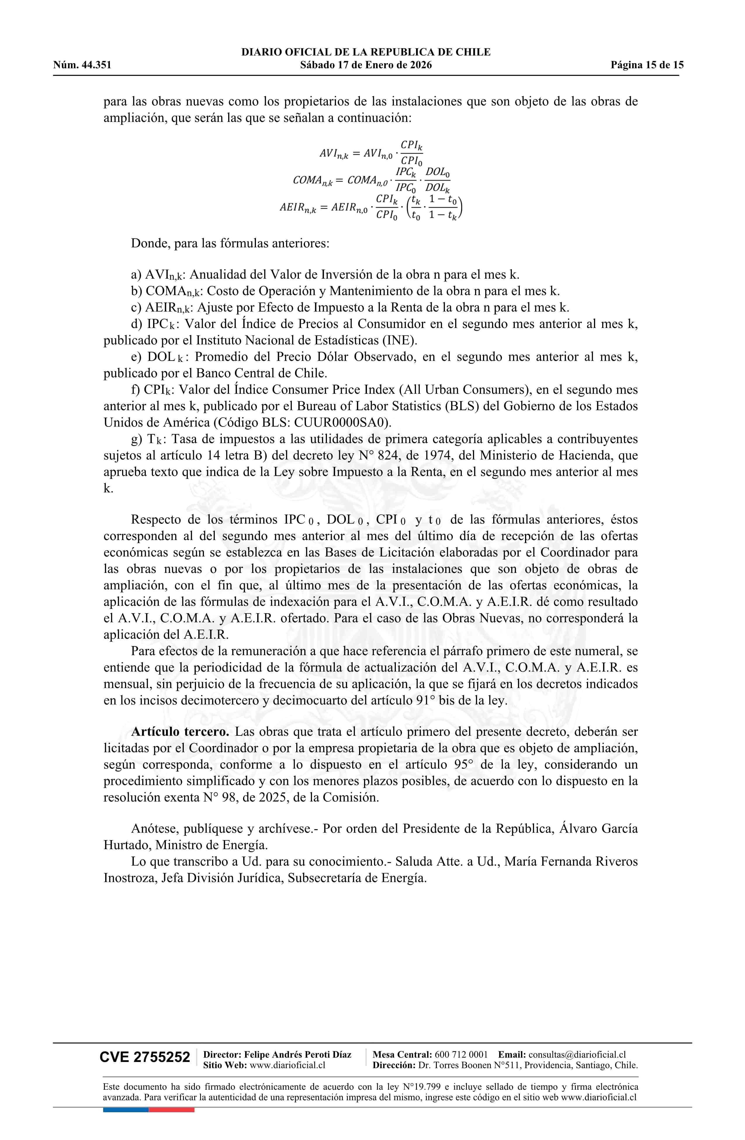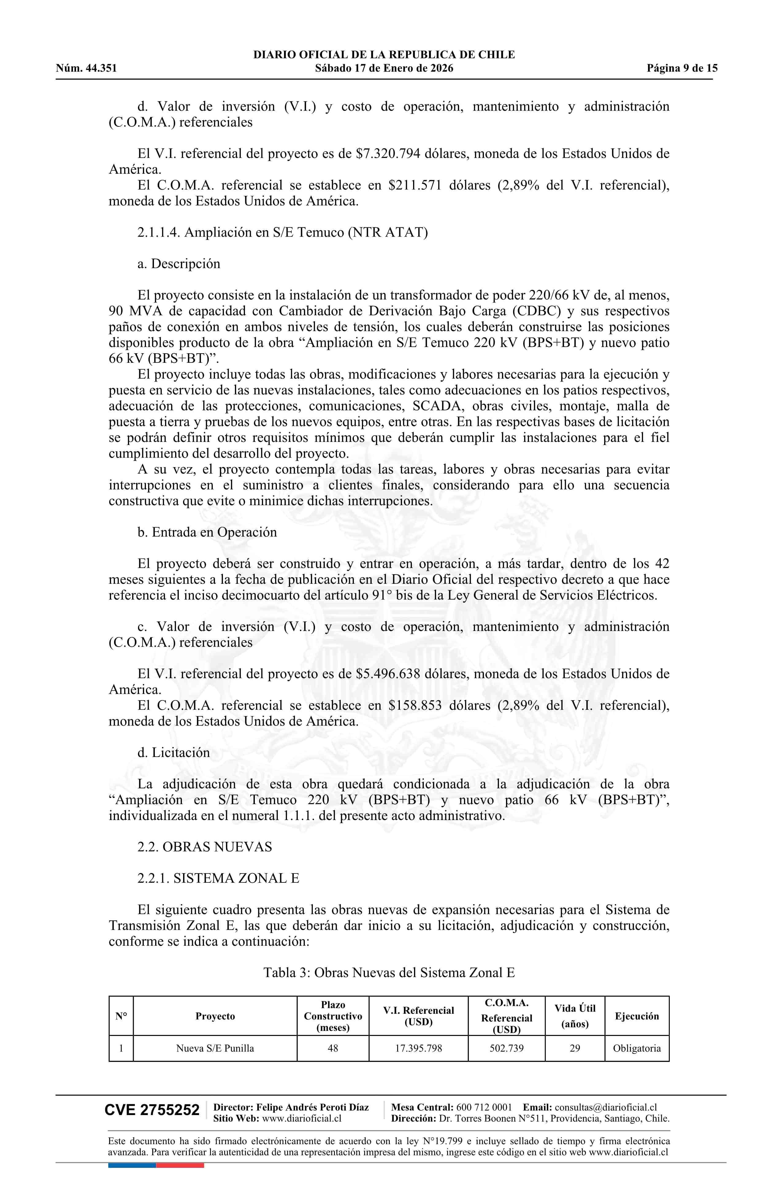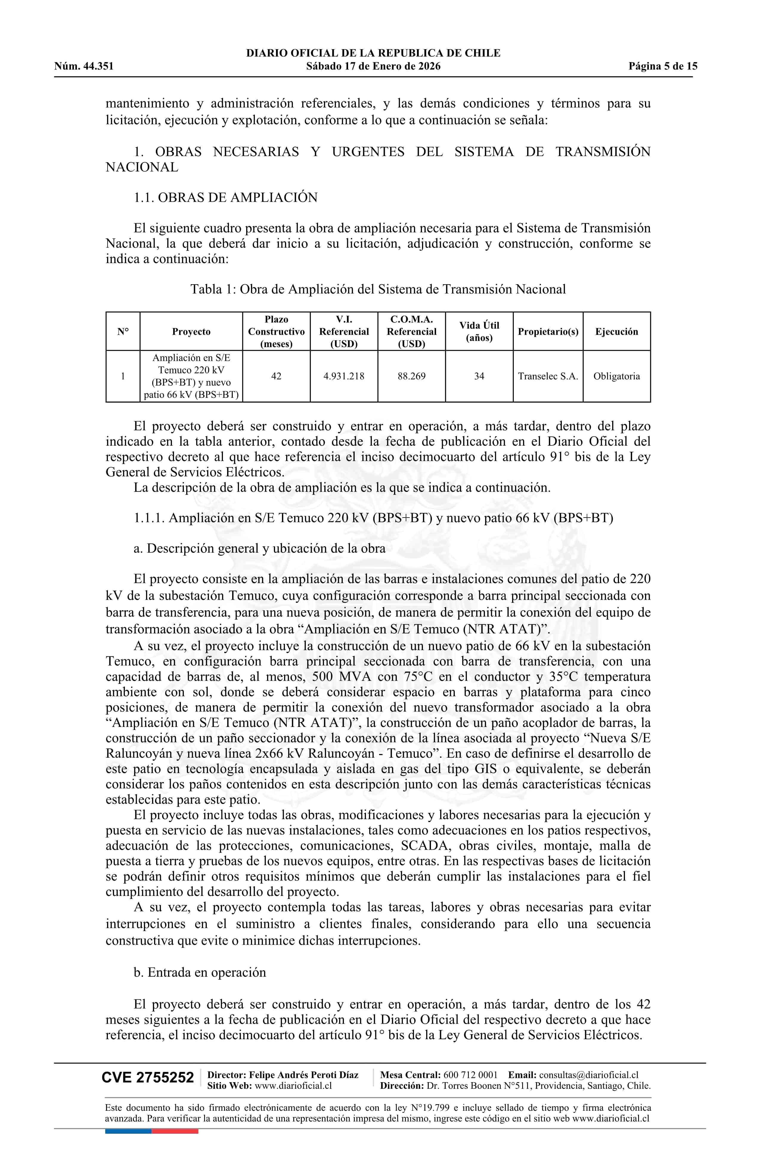 Título: Decreto exento número 10, de 2026.- Fija obras necesarias y urgentes correspondientes al año 2025, de acuerdo con el artículo 91° bis de la Ley General de Servicios Eléctricos, para iniciar su proceso de licitación