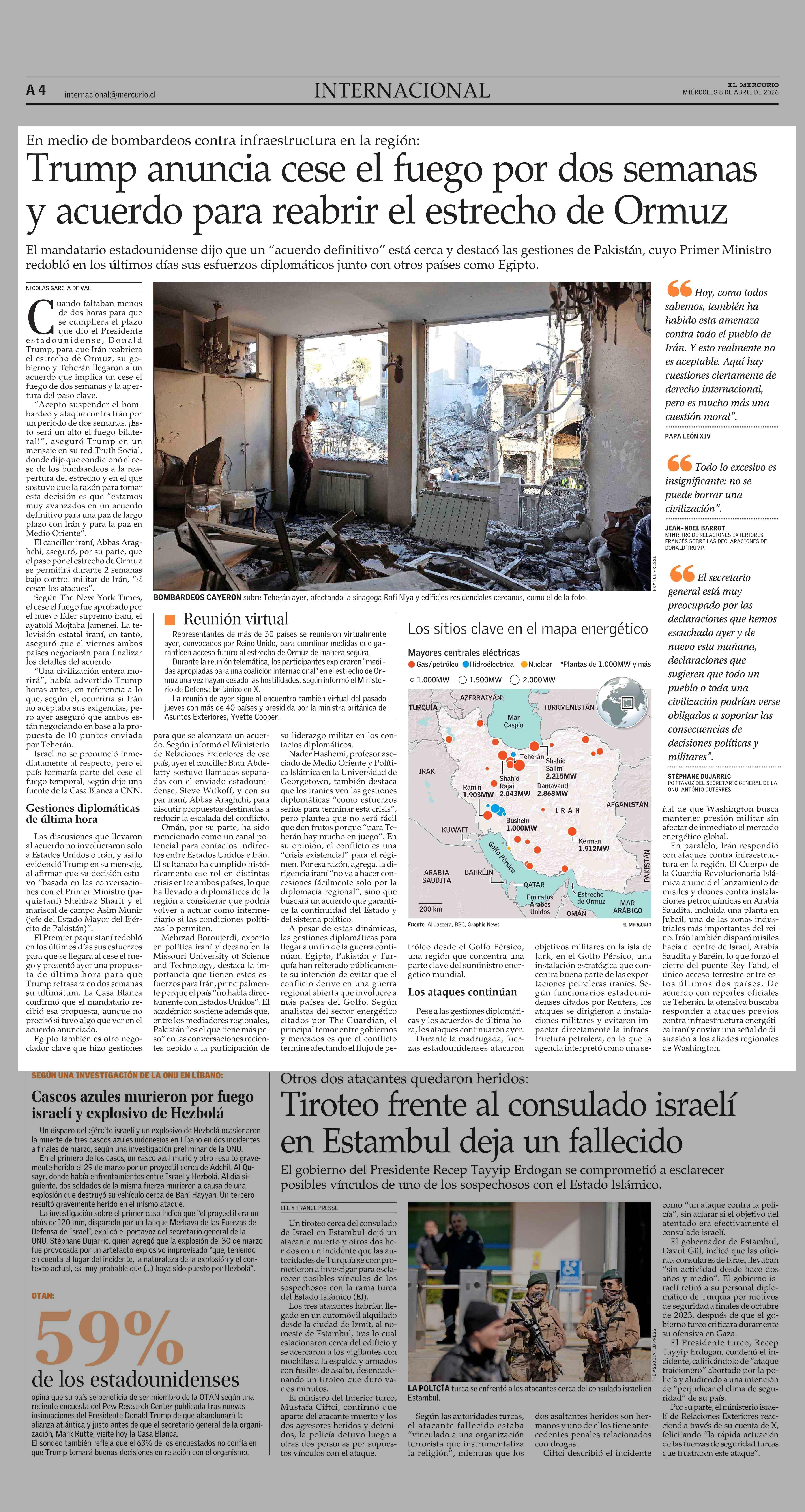 Trump anuncia cese el fuego por dos semanas y acuerdo para reabrir el estrecho de Ormuz 08-04-2026 El Mercurio |