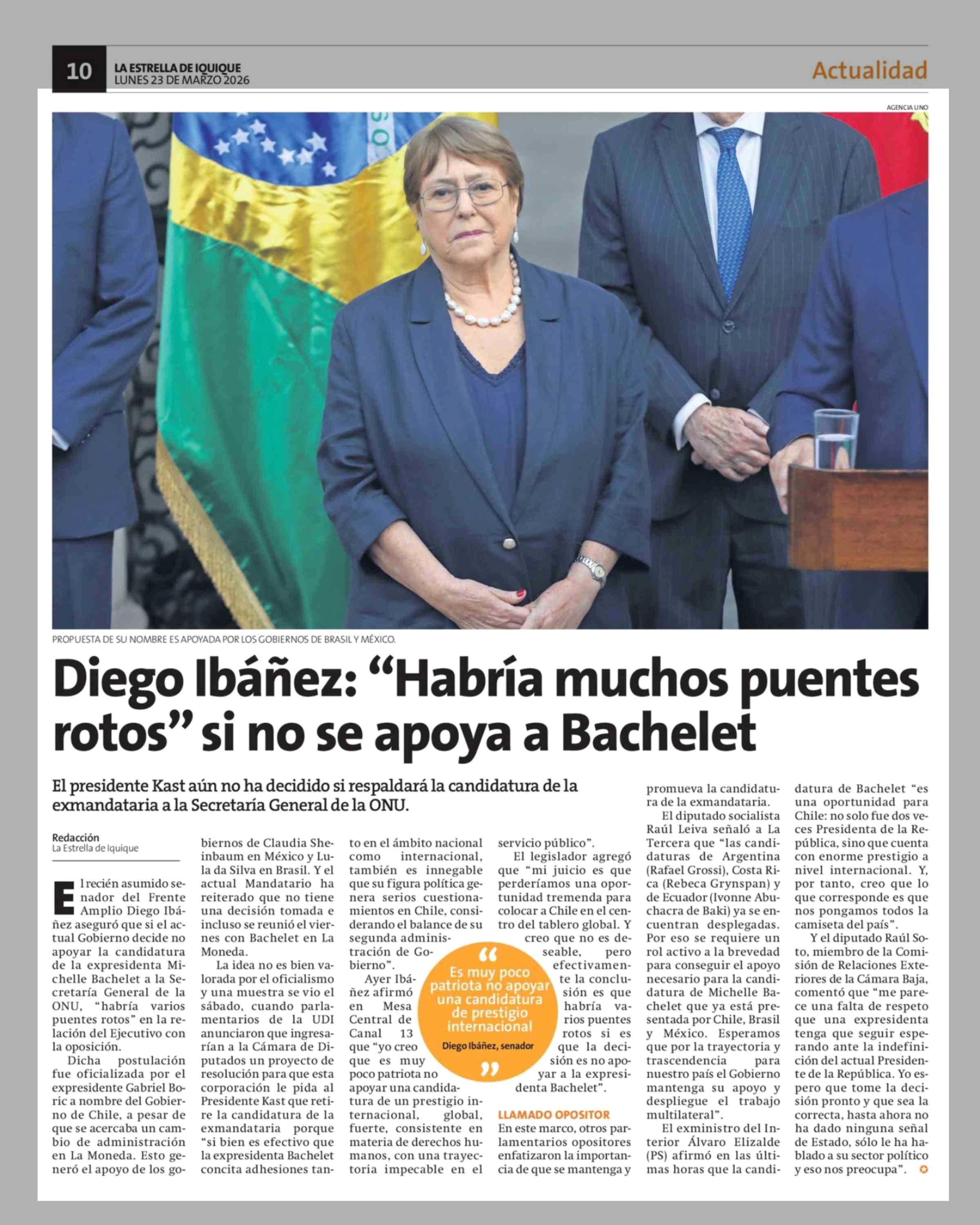 Diego Ibáñez: "Habría muchos puentes rotos" si no se apoya a Bachelet 23-03-2026 La Estrella de Iquique |