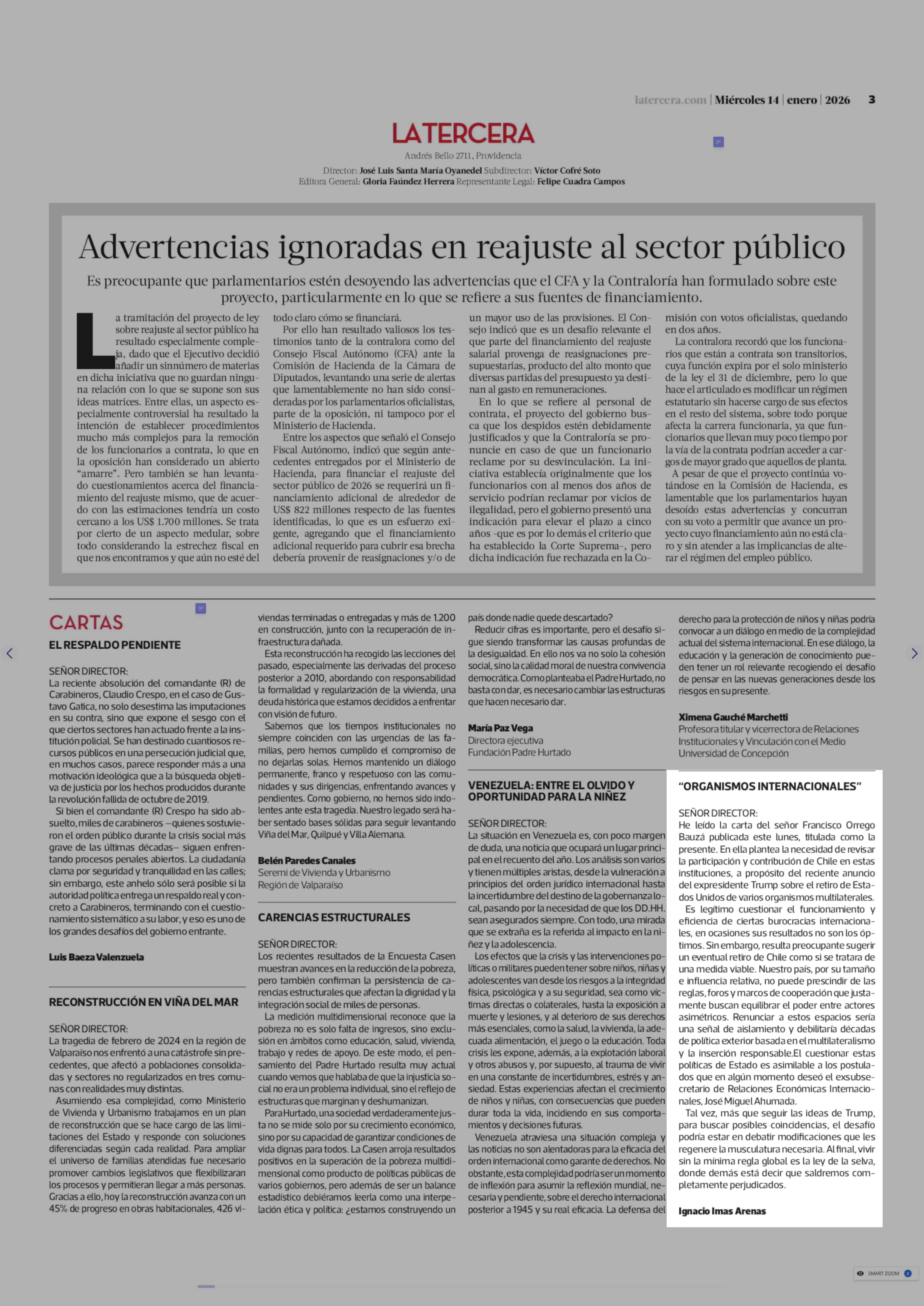 Cartas: "ORGANISMOS INTERNACIONALES" 14-01-2026 La Tercera |