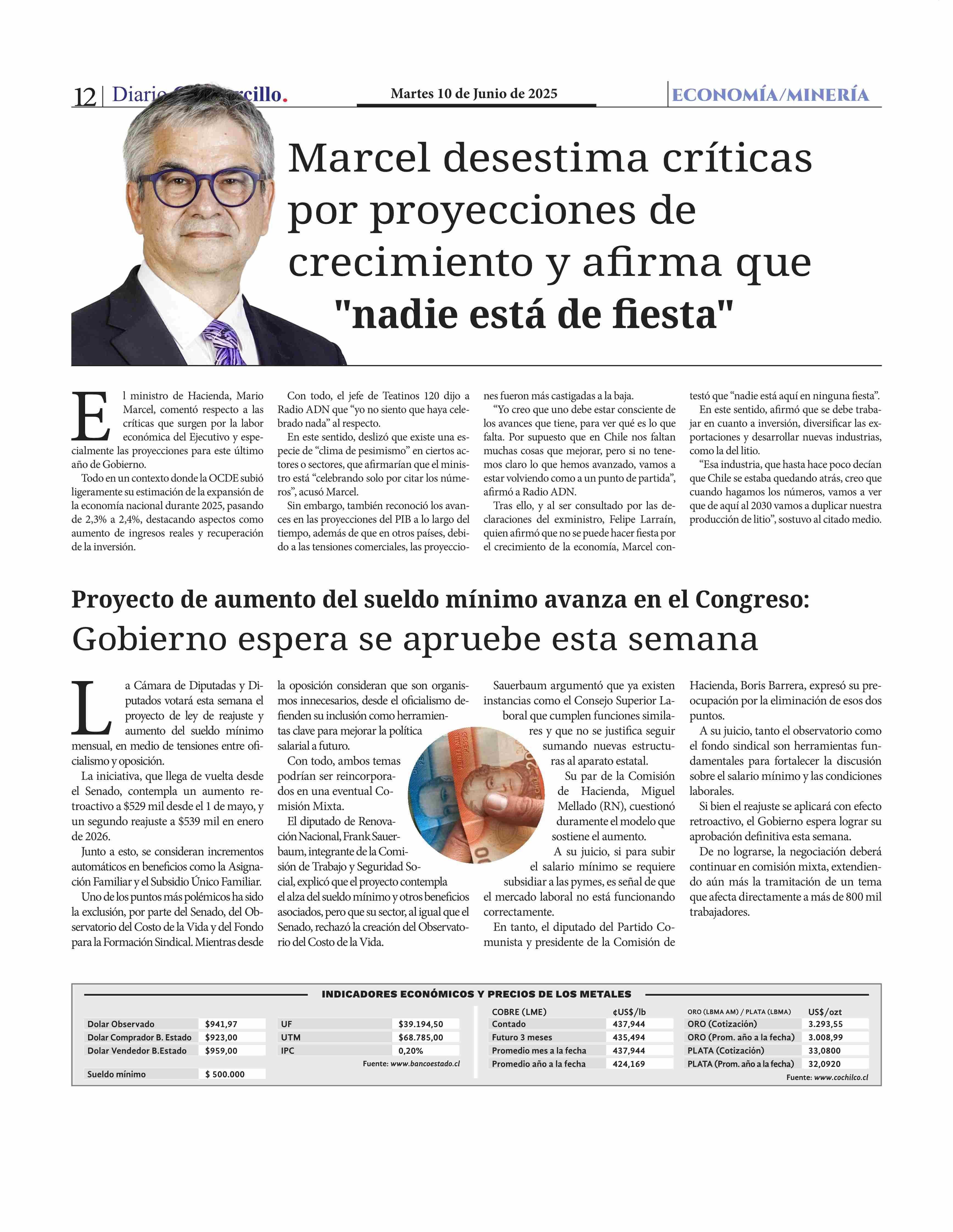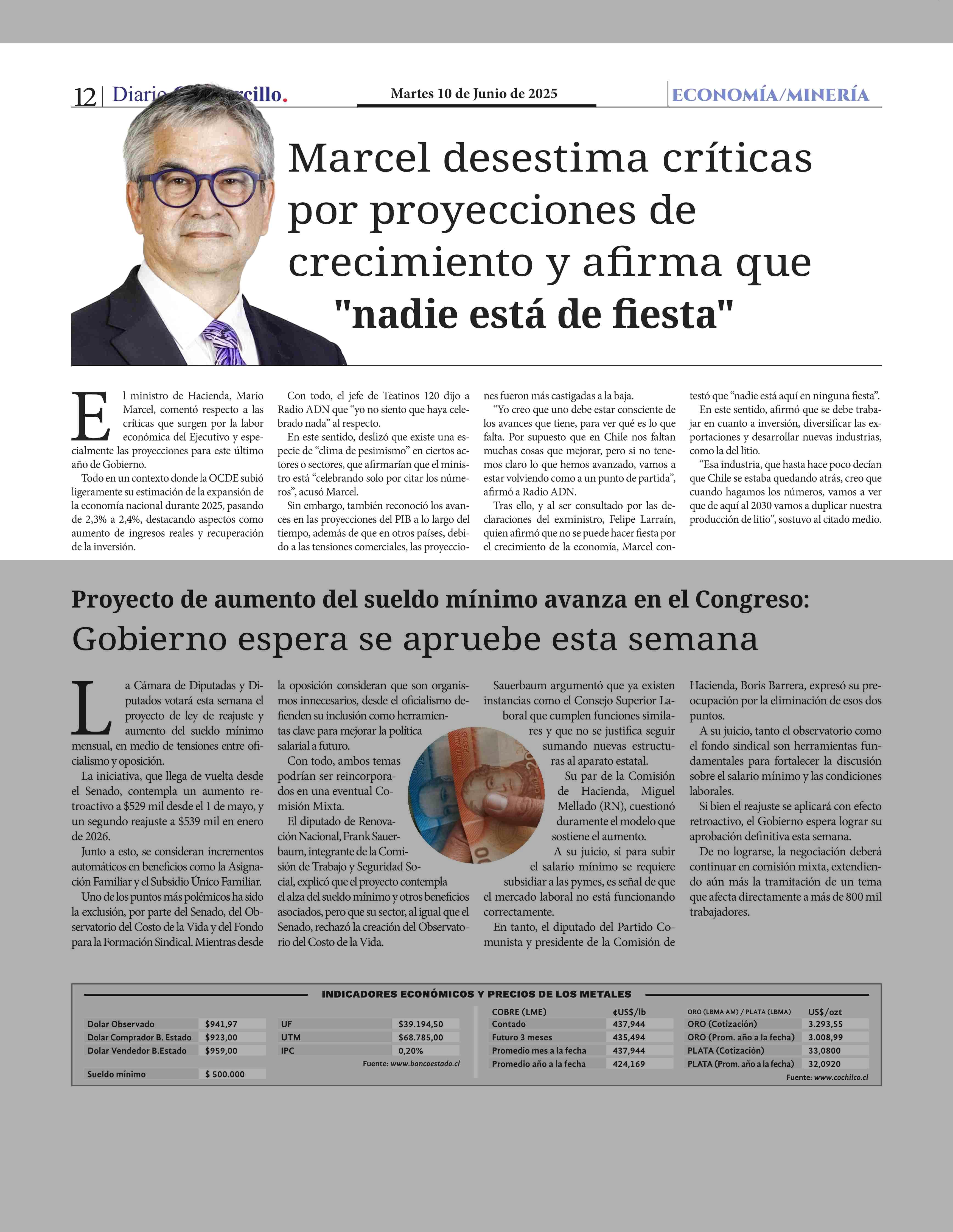 Marcel desestima críticas por proyecciones de crecimiento y afirma que "nadie está de fiesta" 10-06-2025 Diario Chañarcillo |