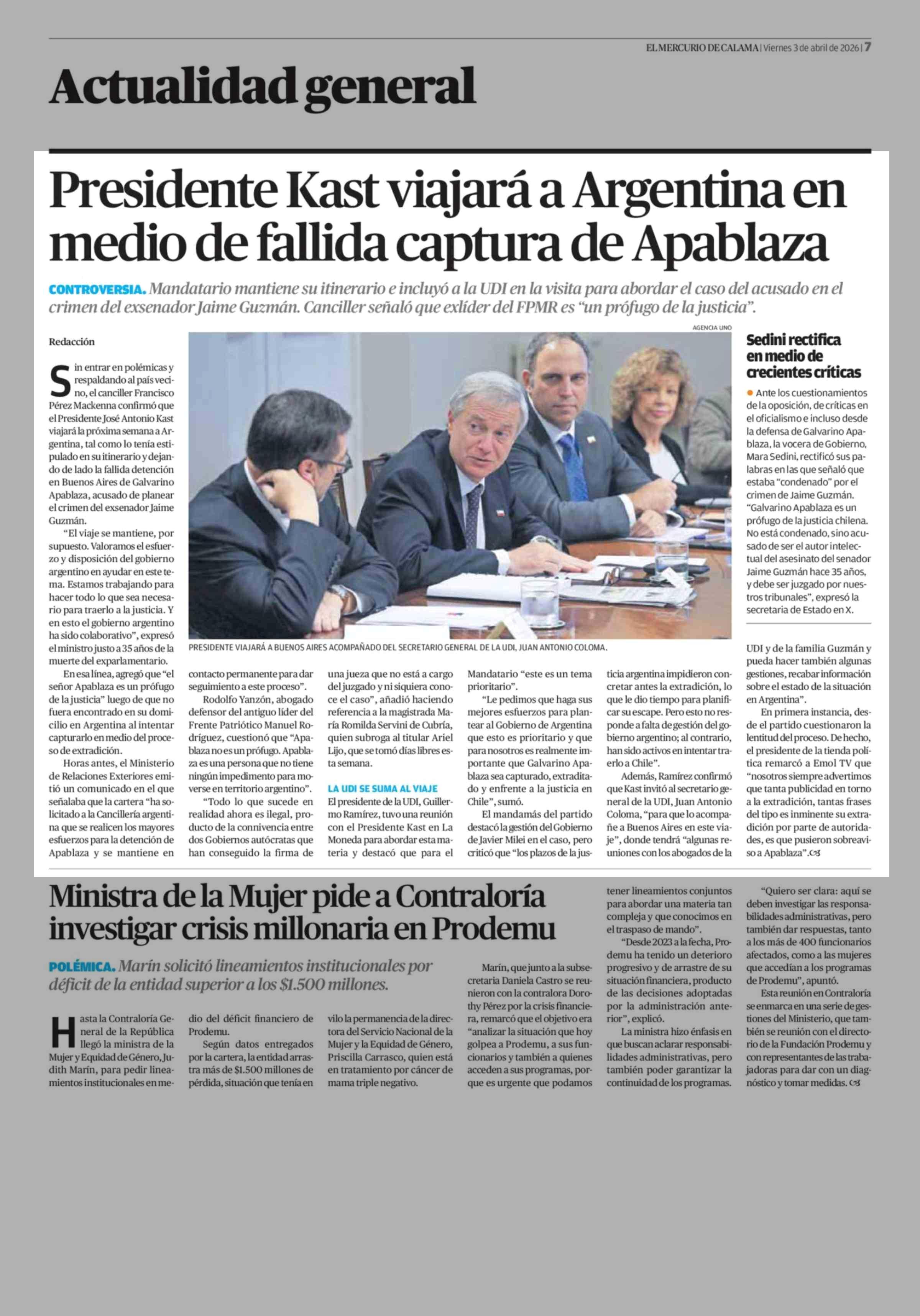Presidente Kast viajará a Argentina en medio de fallida captura de Apablaza 03-04-2026 El Mercurio de Calama |