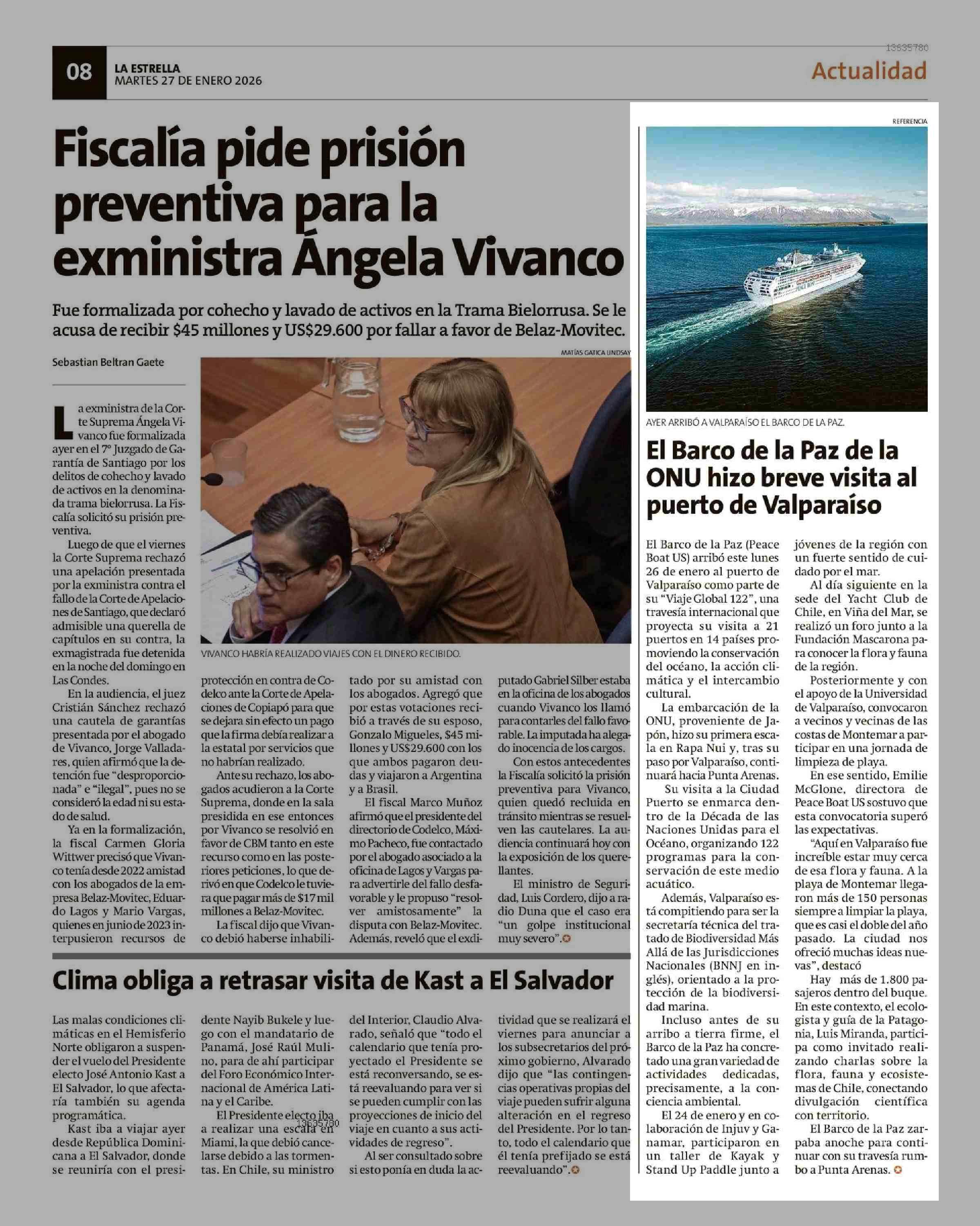 El Barco de la Paz de la ONU hizo breve visita al puerto de Valparaíso 27-01-2026 La Estrella de Valparaíso |