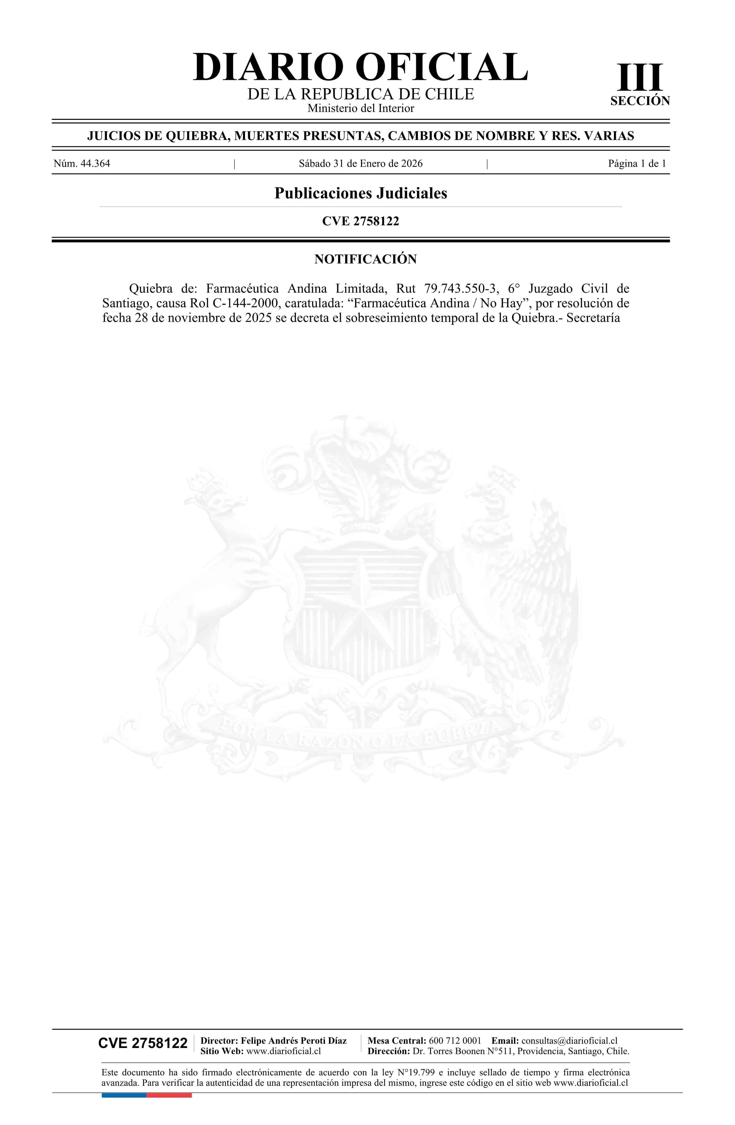 Farmacéutica Andina Limitada 31-01-2026 Diario Oficial Edición Electrónica |