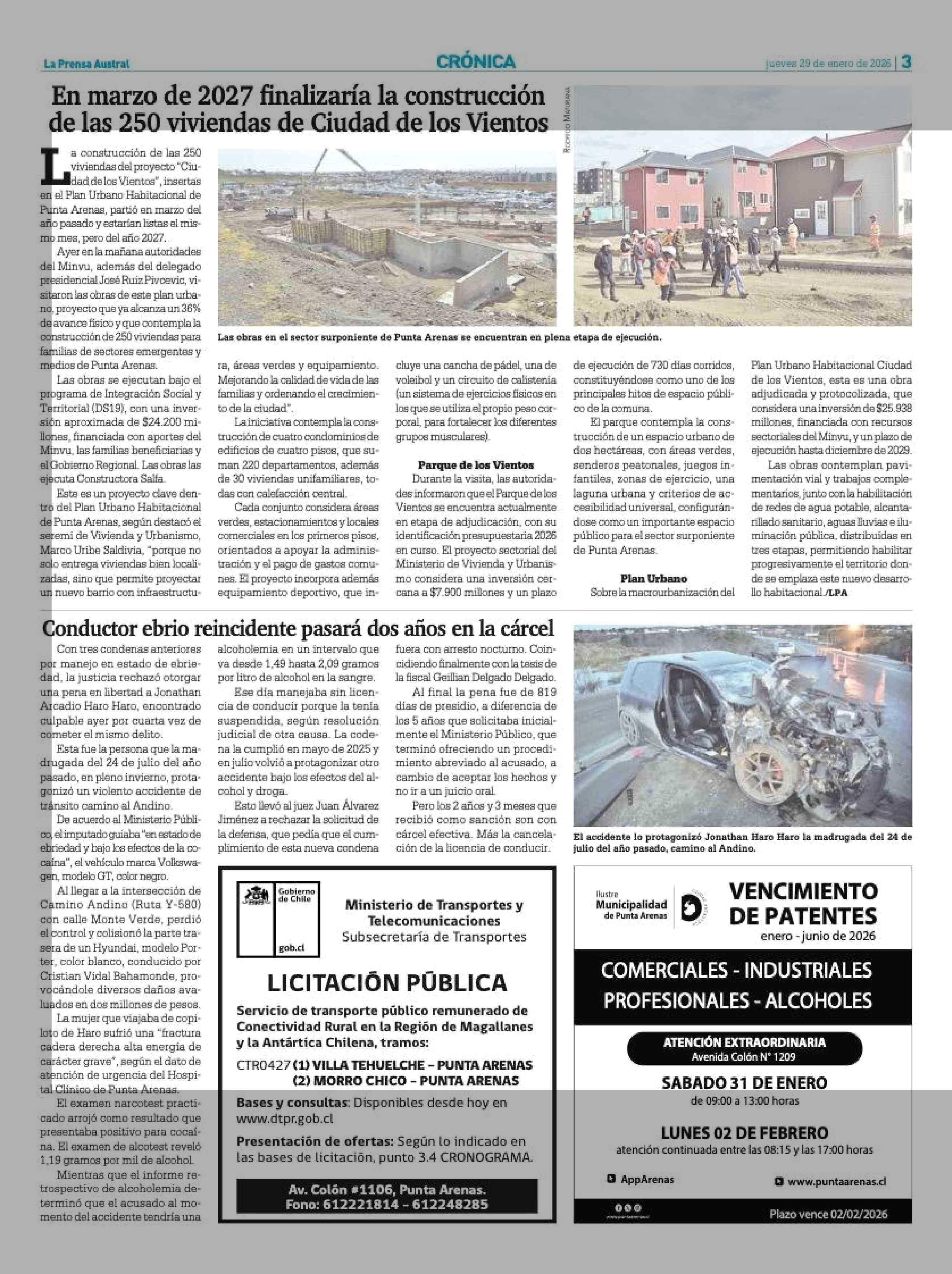 En marzo de 2027 finalizaría la construcción de las 250 viviendas de Ciudad de los Vientos 29-01-2026 La Prensa Austral |