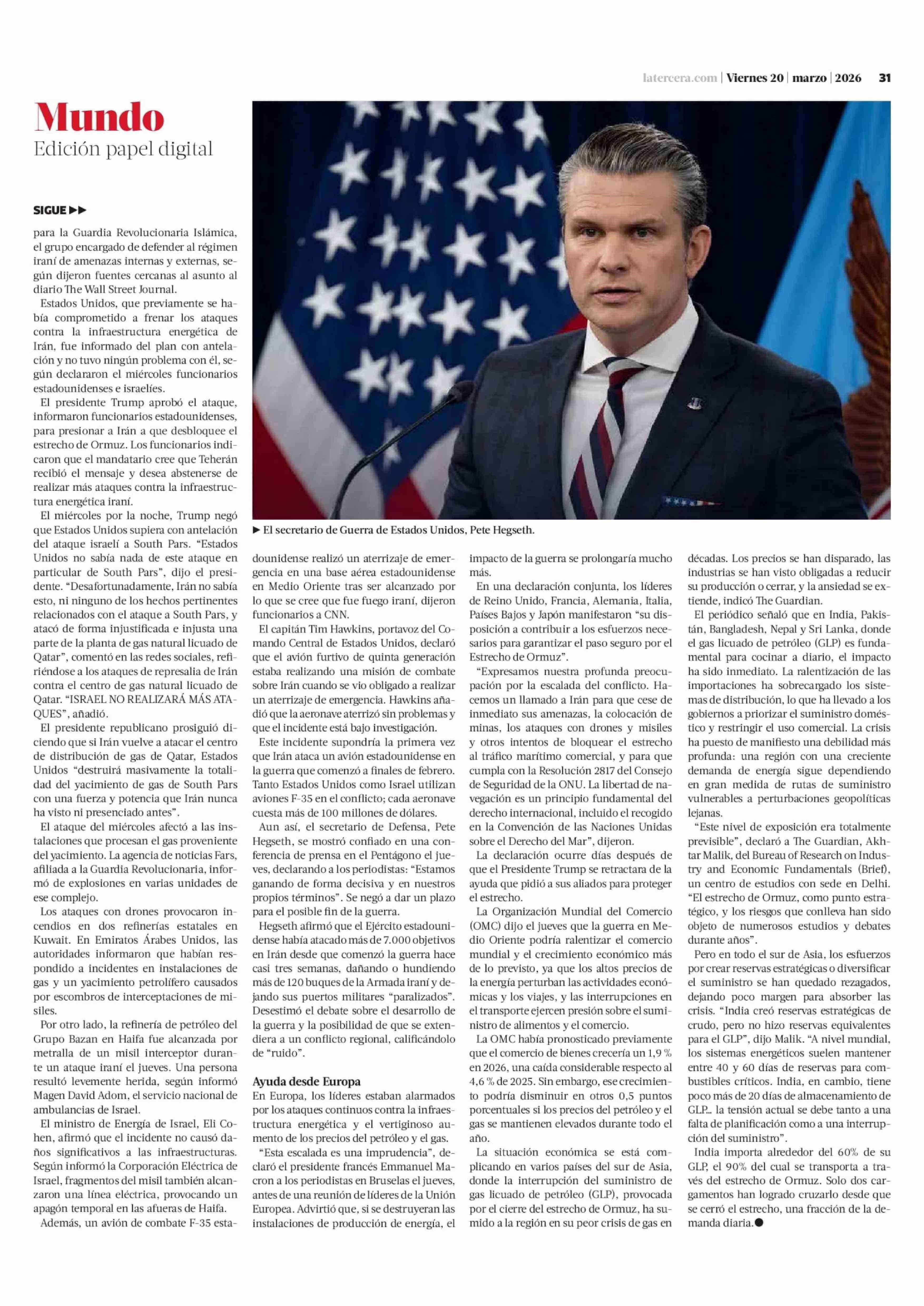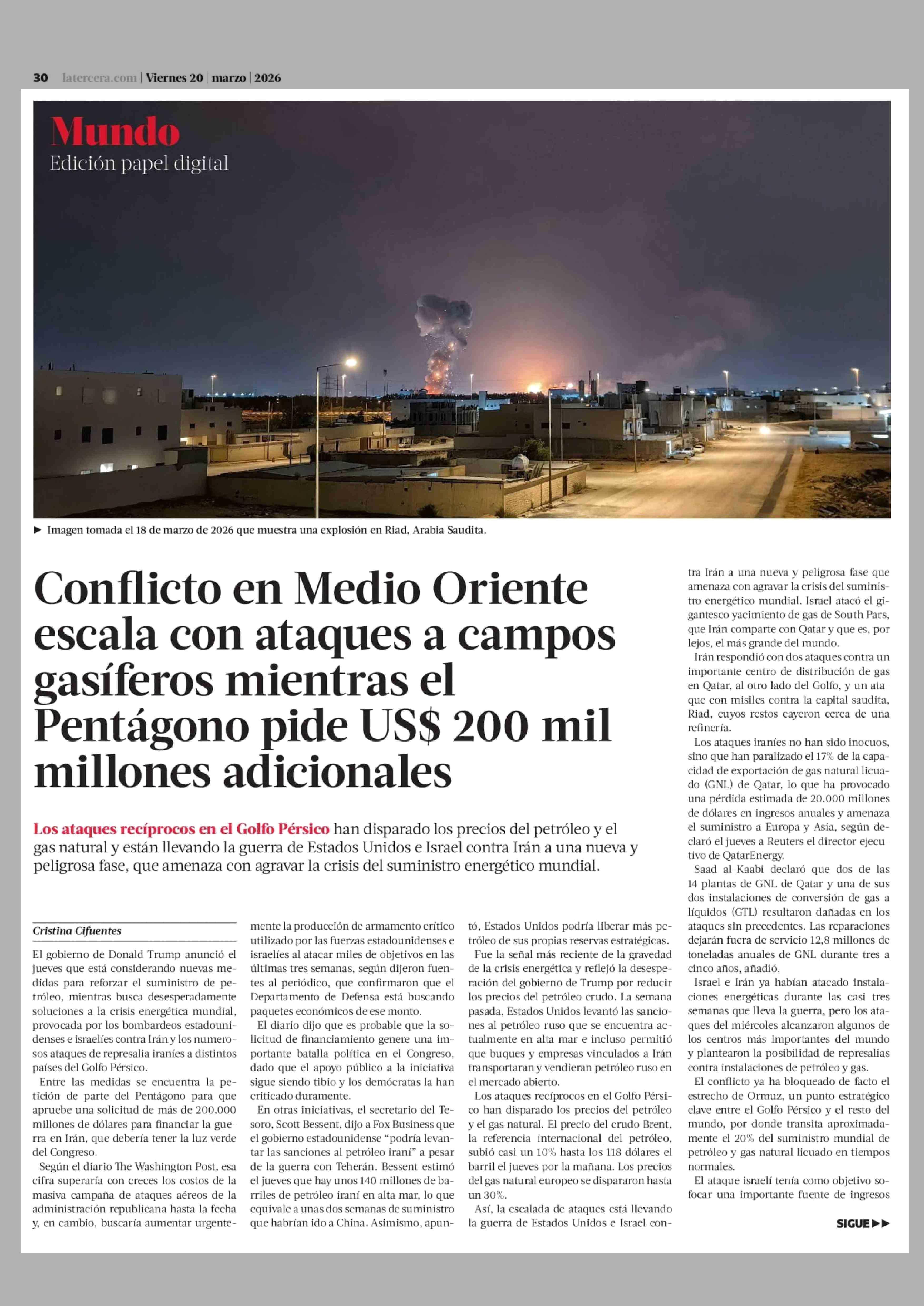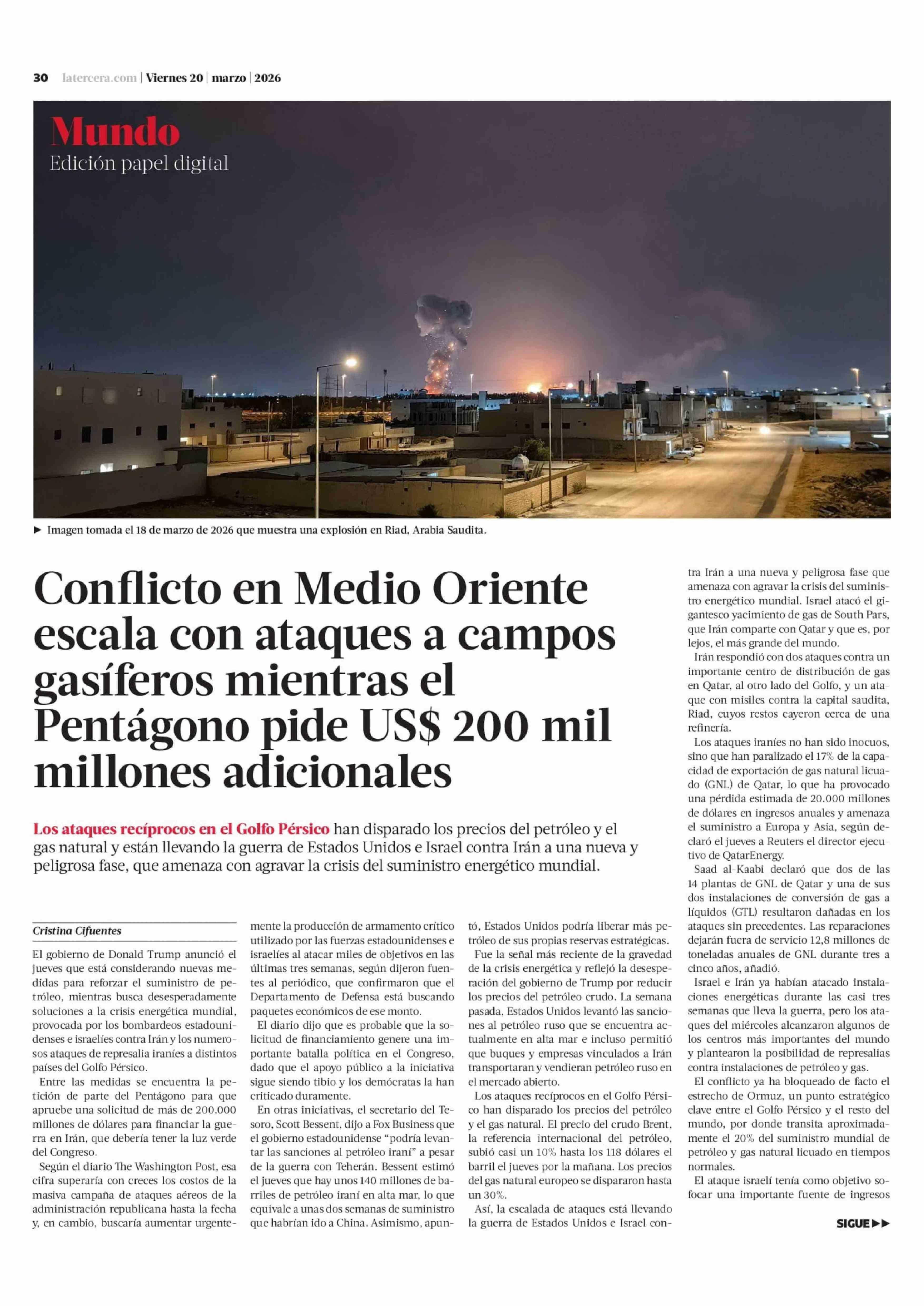 Conflicto en Medio Oriente escala con ataques a campos gasíferos mientras el Pentágono pide US$ 200 mil millones adicionales 20-03-2026 La Tercera |