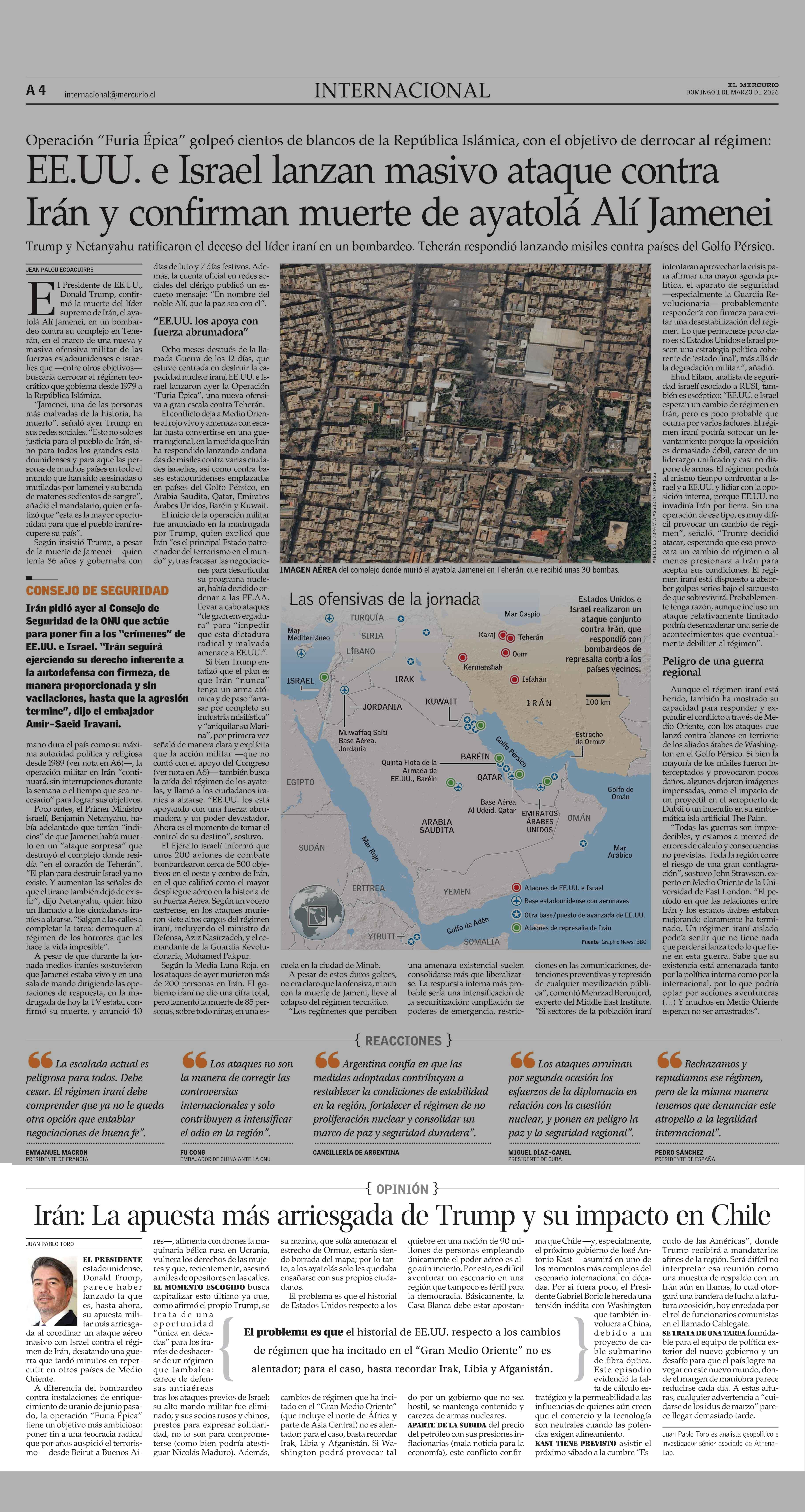 COLUMNAS DE OPINIÓN: Irán: La apuesta más arriesgada de Trump y su impacto en Chile 01-03-2026 El Mercurio |