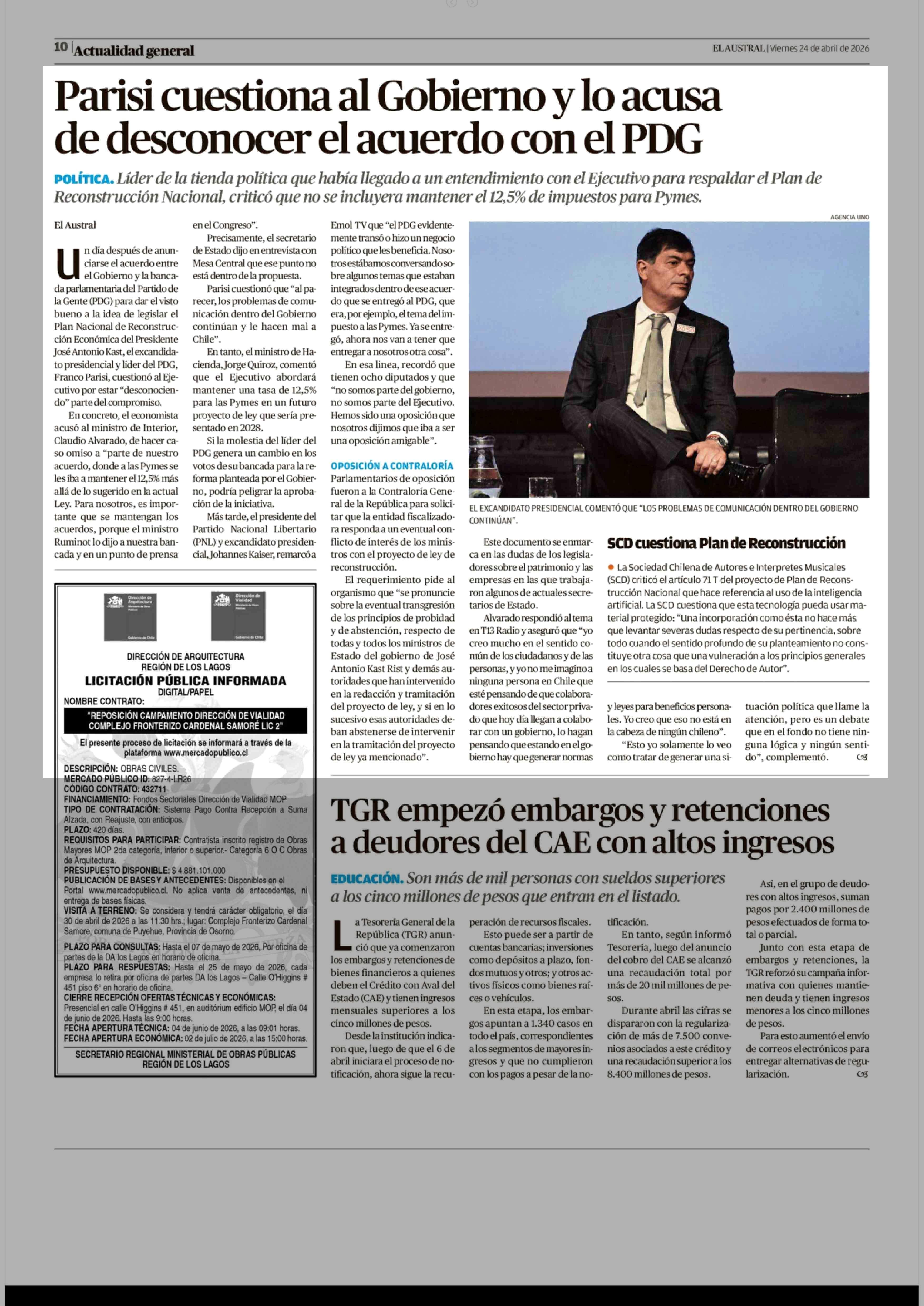 Parisi cuestiona al Gobierno y lo acusa de desconocer el acuerdo con el PDG 24-04-2026 El Austral de la Araucanía |