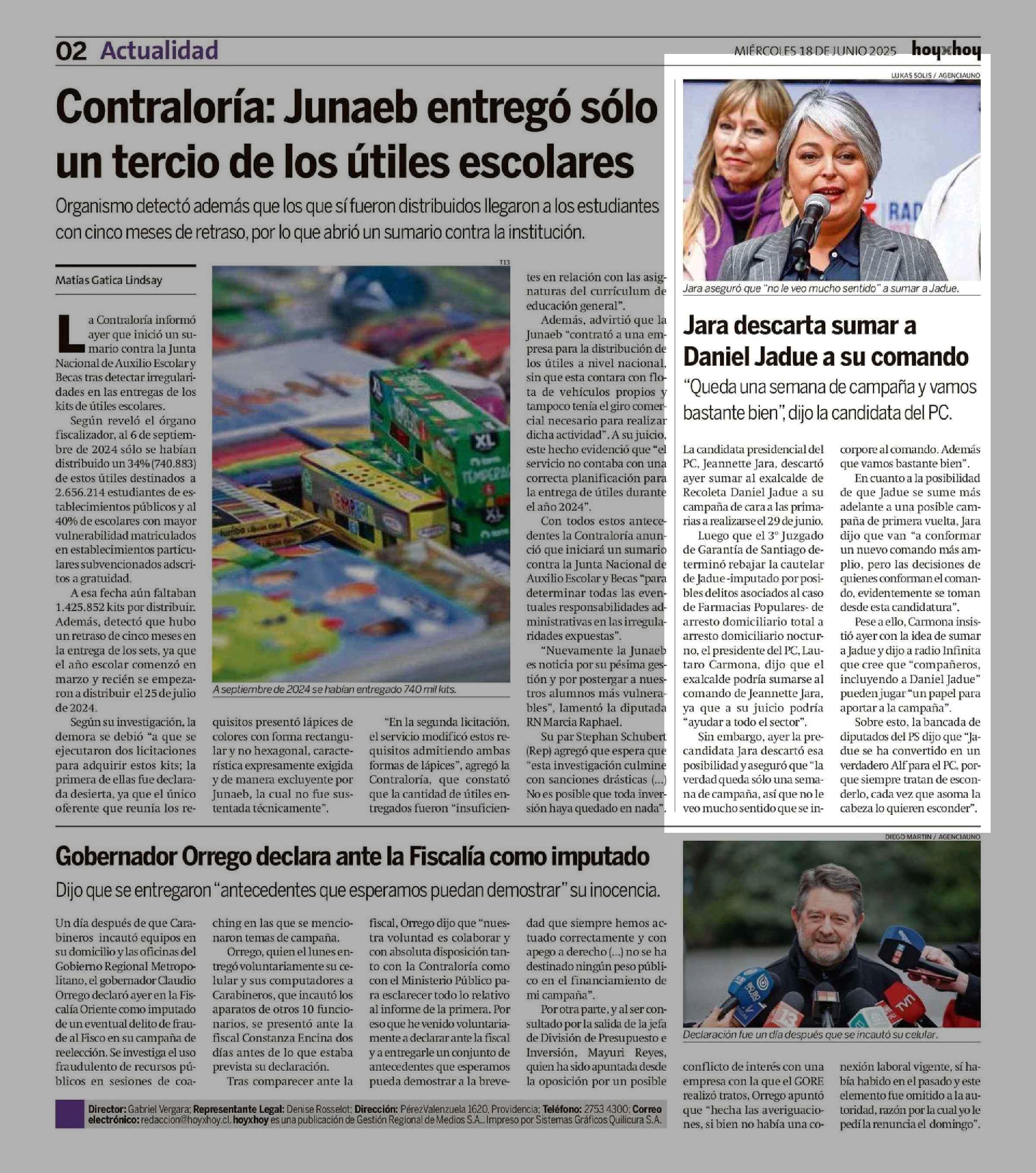 Jara descarta sumar a Daniel Jadue a su comando 18-06-2025 Hoy x Hoy |
