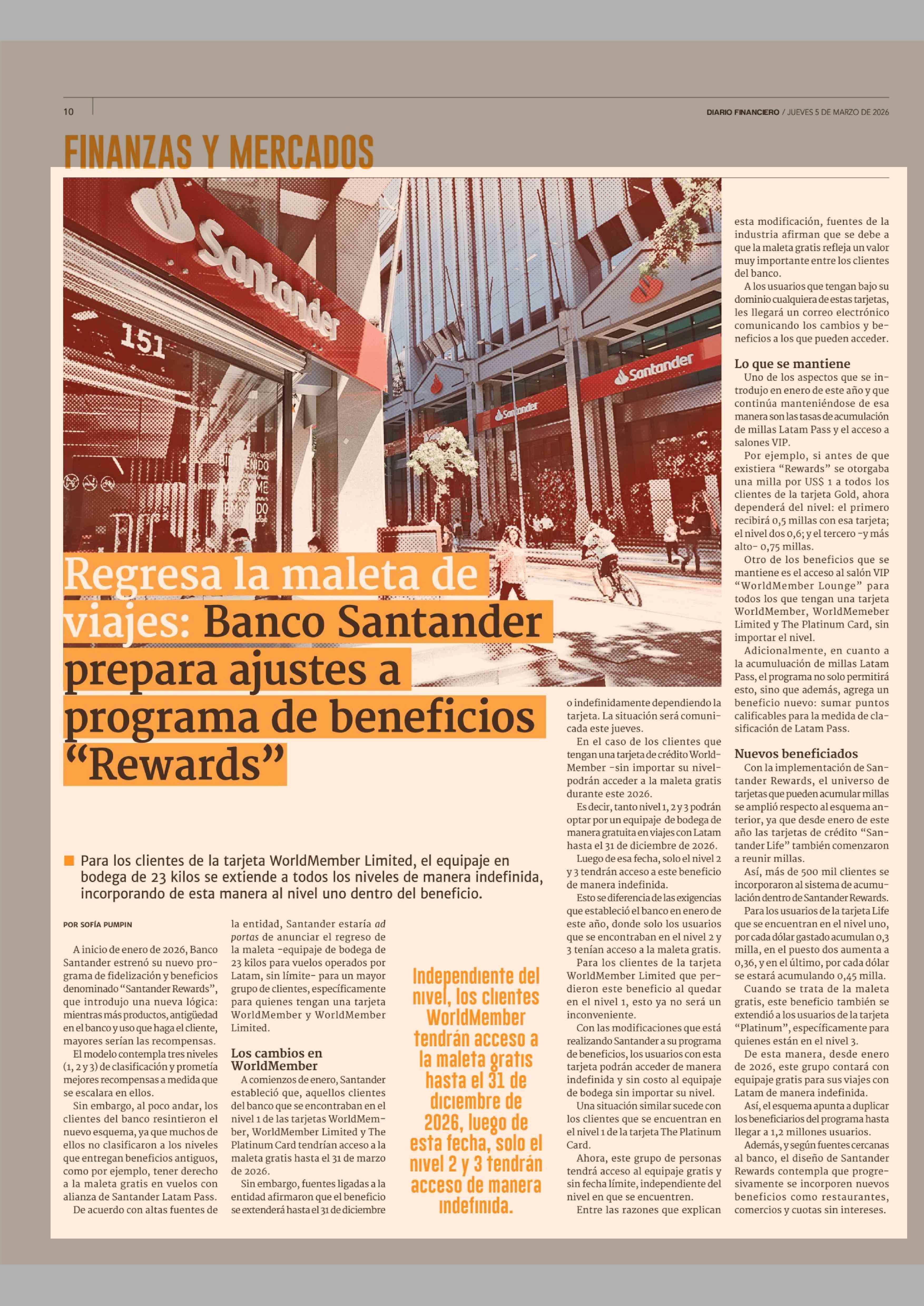 Regresa la maleta de viajes: Banco Santander prepara ajustes a programa de beneficios "Rewards" 05-03-2026 Diario Financiero |