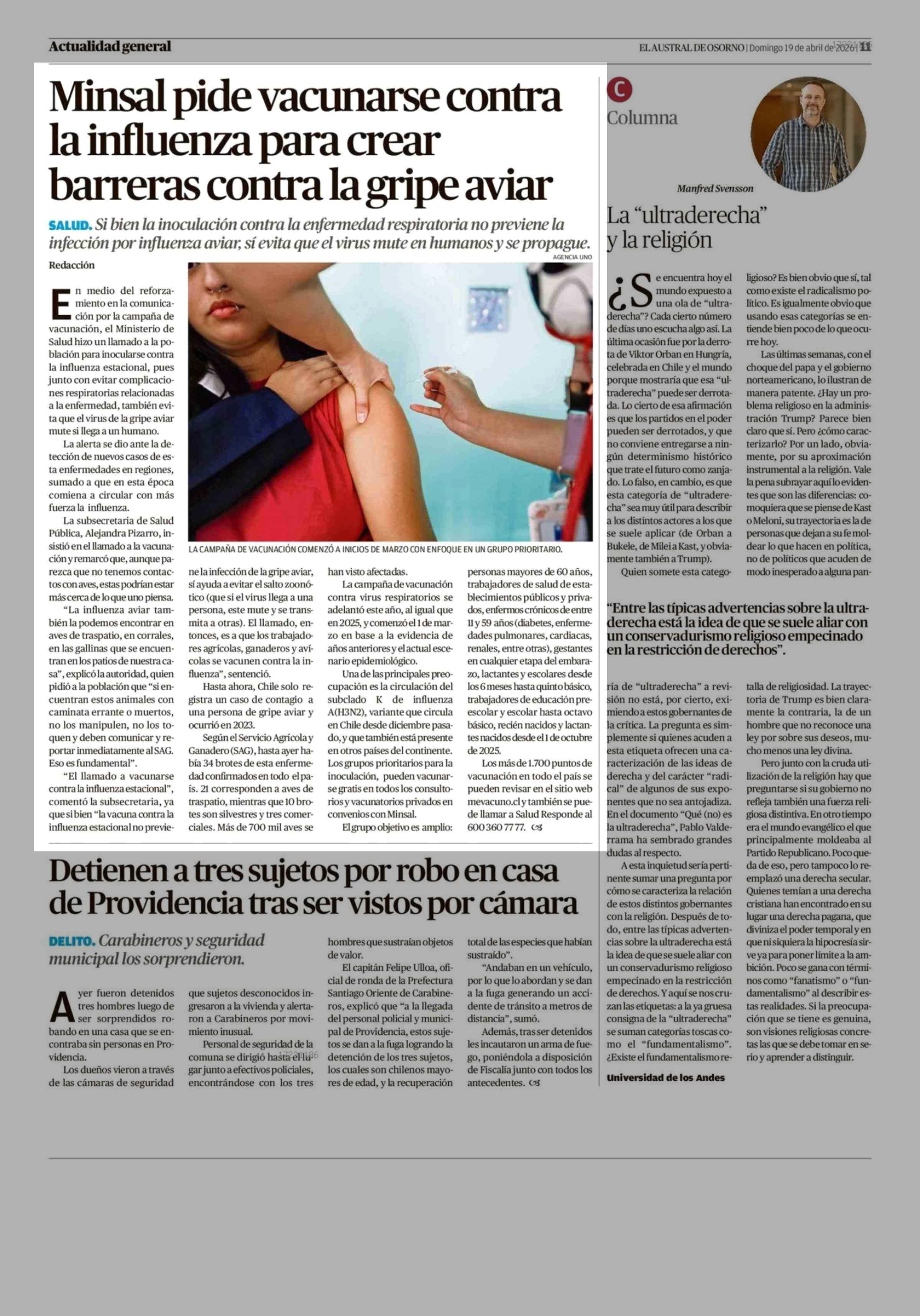 Minsal pide vacunarse contra la influenza para crear barreras contra la gripe aviar 19-04-2026 El Austral de Osorno |