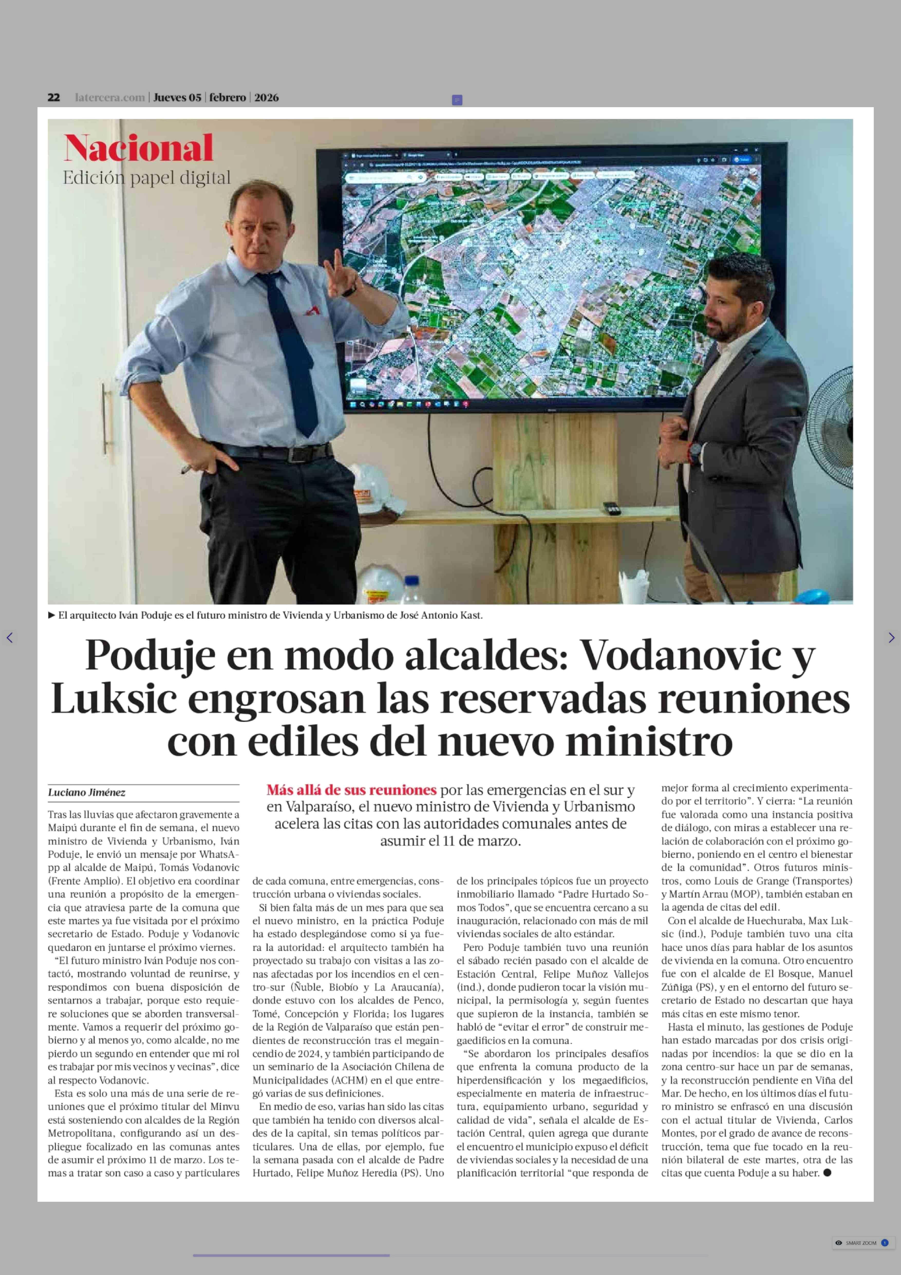 Poduje en modo alcaldes: Vodanovic y Luksic engrosan las reservadas reuniones con ediles del nuevo ministro 05-02-2026 La Tercera |