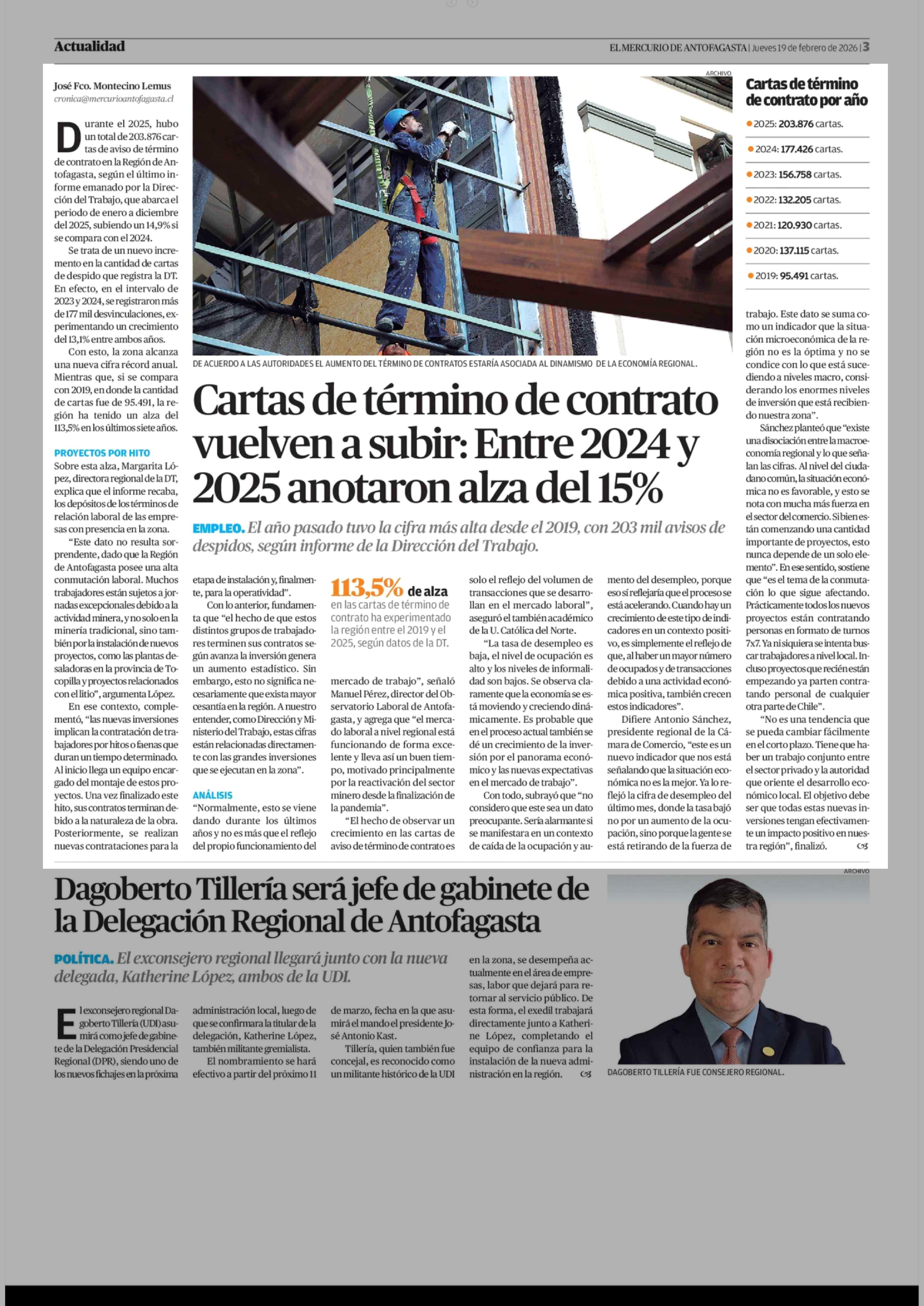 Cartas de término de contrato vuelven a subir: Entre 2024 y 2025 anotaron alza del 15% 19-02-2026 El Mercurio de Antofagasta |