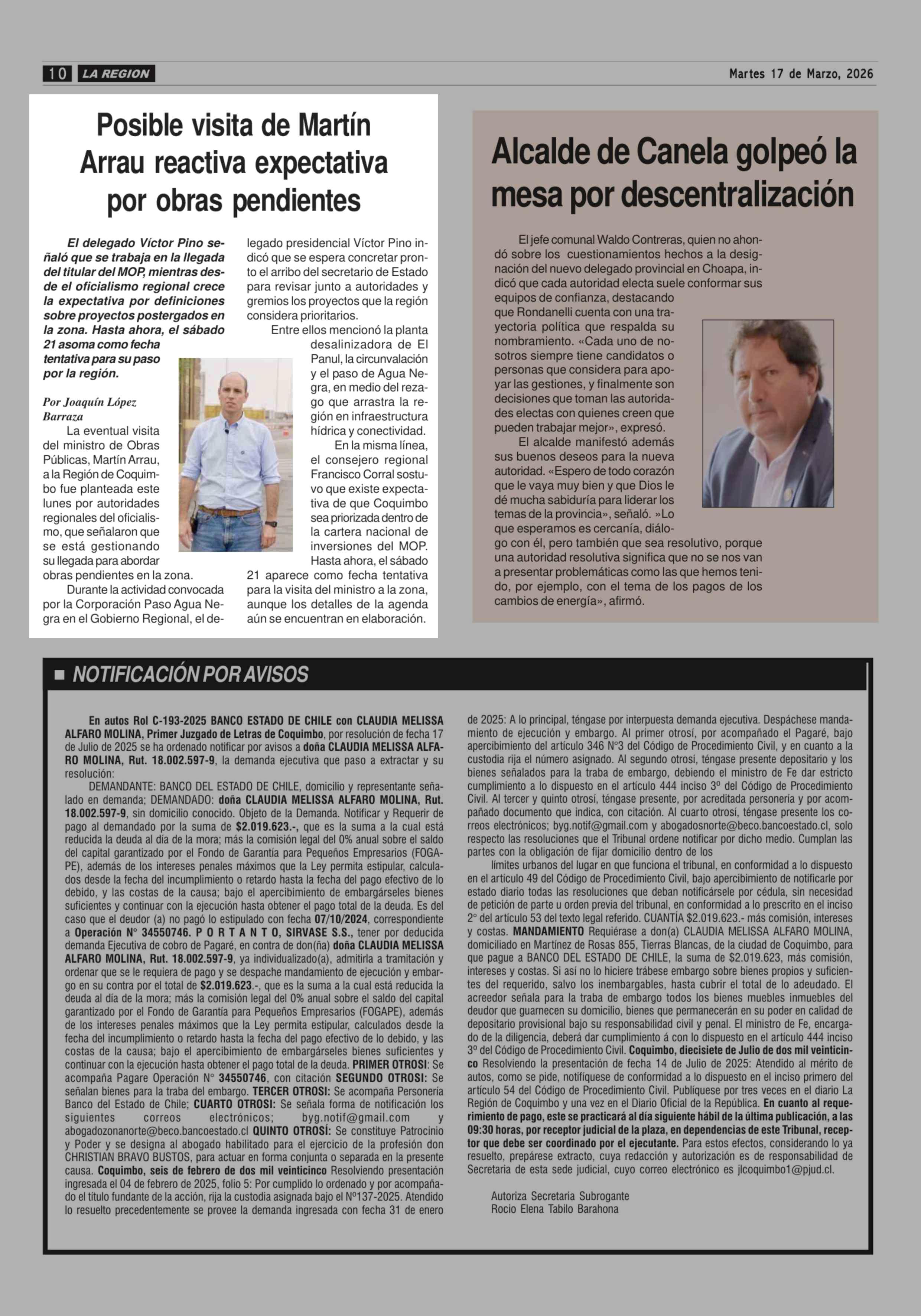 Posible visita de Martín Arrau reactiva expectativa por obras pendientes 17-03-2026 Diario la Región |