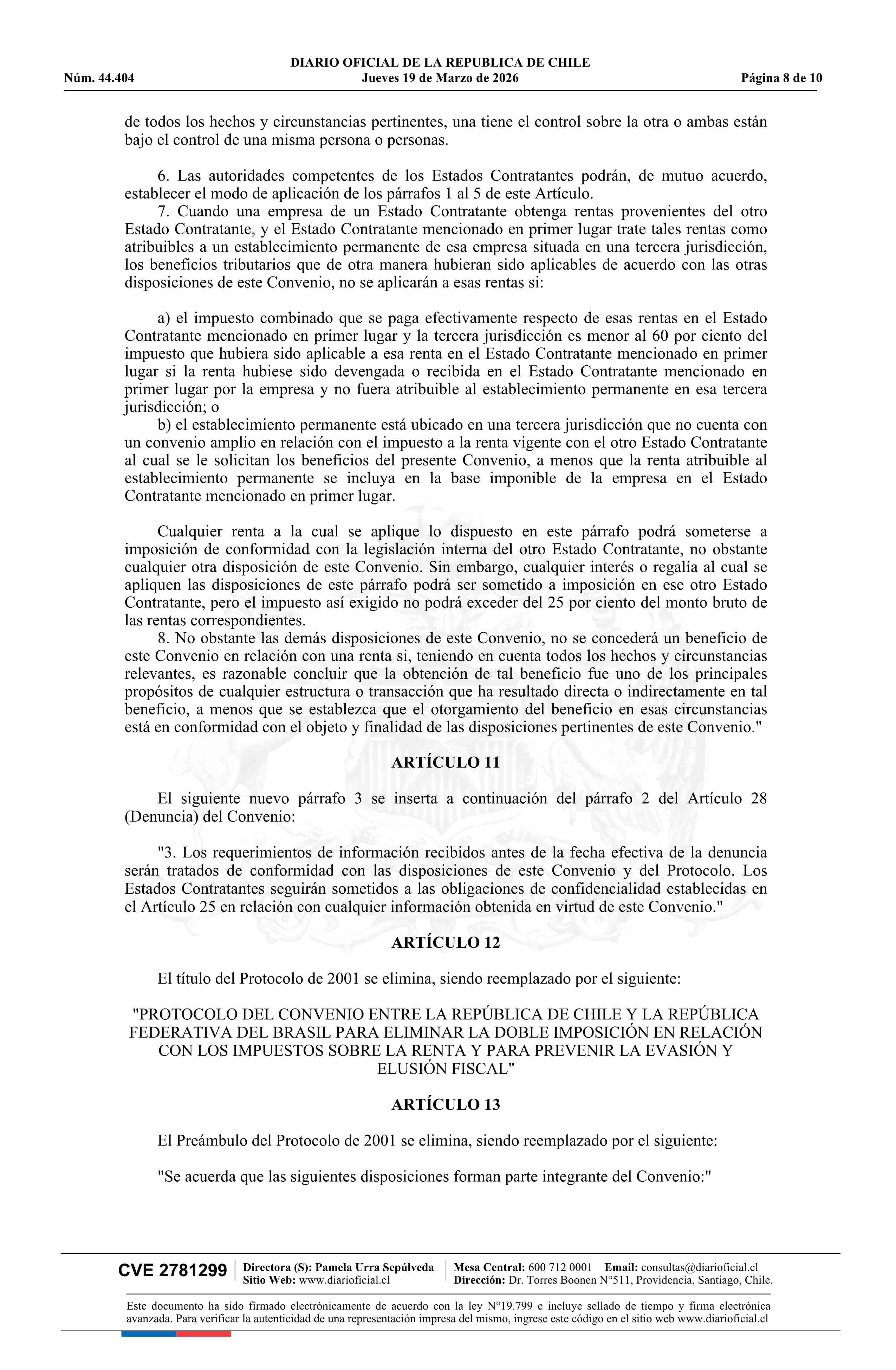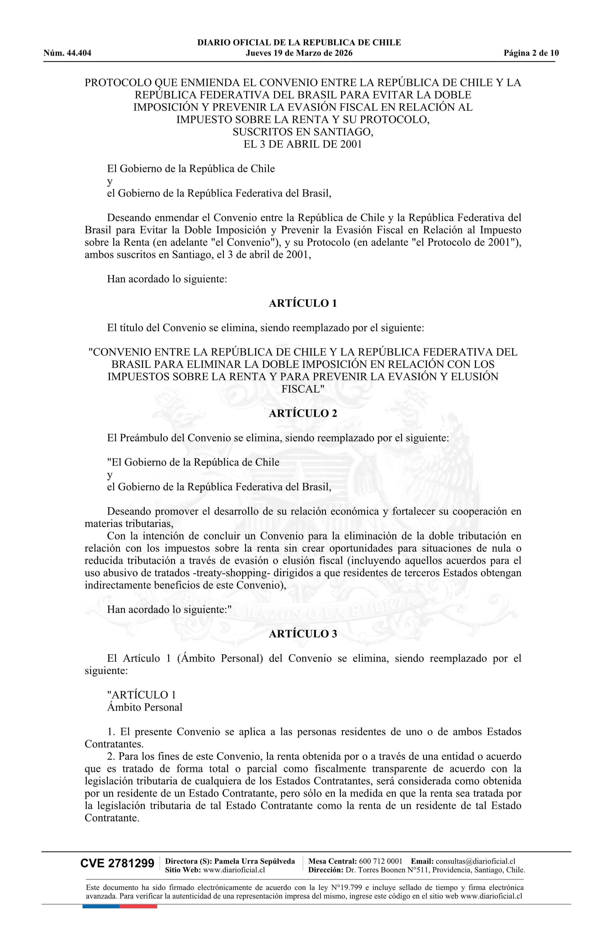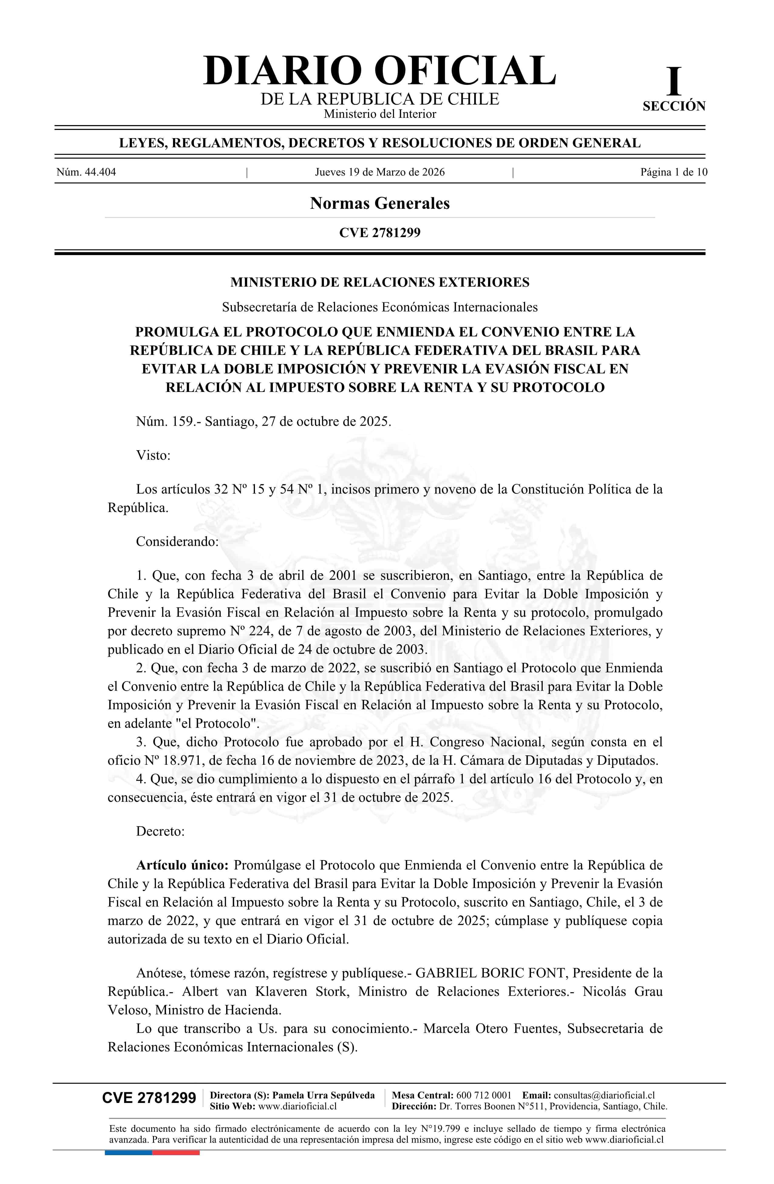 | Título: | Decreto número 159, de 2025.- Promulga el Protocolo que Enmienda el Convenio entre la República de Chile y la República Federativa del Brasil para Evitar la Doble Imposición y Prevenir la Evasión Fiscal en relación al Impuesto sobre la Renta y su Protocolo |