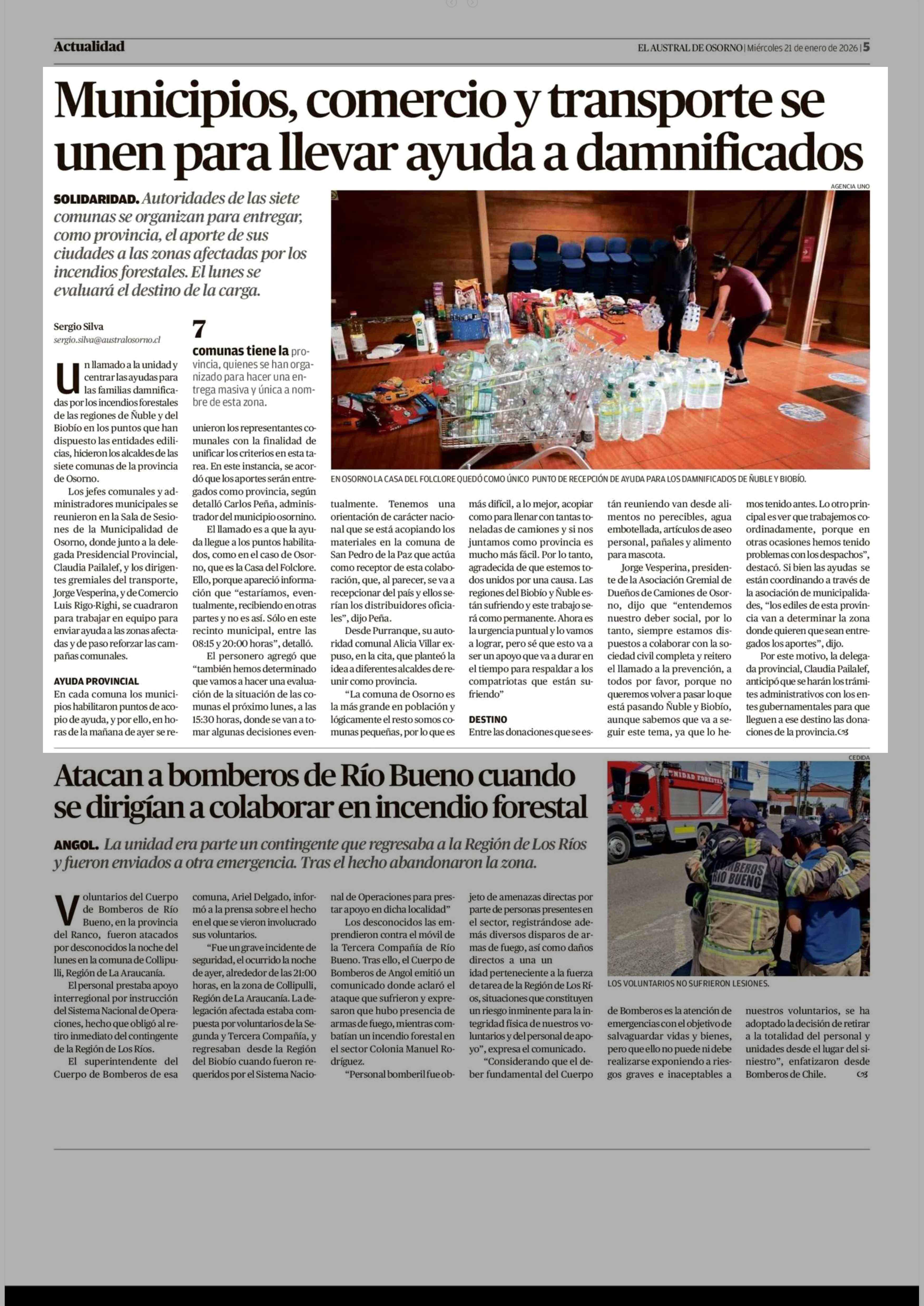 Municipios, comercio y transporte se unen para llevar ayuda a damnificados 21-01-2026 El Austral de Osorno |