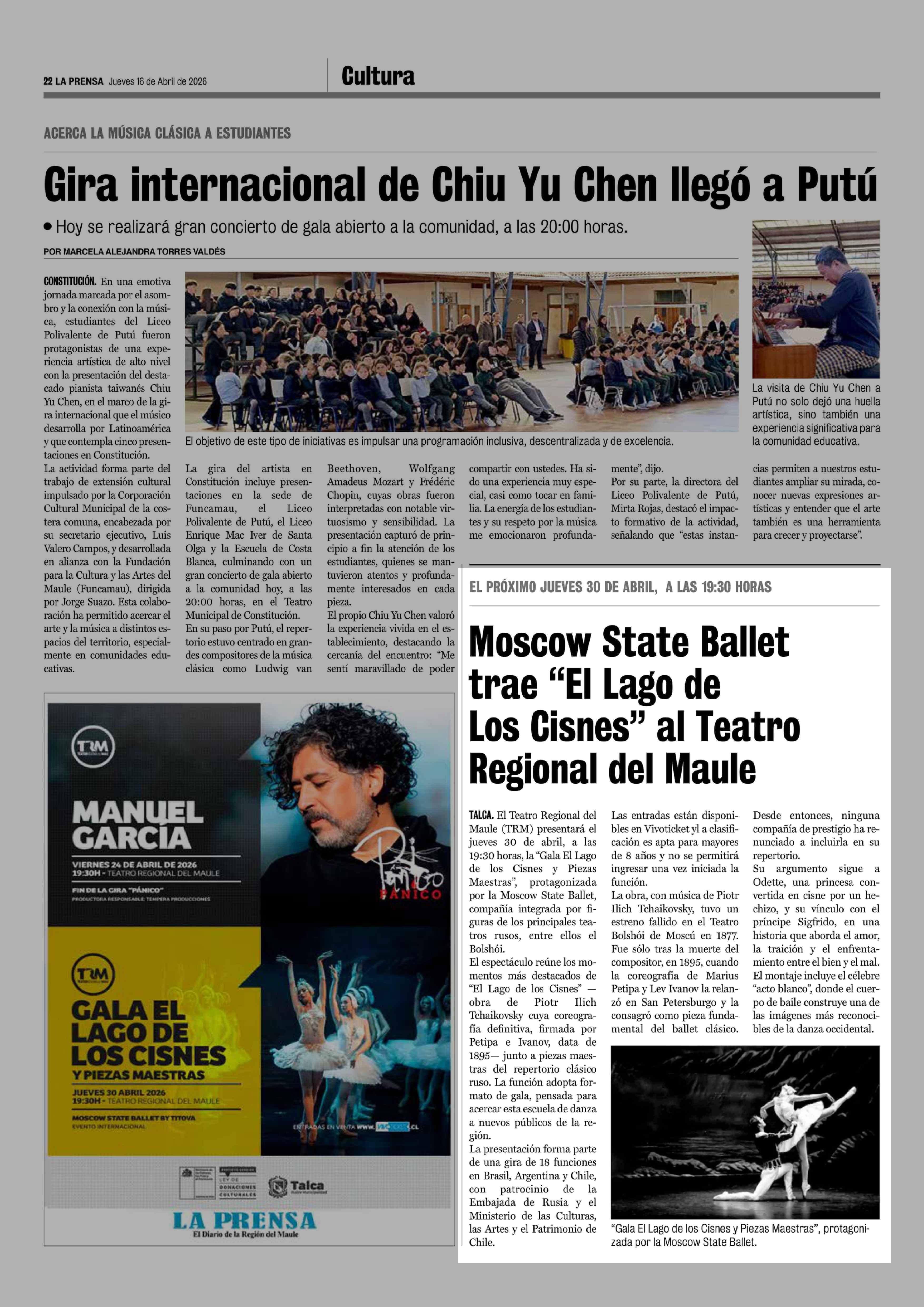 Moscow State Ballet trae "El Lago de Los Cisnes" al Teatro Regional del Maule 16-04-2026 La Prensa de Curicó |