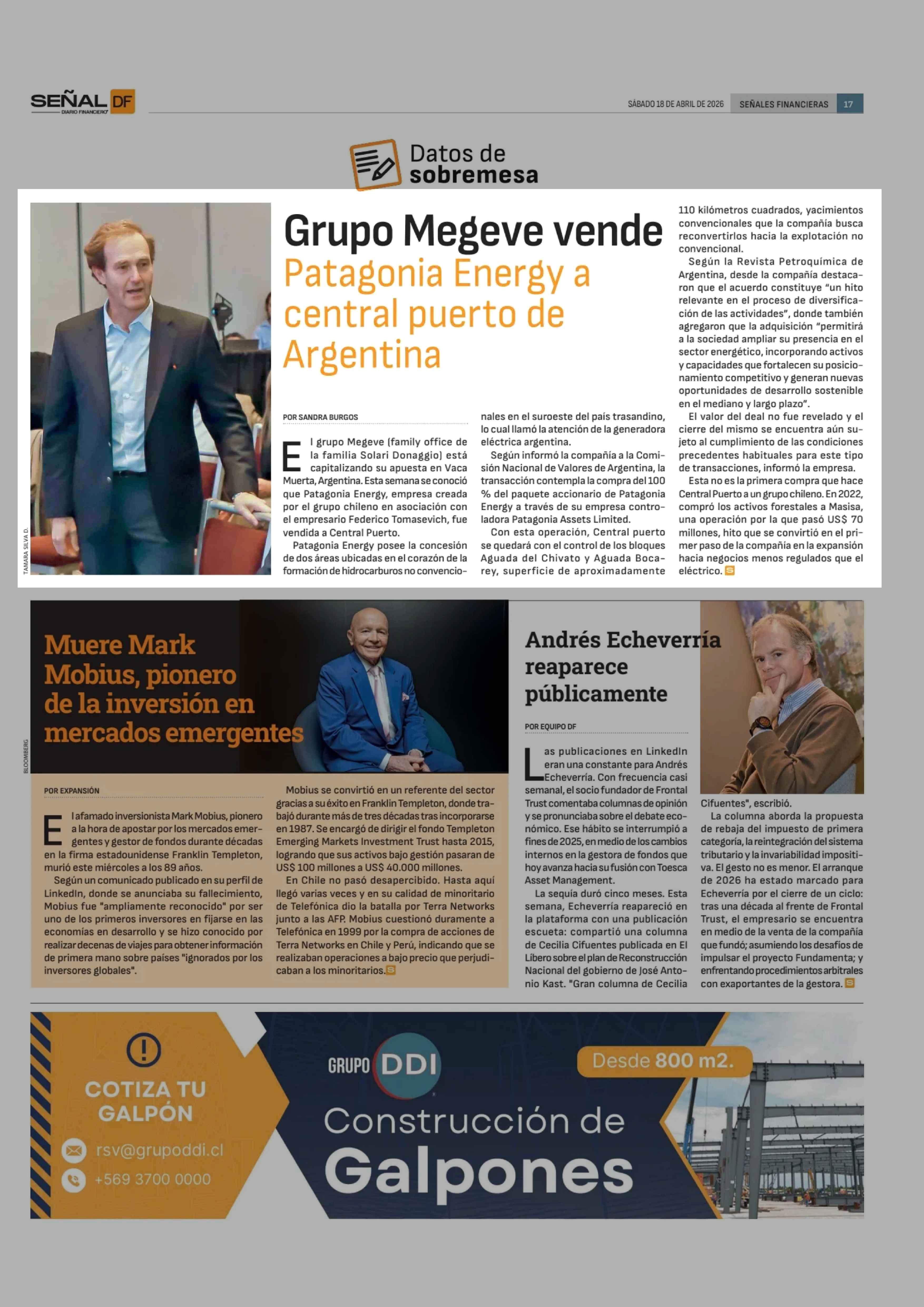 Grupo Megeve vende Patagonia Energy a central puerto de Argentina 18-04-2026 Diario Financiero |