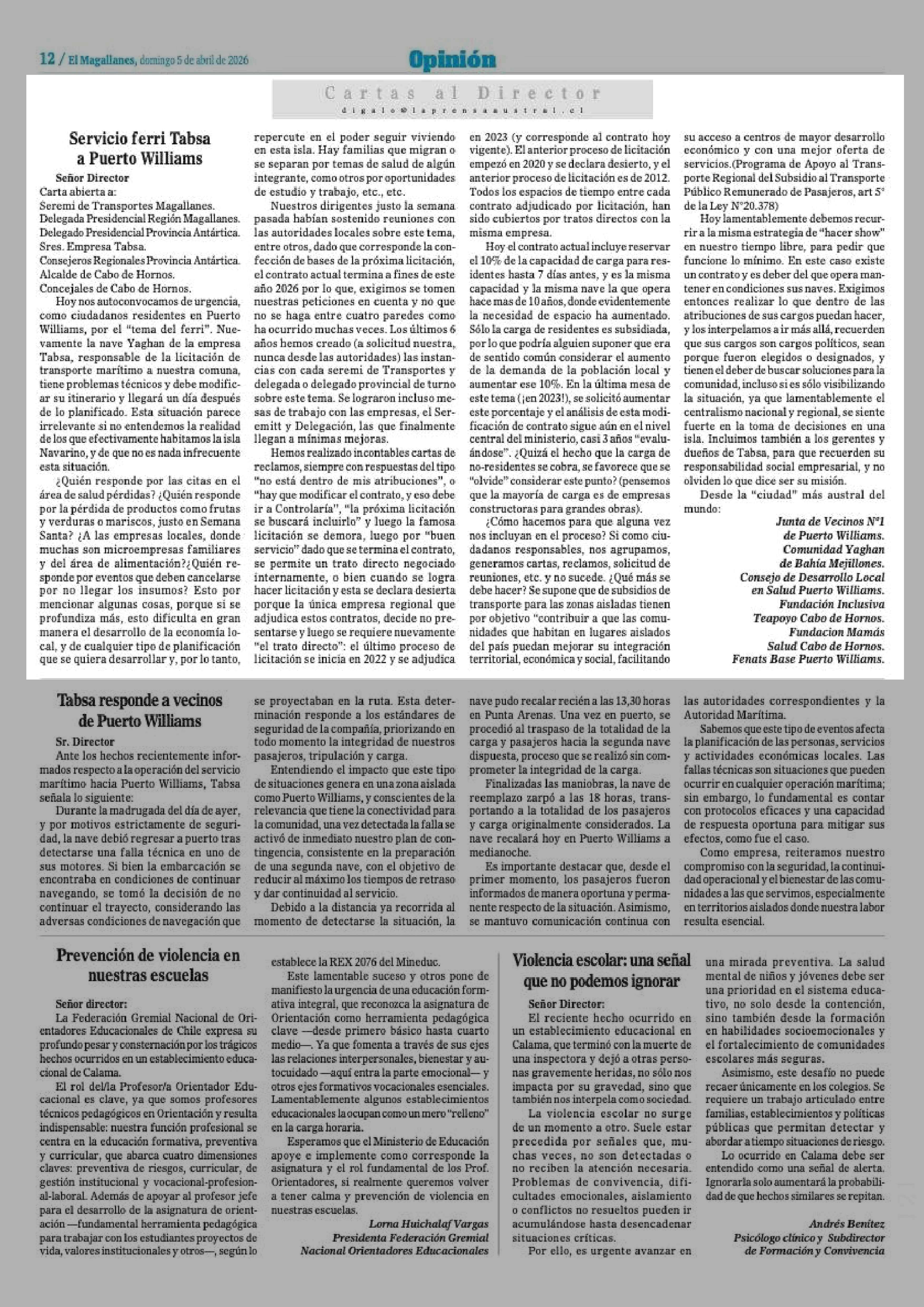 Cartas: Servicio ferri Tabsa a Puerto Williams 05-04-2026 El Magallanes |