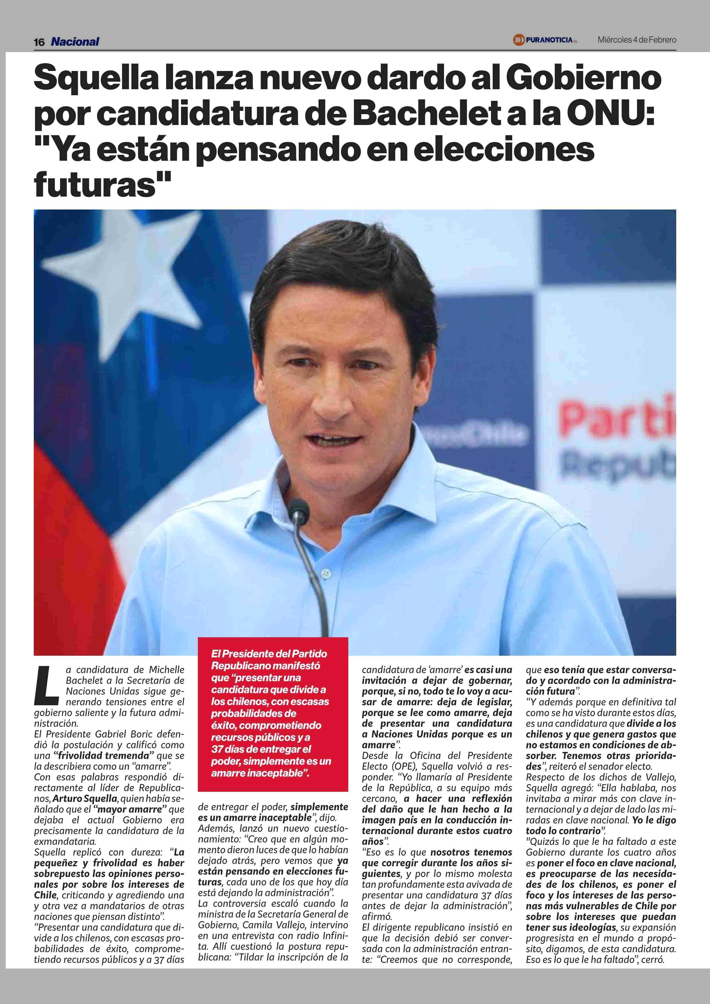 Título: Squella lanza nuevo dardo al Gobierno por candidatura de Bachelet a la ONU: “Ya están pensando en elecciones futuras”