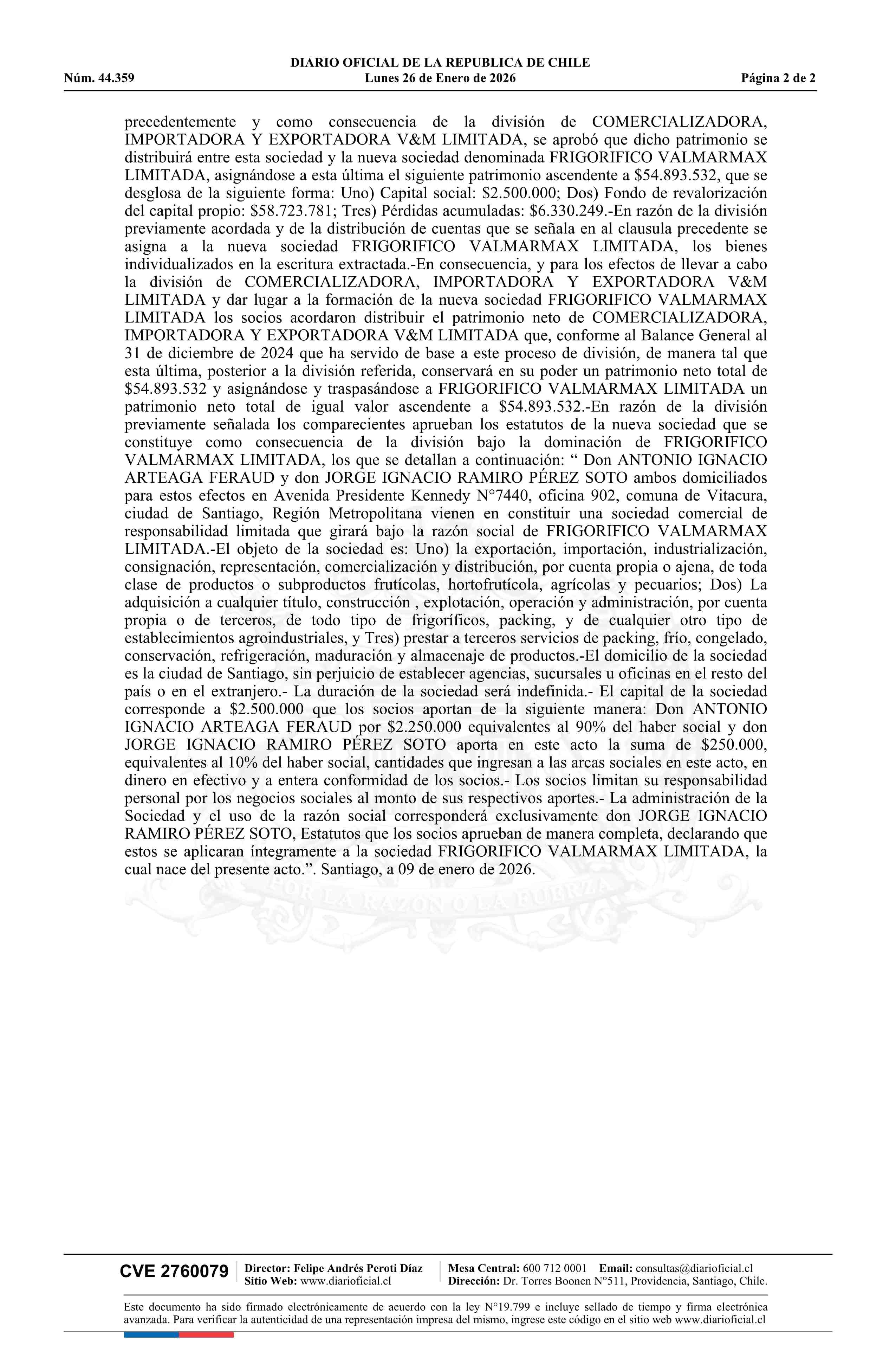 COMERCIALIZADORA, IMPORTADORA Y EXPORTADORA V&M LIMITADA 76.585.856-9 26-01-2026 Diario Oficial Edición Electrónica |