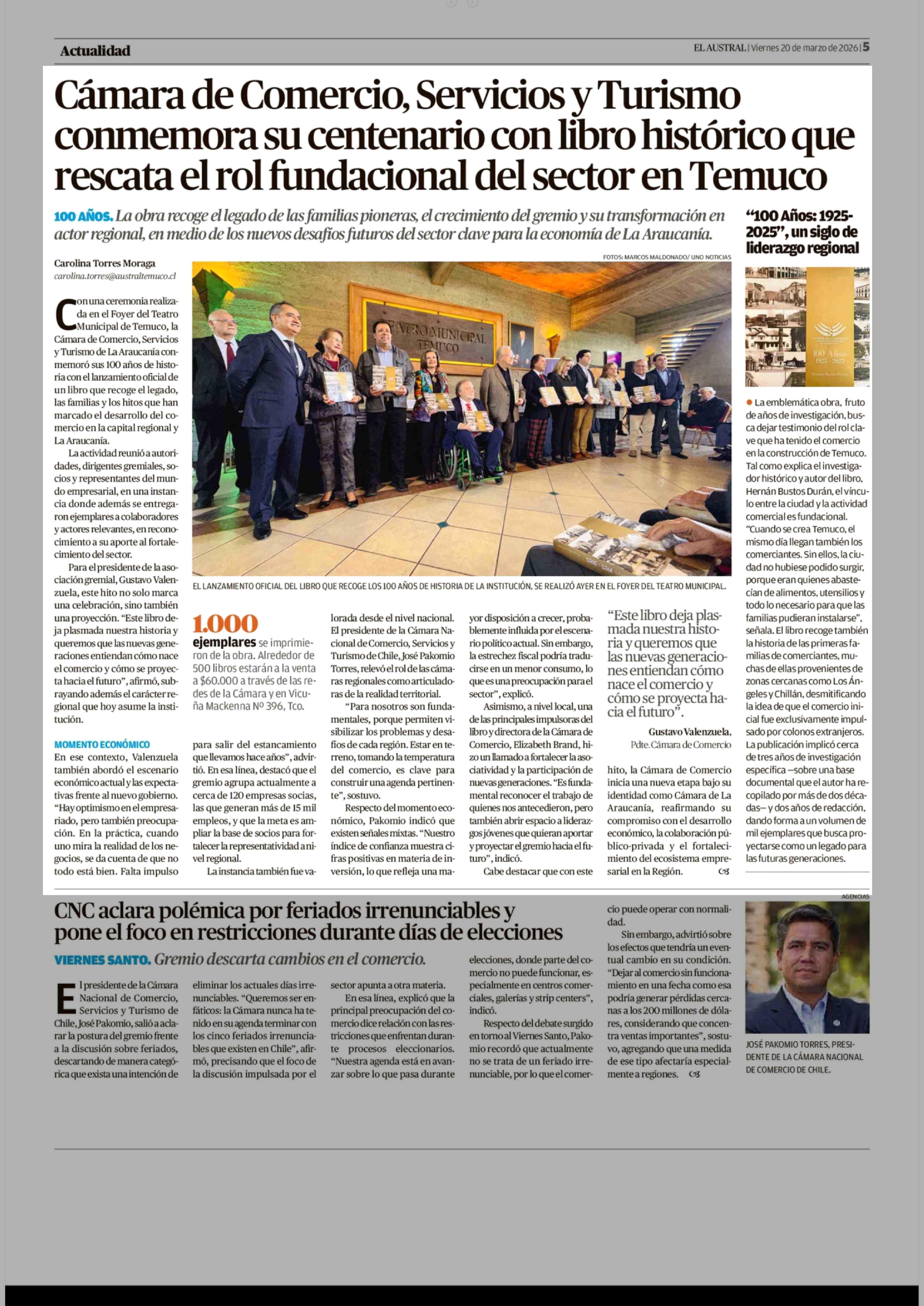 Cámara de Comercio, Servicios y Turismo conmemora su centenario con libro histórico que rescata el rol fundacional del sector en Temuco 20-03-2026 El Austral de la Araucanía |