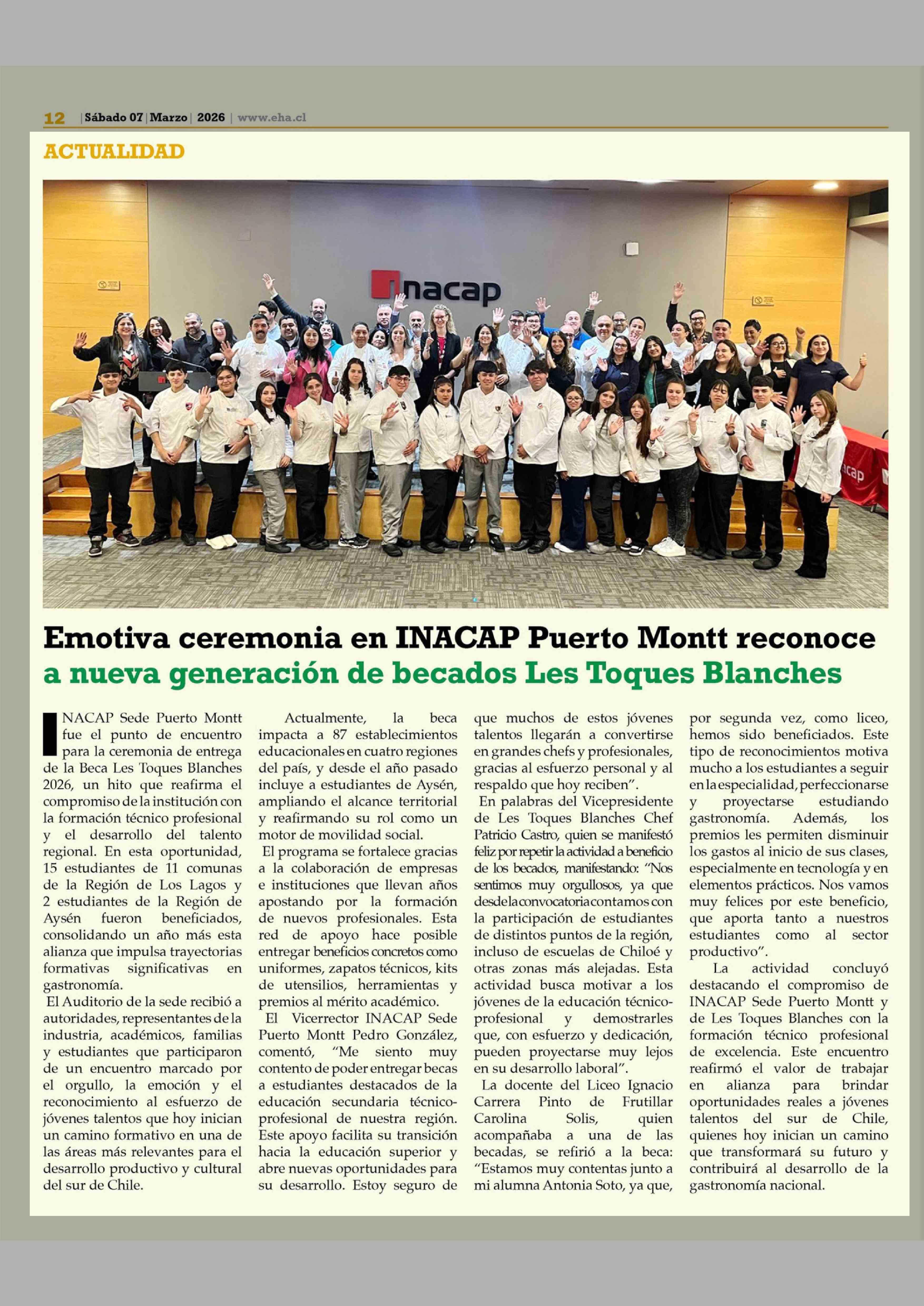 Emotiva ceremonia en INACAP Puerto Montt reconoce a nueva generación de becados Les Toques Blanches 07-03-2026 El Heraldo Austral |