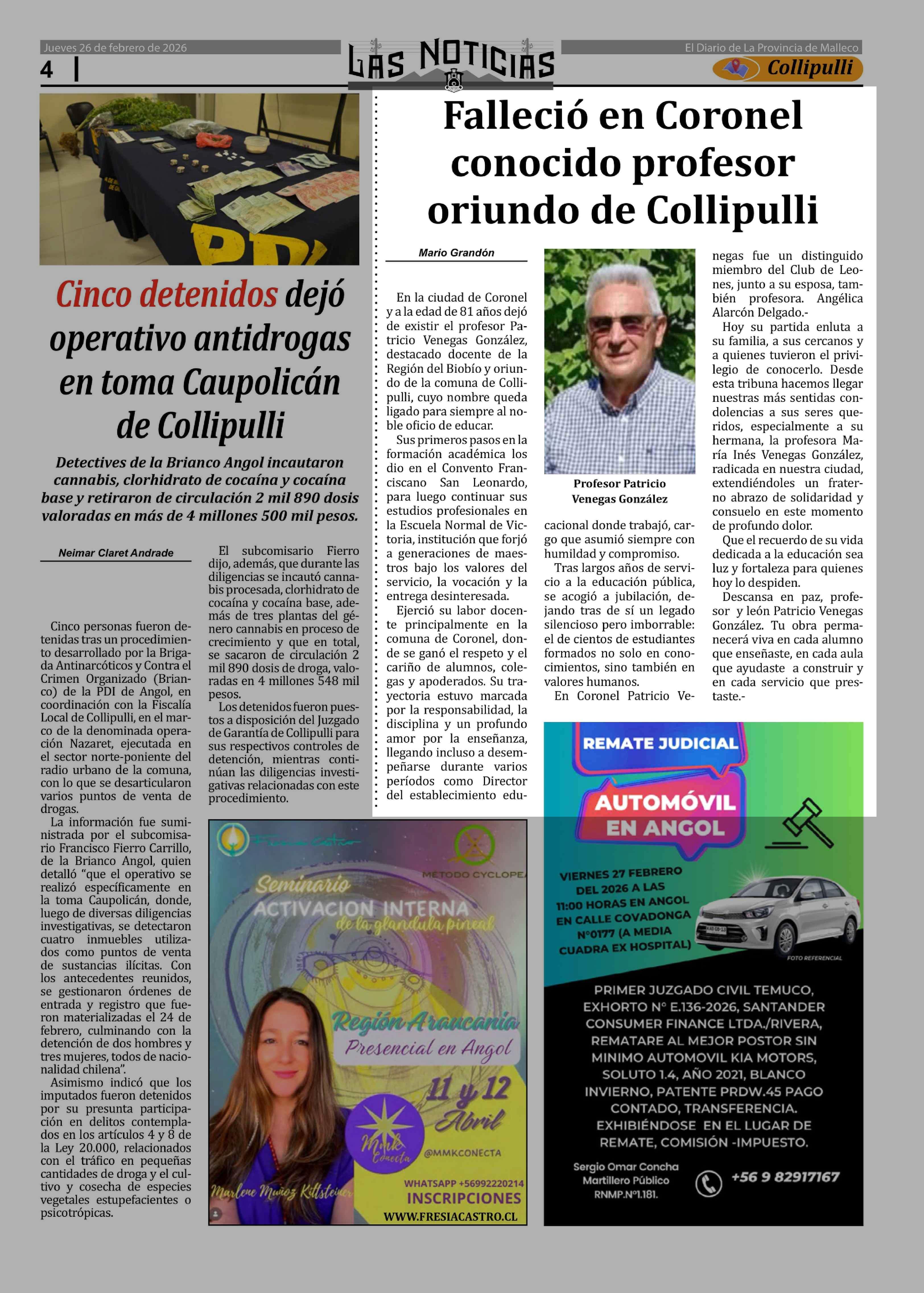 Falleció en Coronel conocido profesor oriundo de Collipulli 26-02-2026 Las Noticias |