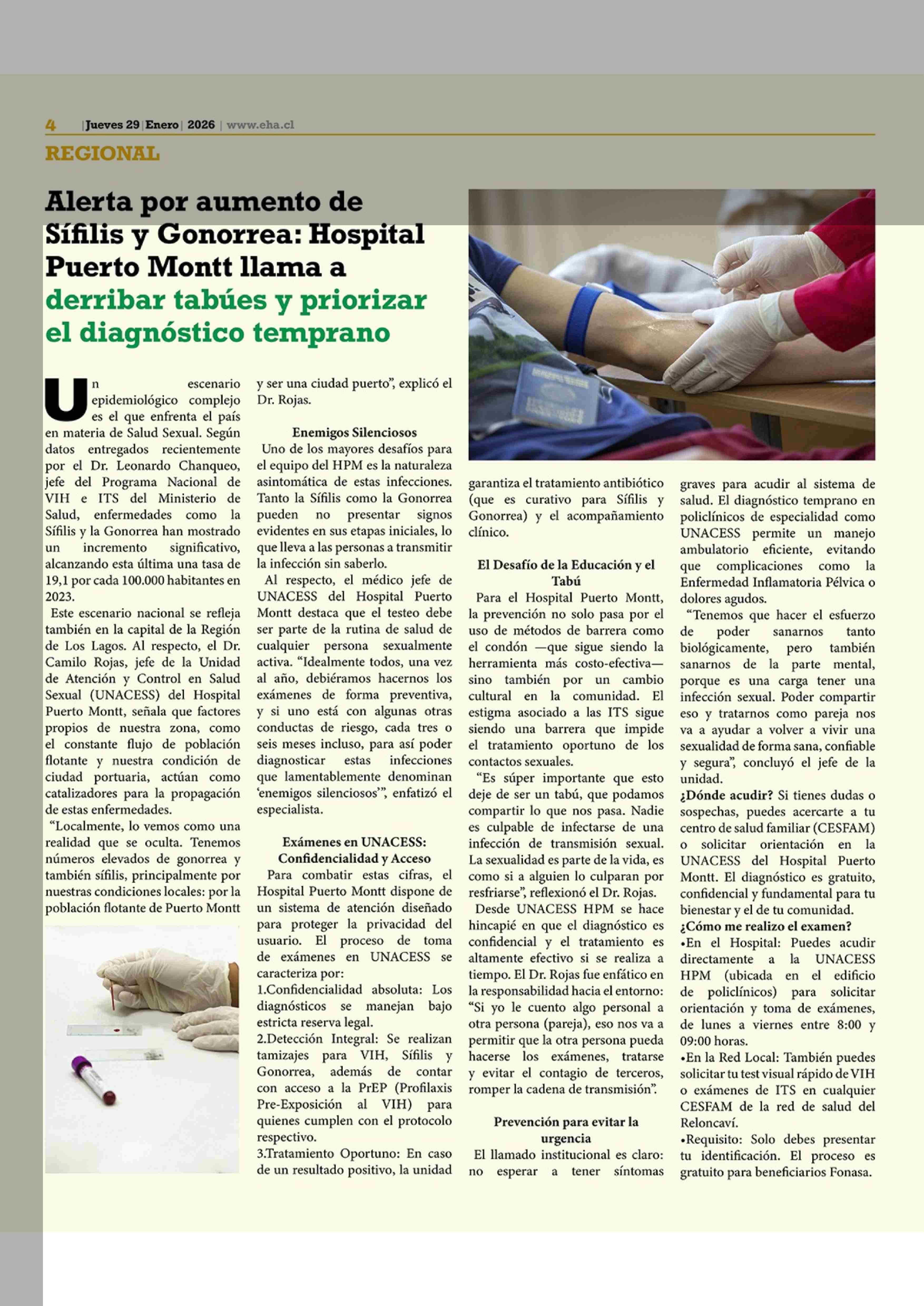 Alerta por aumento de Sífilis y Gonorrea: Hospital Puerto Montt llama a derribar tabúes y priorizar el diagnóstico temprano 29-01-2026 El Heraldo Austral |