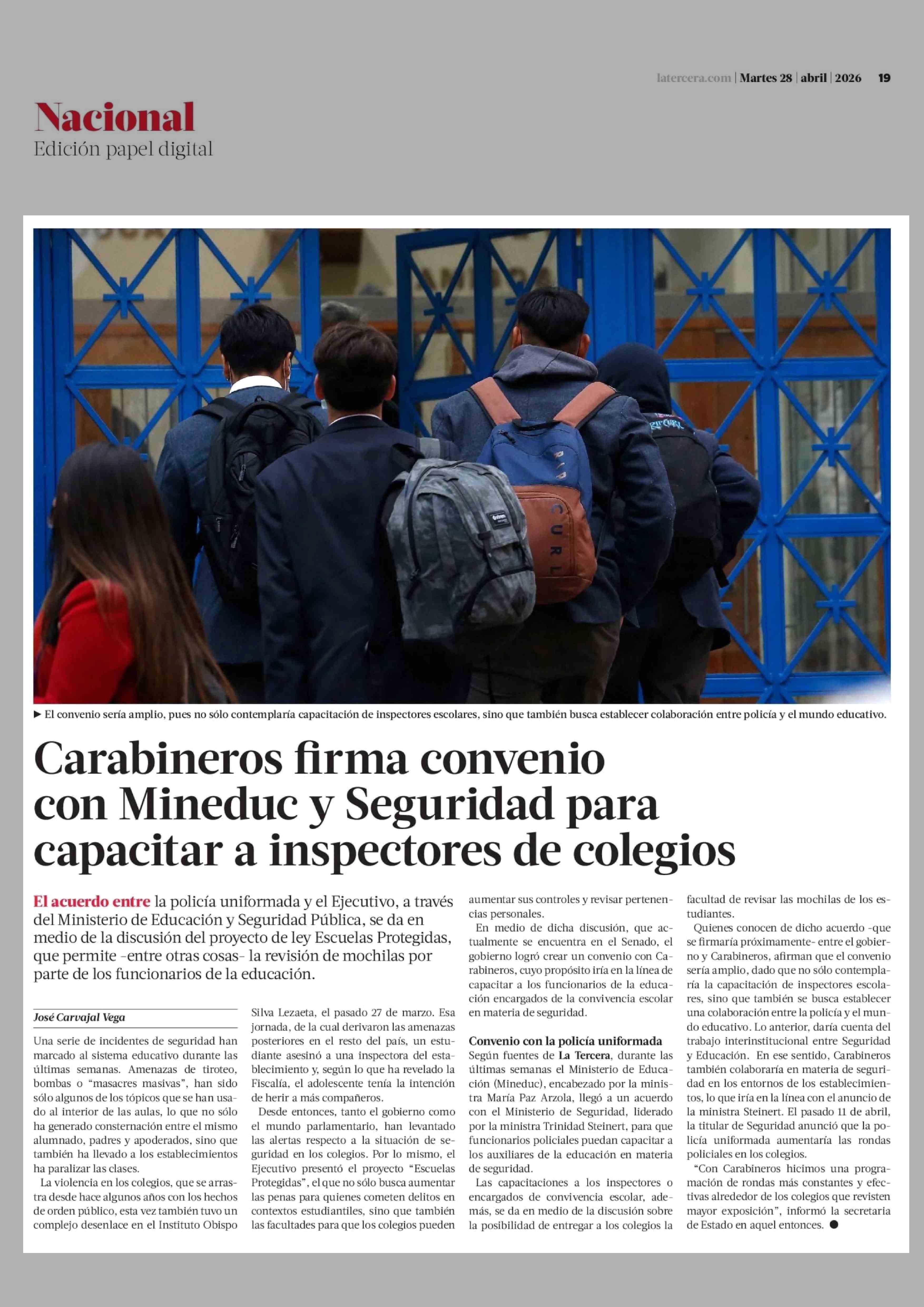 Carabineros firma convenio con Mineduc y Seguridad para capacitar a inspectores de colegios 28-04-2026 La Tercera |