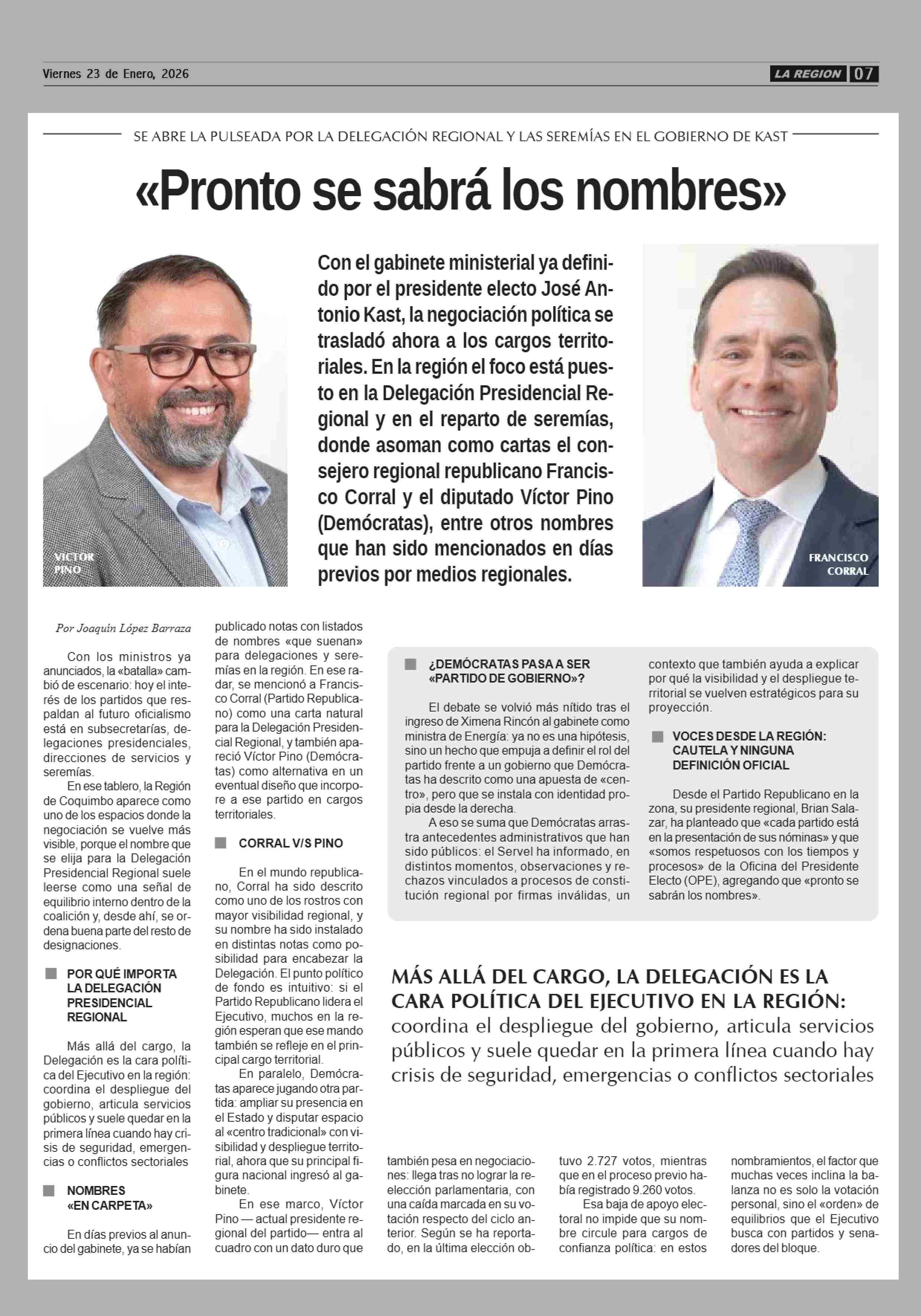 «Pronto se sabrá los nombres» 23-01-2026 Diario la Región |