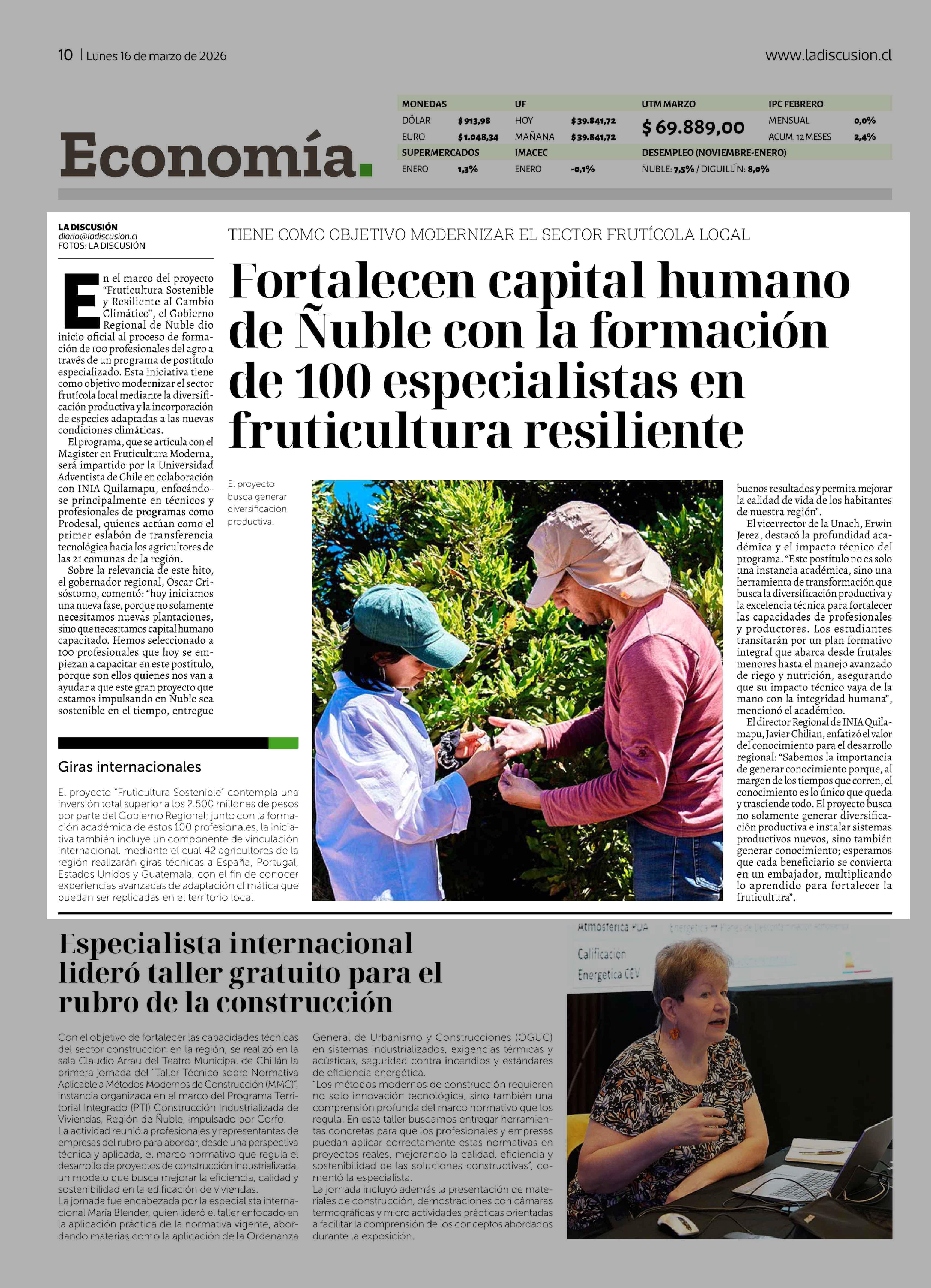 Fortalecen capital humano de Ñuble con la formación de 100 especialistas en fruticultura resiliente 16-03-2026 La Discusión |