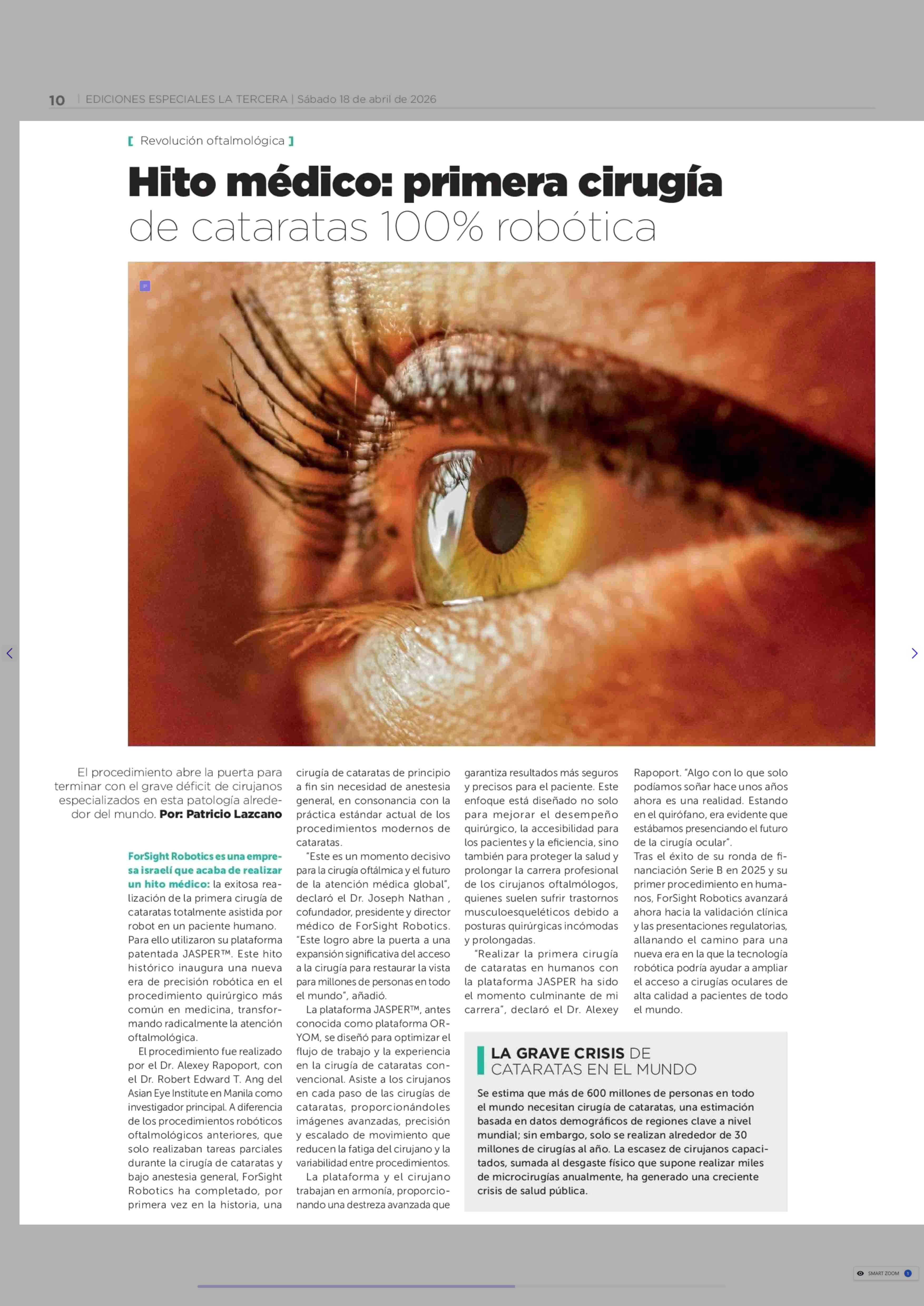 Título: Hito médico: primera cirugía de cataratas 100% robótica