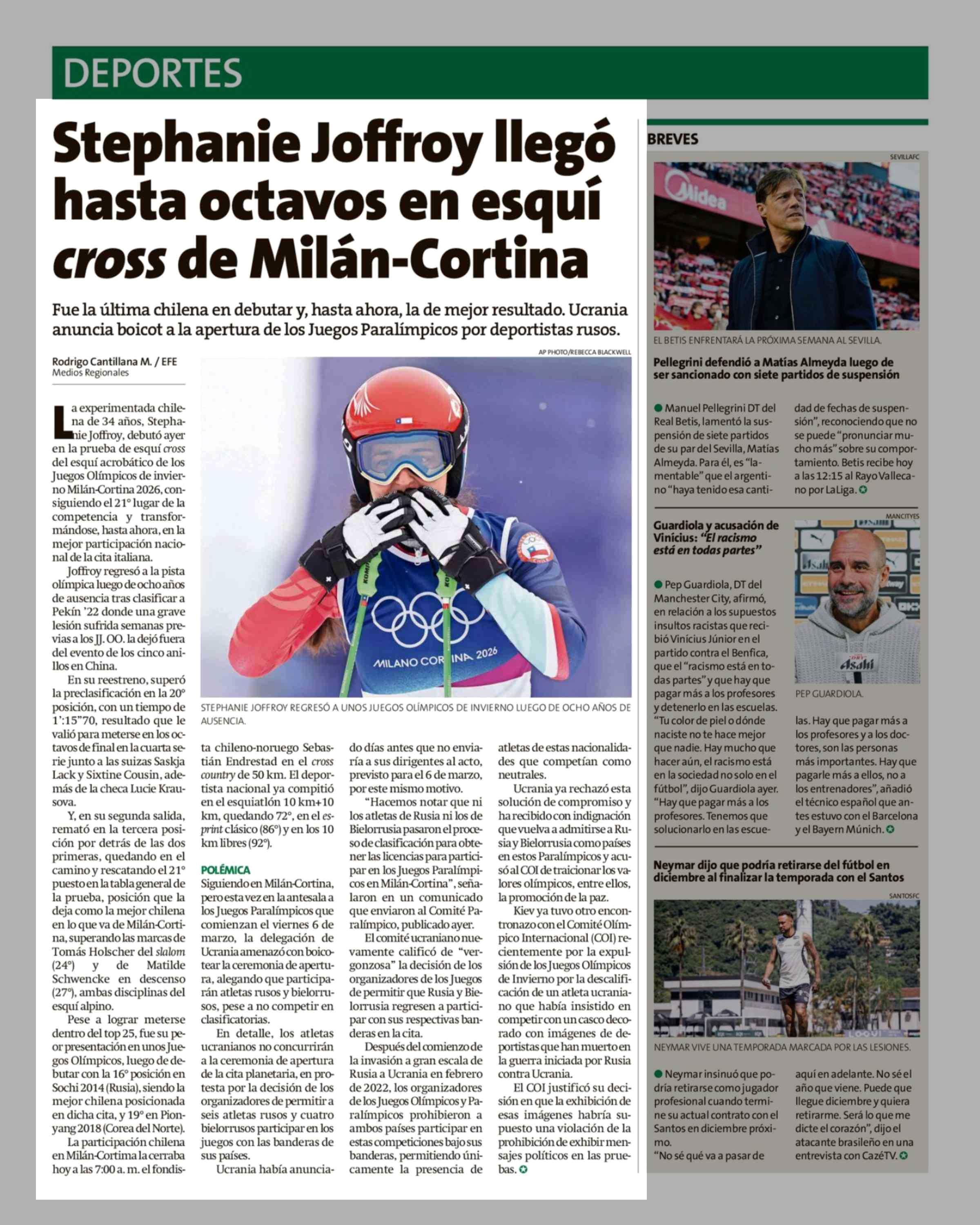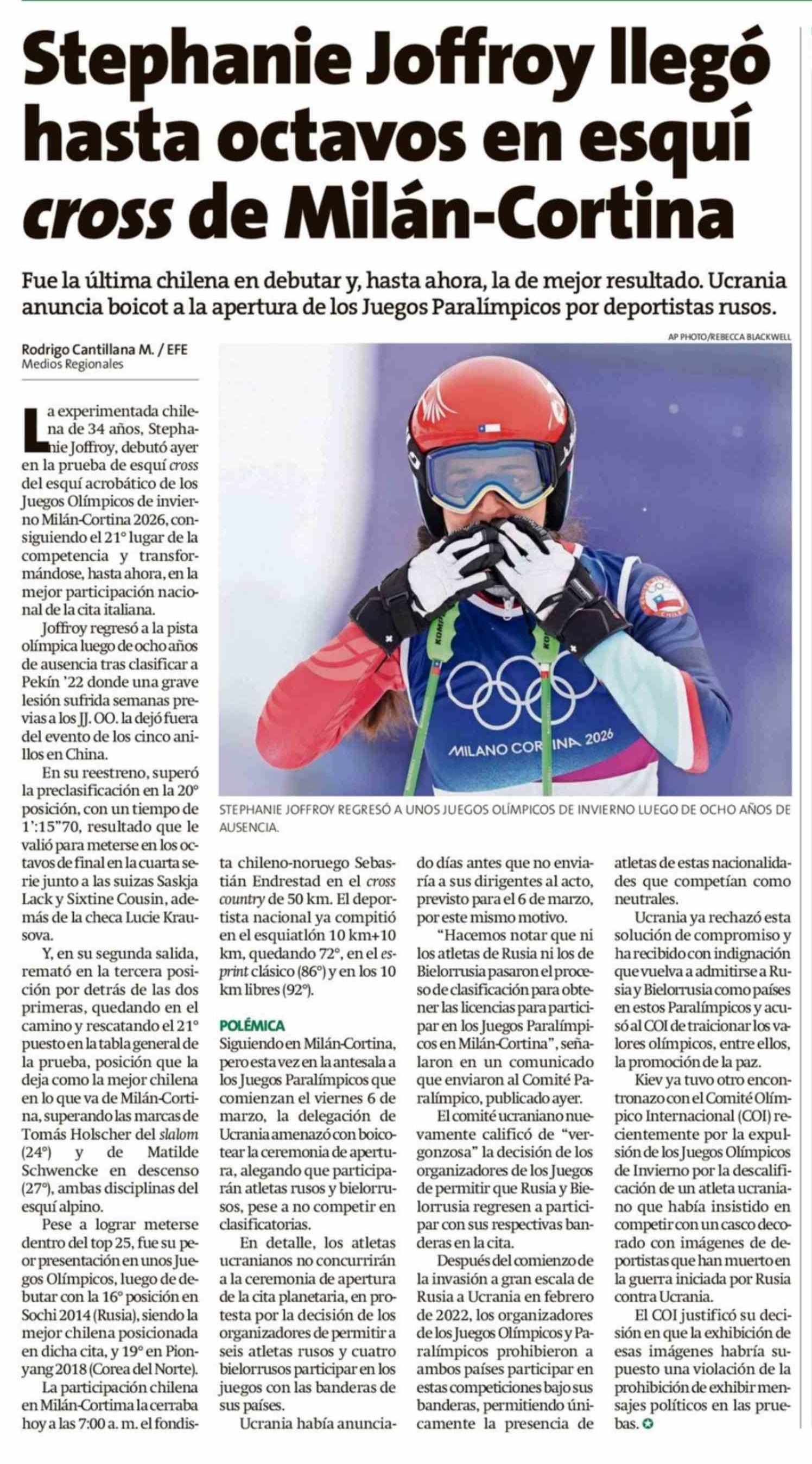 Stephanie Joffroy llegó hasta octavos en esquí cross de Milán-Cortina 21-02-2026 La Estrella de Chiloé |