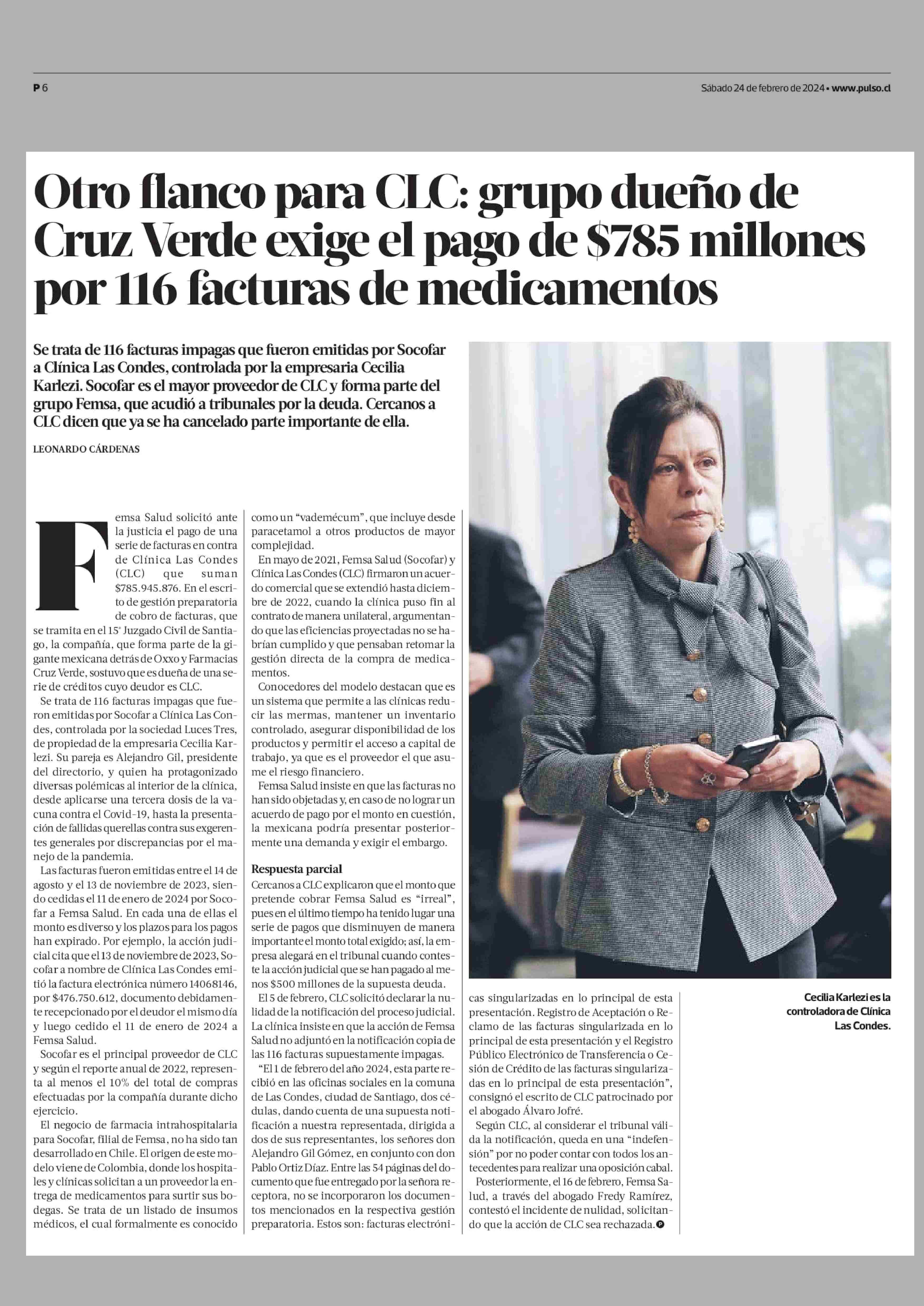Otro flanco para CLC: grupo dueño de Cruz Verde exige el pago de $785 millones por 116 facturas de medicamentos 24-02-2024 La Tercera |