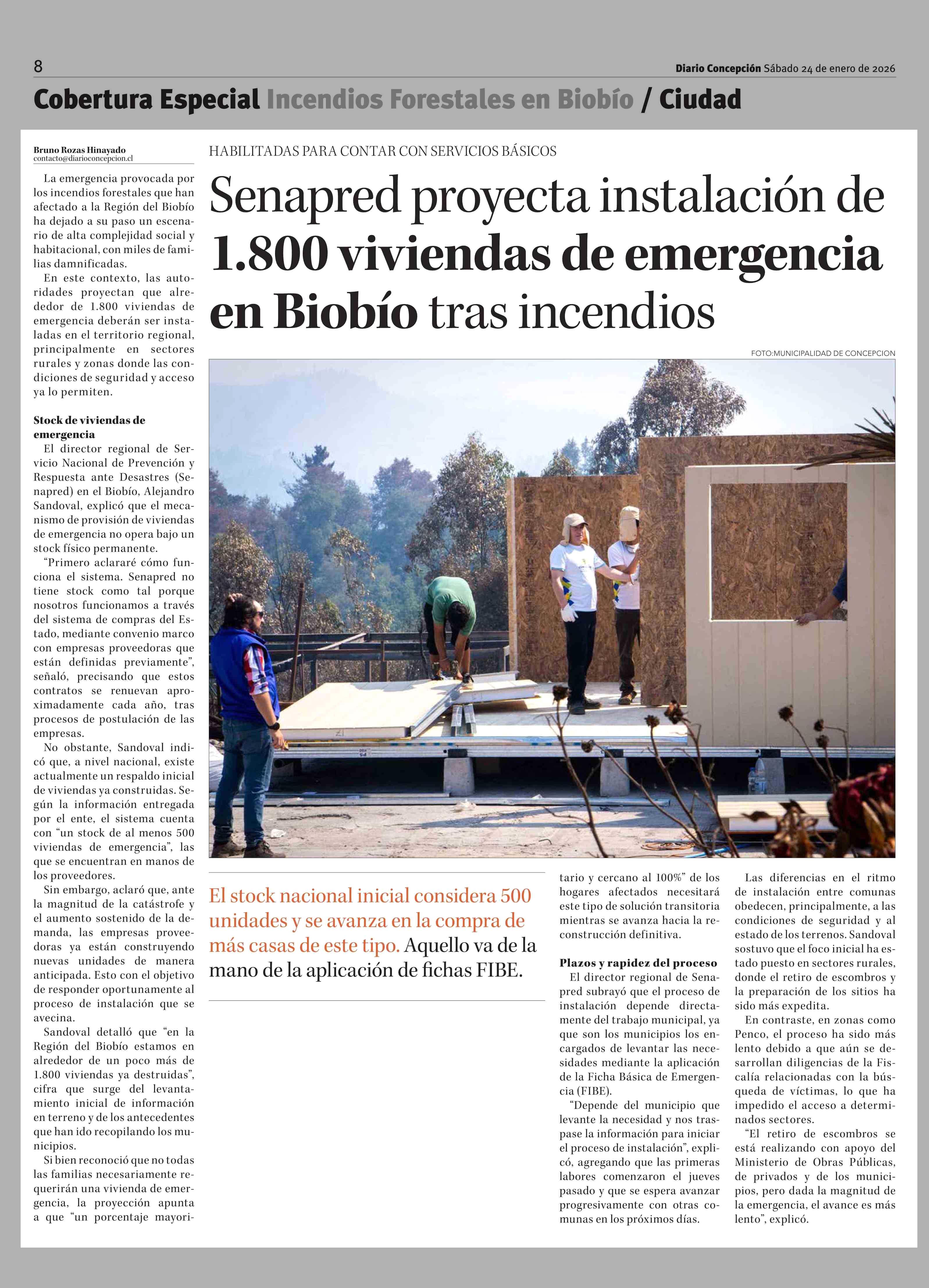 Senapred proyecta instalación de 1.800 viviendas de emergencia en Biobío tras incendios 24-01-2026 Diario Concepción |