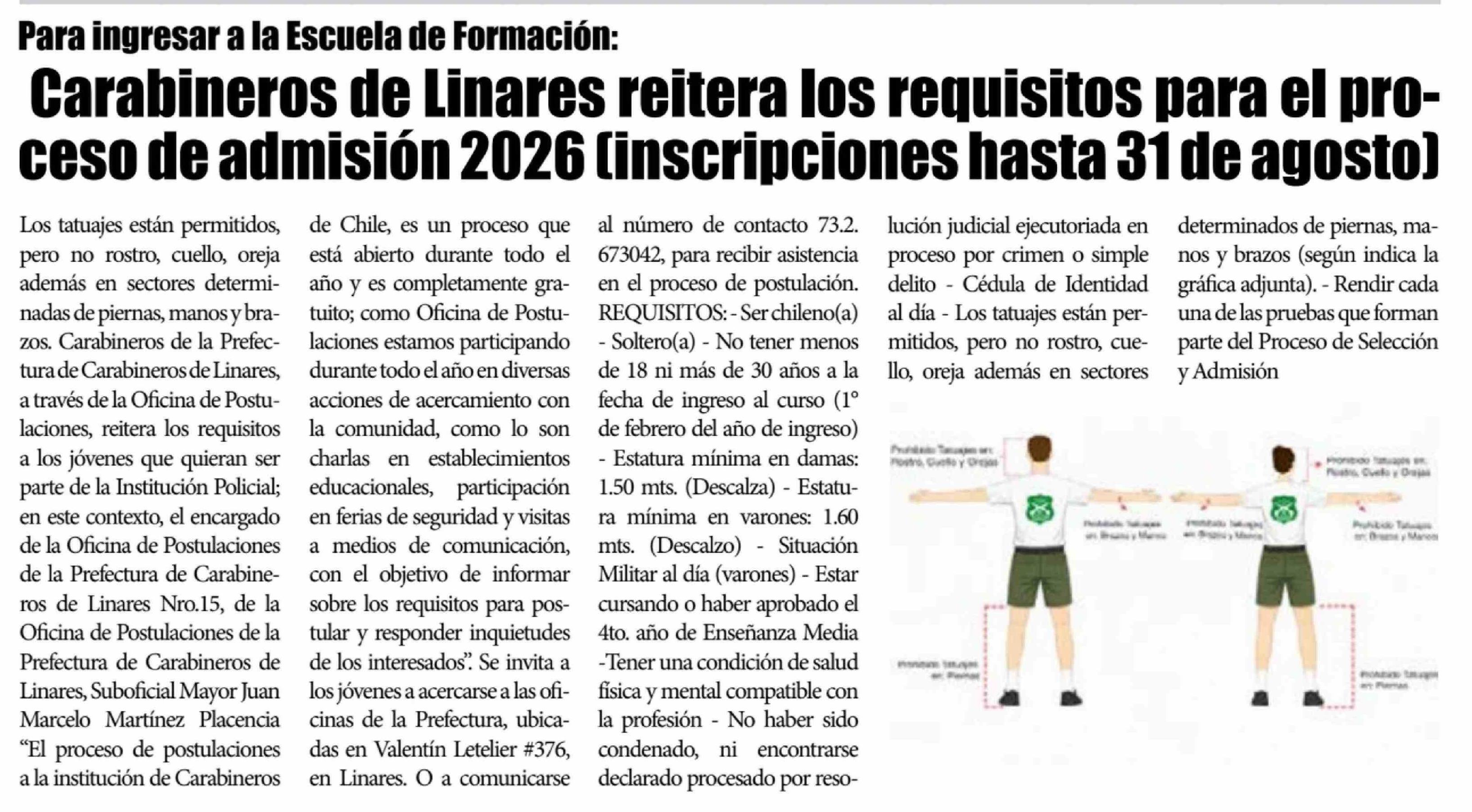 Título: Carabineros de Linares reitera los requisitos para el proceso de admisión 2026 (inscripciones hasta 31 de agosto)