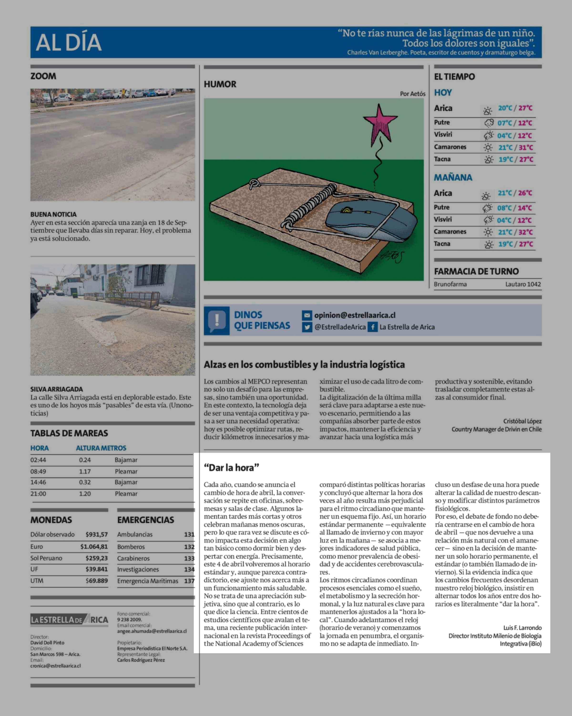 | Título: | Cartas: "Dar la hora" Cada año, cuando se anuncia el cambio de hora de abril, la conversación se repite en oficinas, sobremesas y salas de clase. Algunos lamentan tardes más cortas y otros celebran mañanas menos oscuras, pero lo que rara vez se discute es cómo impacta esta decisión en algo tan básic |