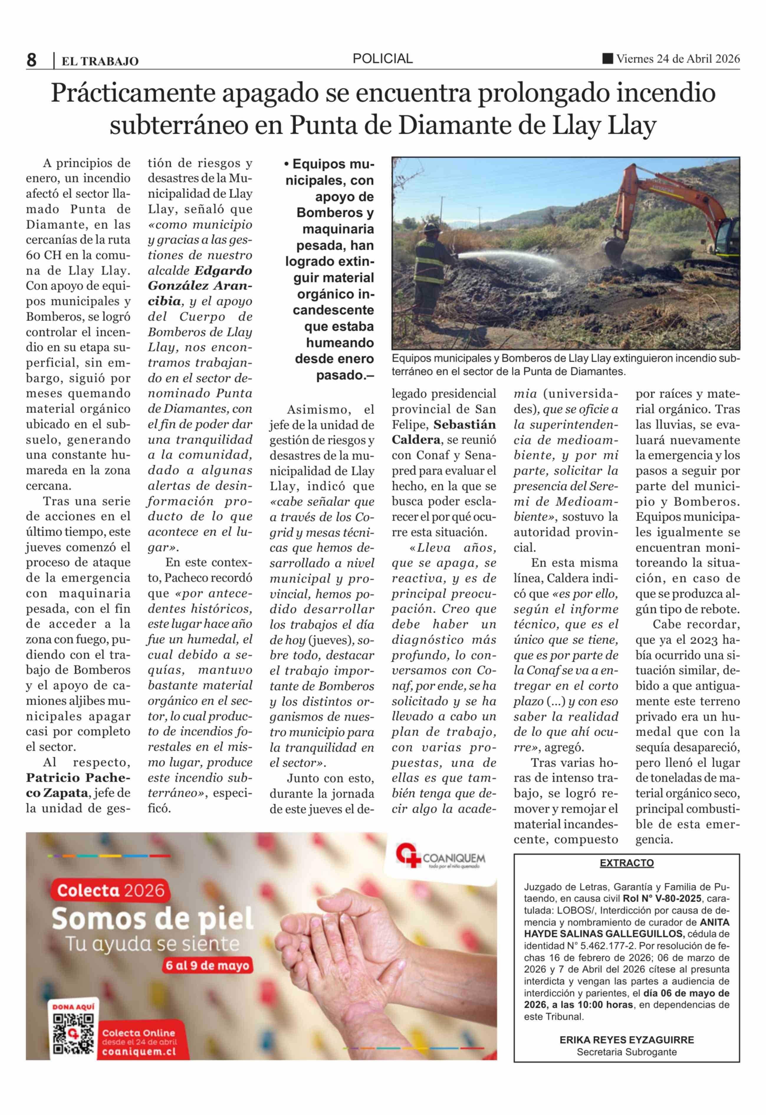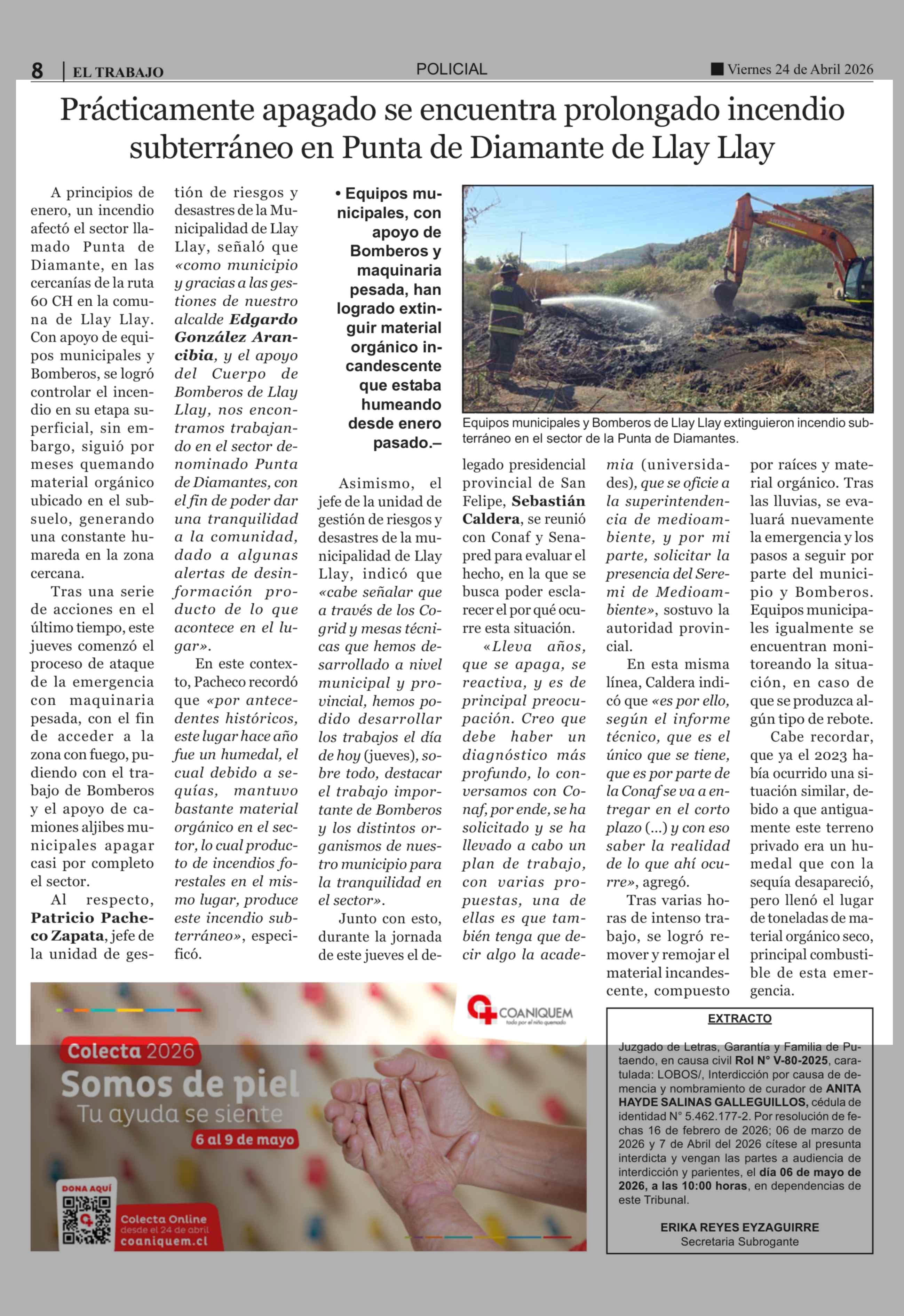 Prácticamente apagado se encuentra prolongado incendio subterráneo en Punta de Diamante de Llay Llay 24-04-2026 El Trabajo |