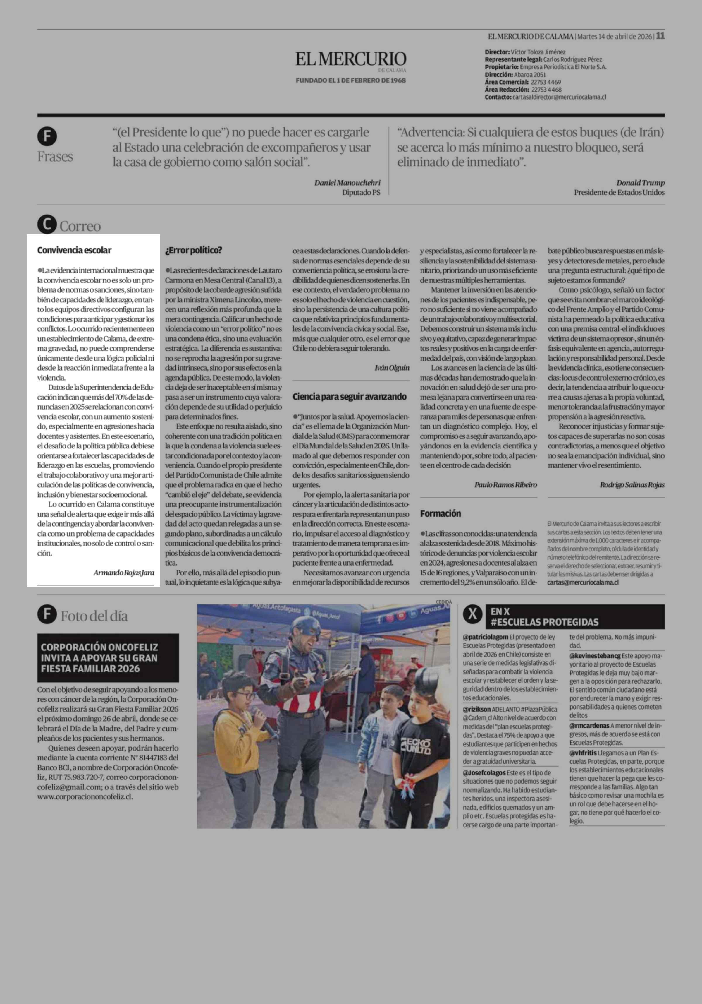 Cartas: Convivencia escolar 14-04-2026 El Mercurio de Calama |