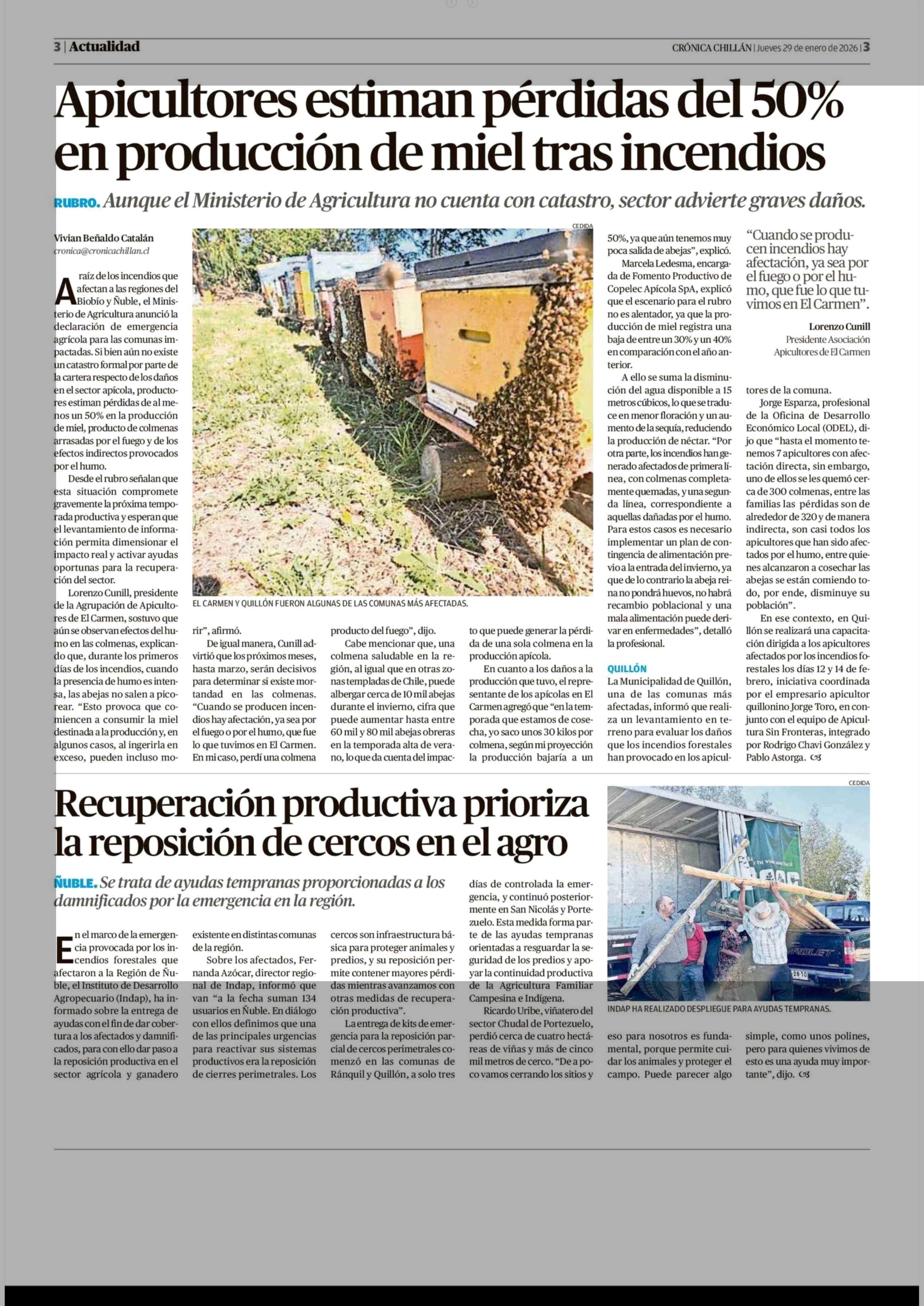 Apicultores estiman pérdidas del 50% en producción de miel tras incendios 29-01-2026 Crónica de Chillán |