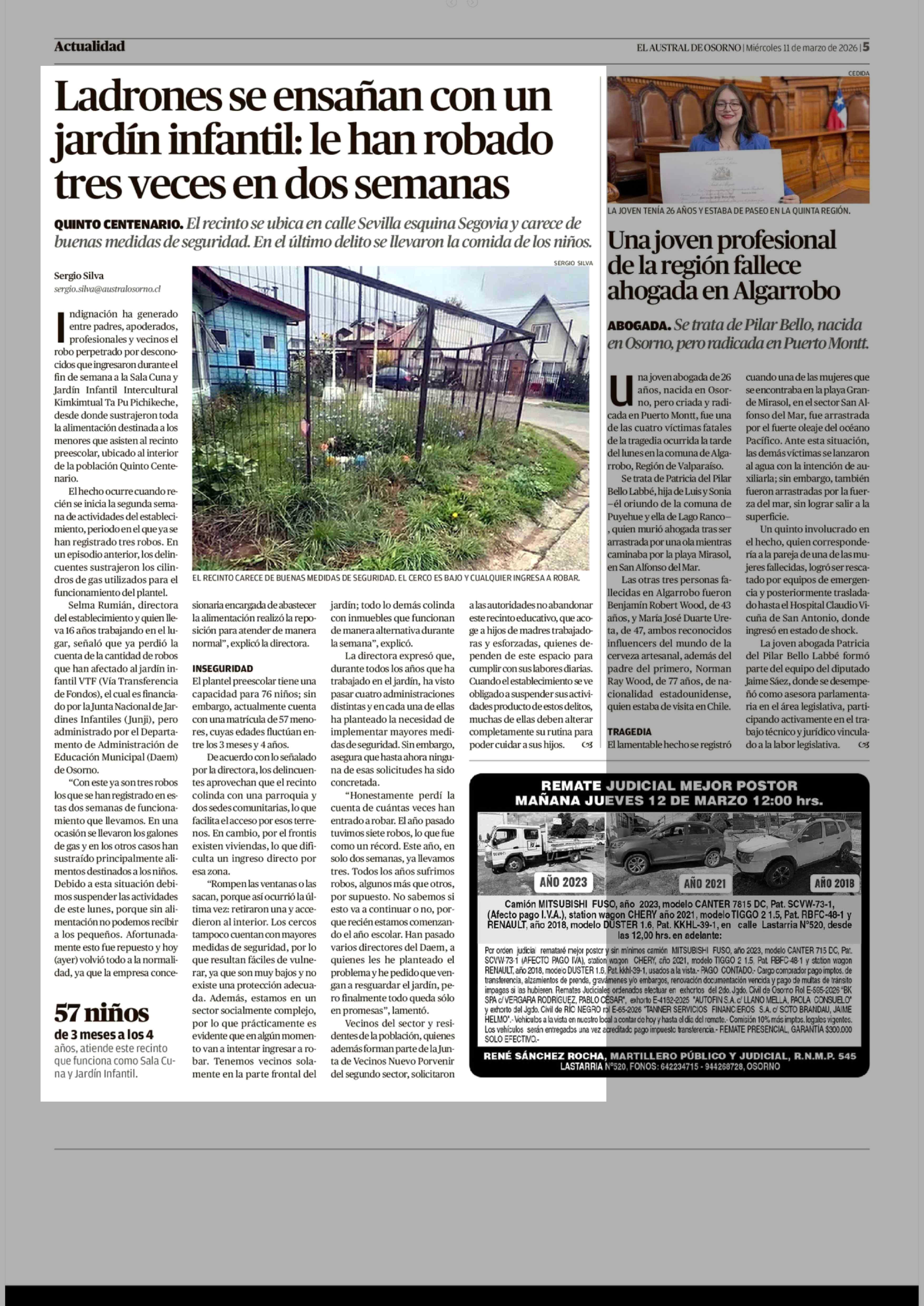 Ladrones se ensañan con un jardín infantil: le han robado tres veces en dos semanas 11-03-2026 El Austral de Osorno |