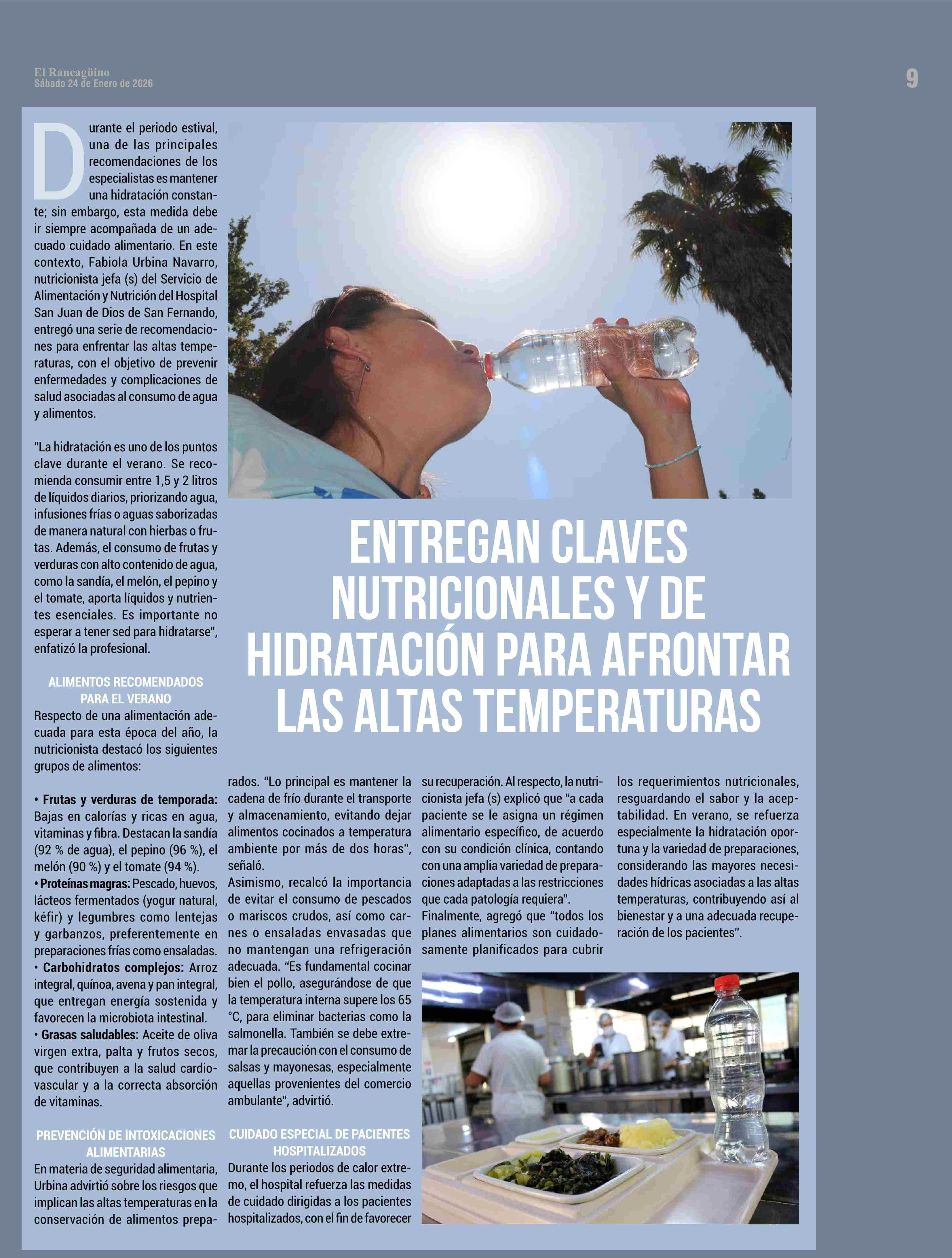 ENTREGAN CLAVES NUTRICIONALES Y DE HIDRATACIÓN PARA AFRONTAR LAS ALTAS TEMPERATURAS 24-01-2026 El Rancagüino |