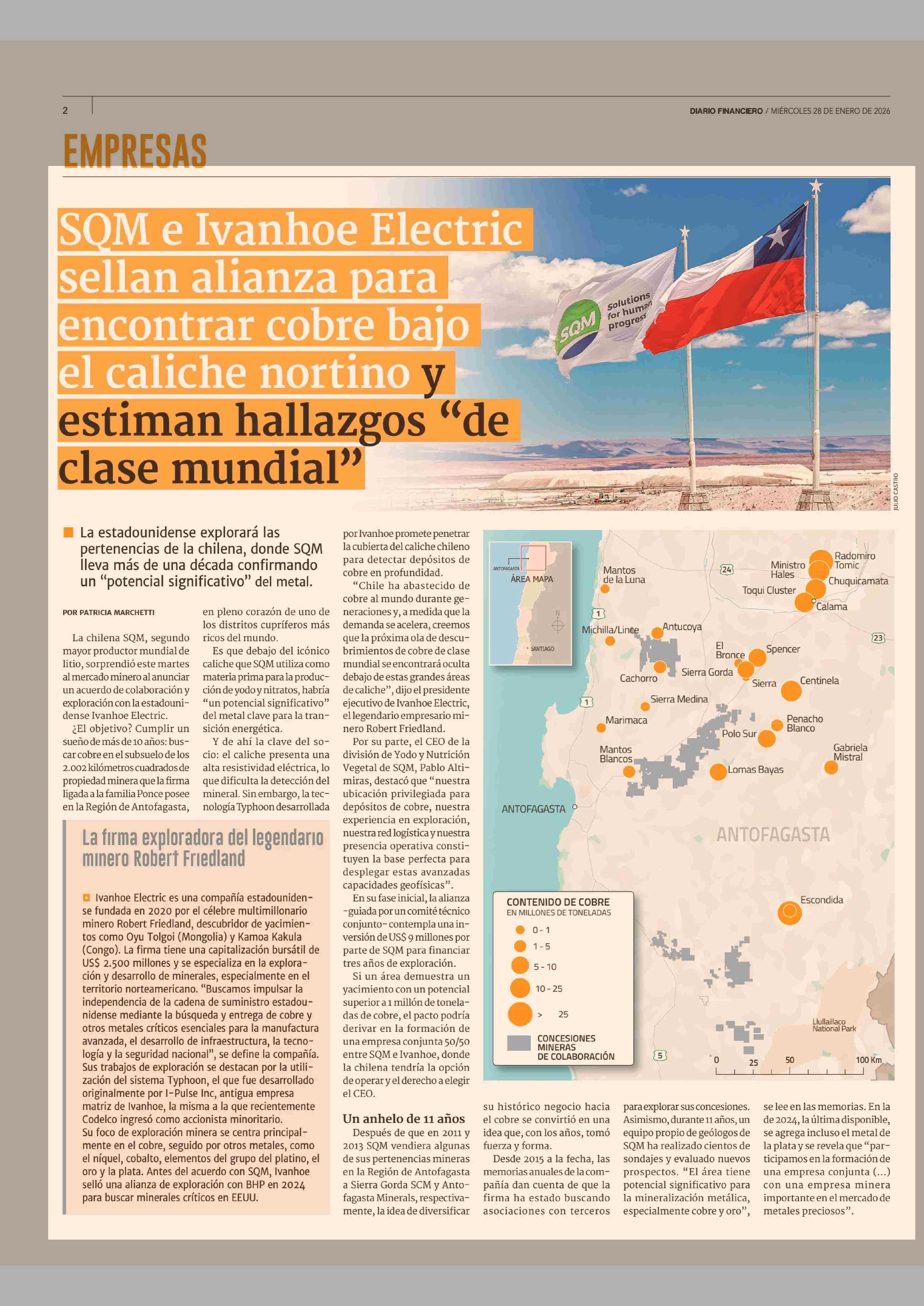 SQM e Ivanhoe Electric sellan alianza para encontrar cobre bajo el caliche nortino y estiman hallazgos "de clase mundial" 28-01-2026 Diario Financiero |