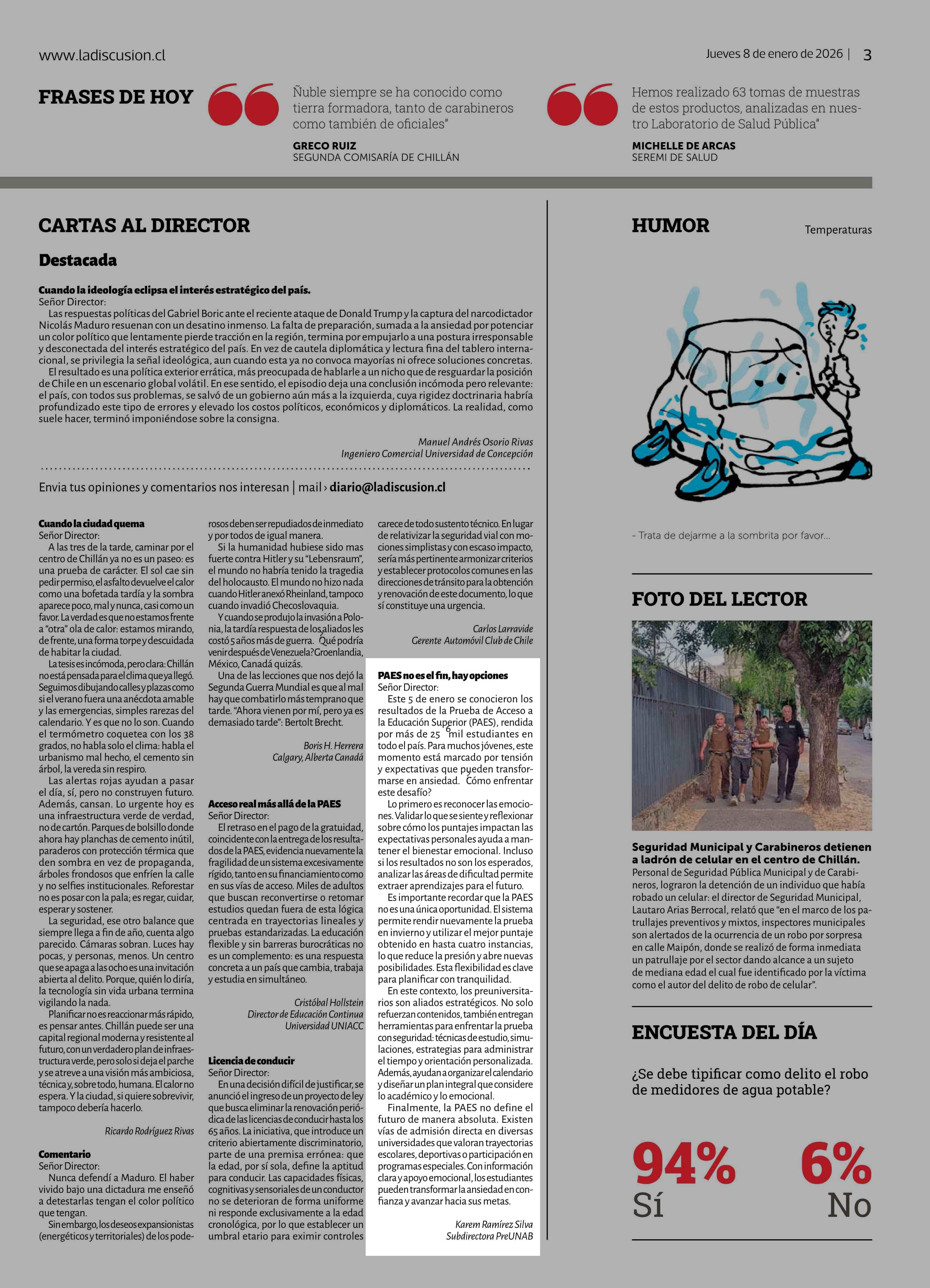 Título: Cartas: PAES no es el fin, hay opciones Señor Director: Este 5 de enero se conocieron los resultados de la Prueba de Acceso a la Educación Superior (PAES), rendida por más de 259 mil estudiantes en todo el país. Para muchos jóvenes, este momento está marcado por tensión y expectativas que pueden tra