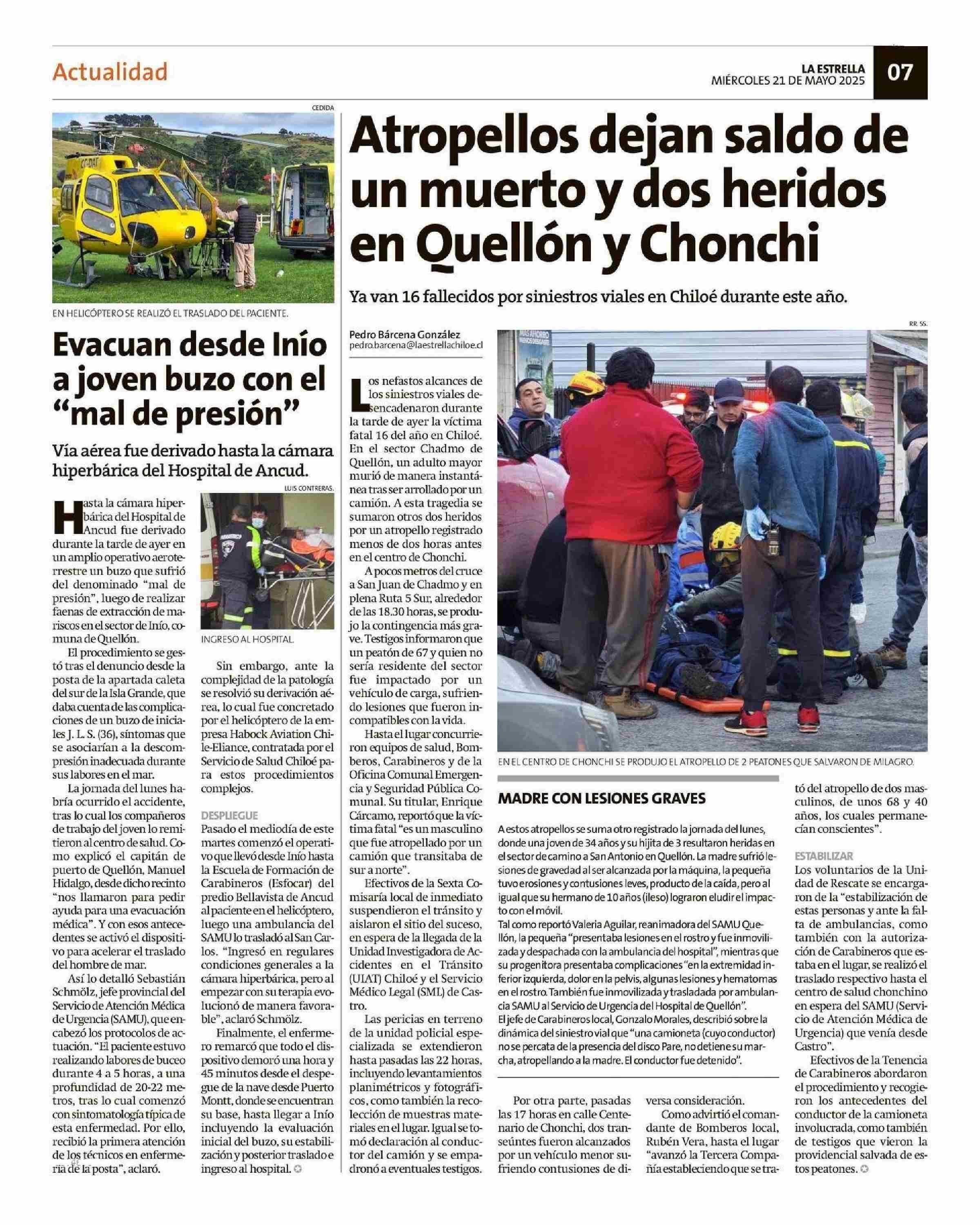 Evacuan desde Inío a joven buzo con el “mal de presión” 21-05-2025 La Estrella de Chiloé |