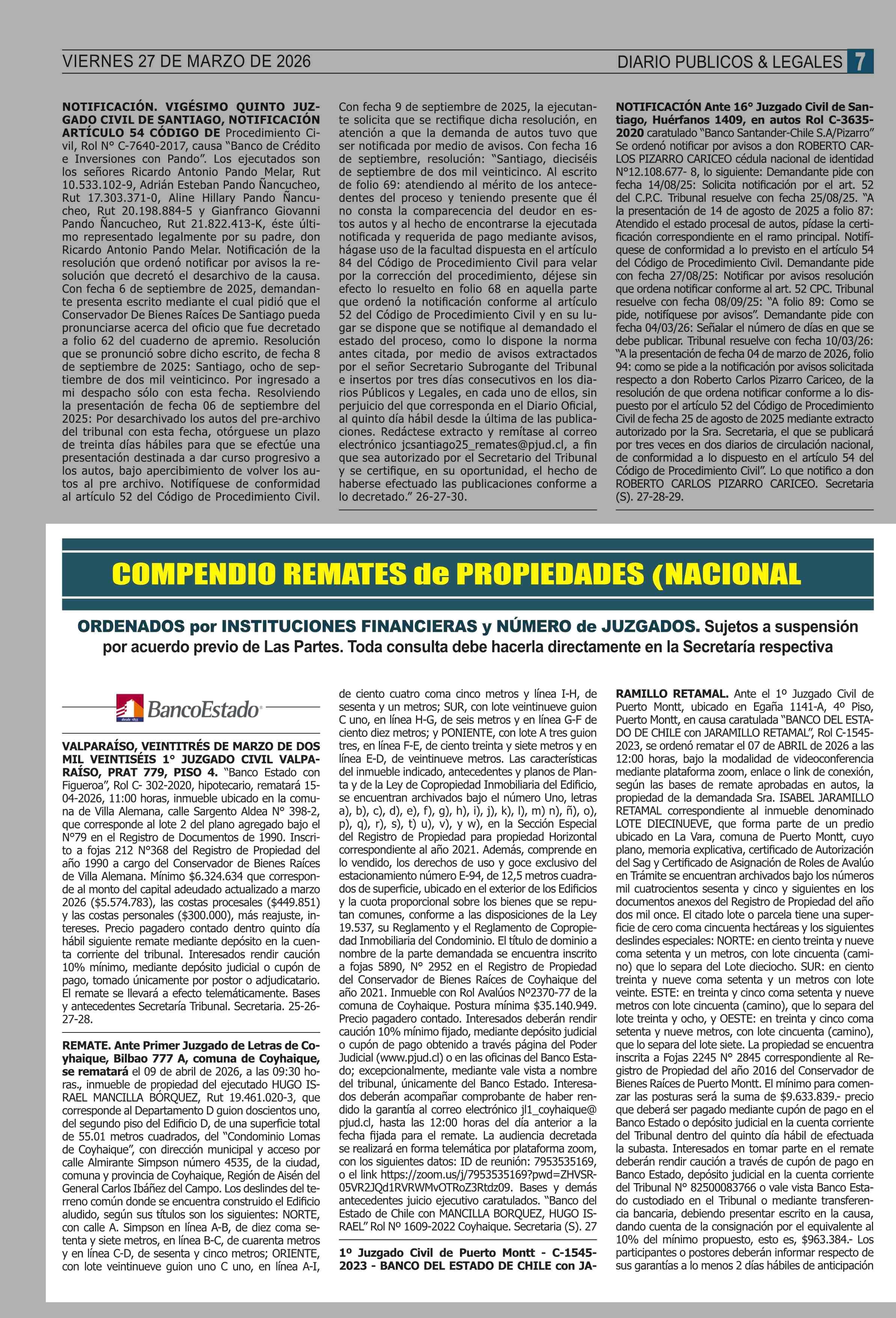 REMATES: COMPENDIO REMATES de PROPIEDADES (NACIONAL 27-03-2026 P&L Públicos y Legales |