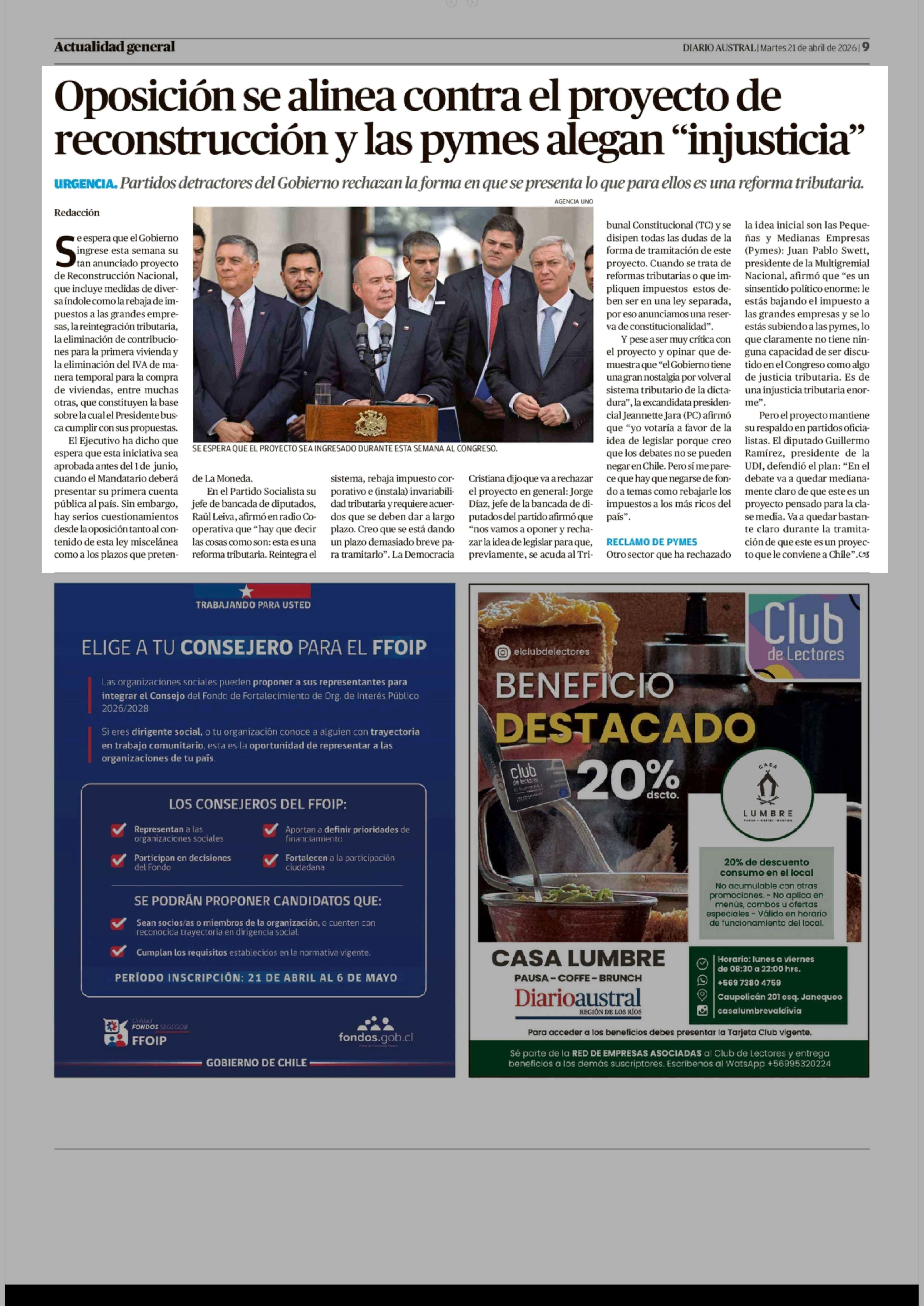 Oposición se alinea contra el proyecto de reconstrucción y las pymes alegan "injusticia" 21-04-2026 Diario Austral Región de Los Ríos |