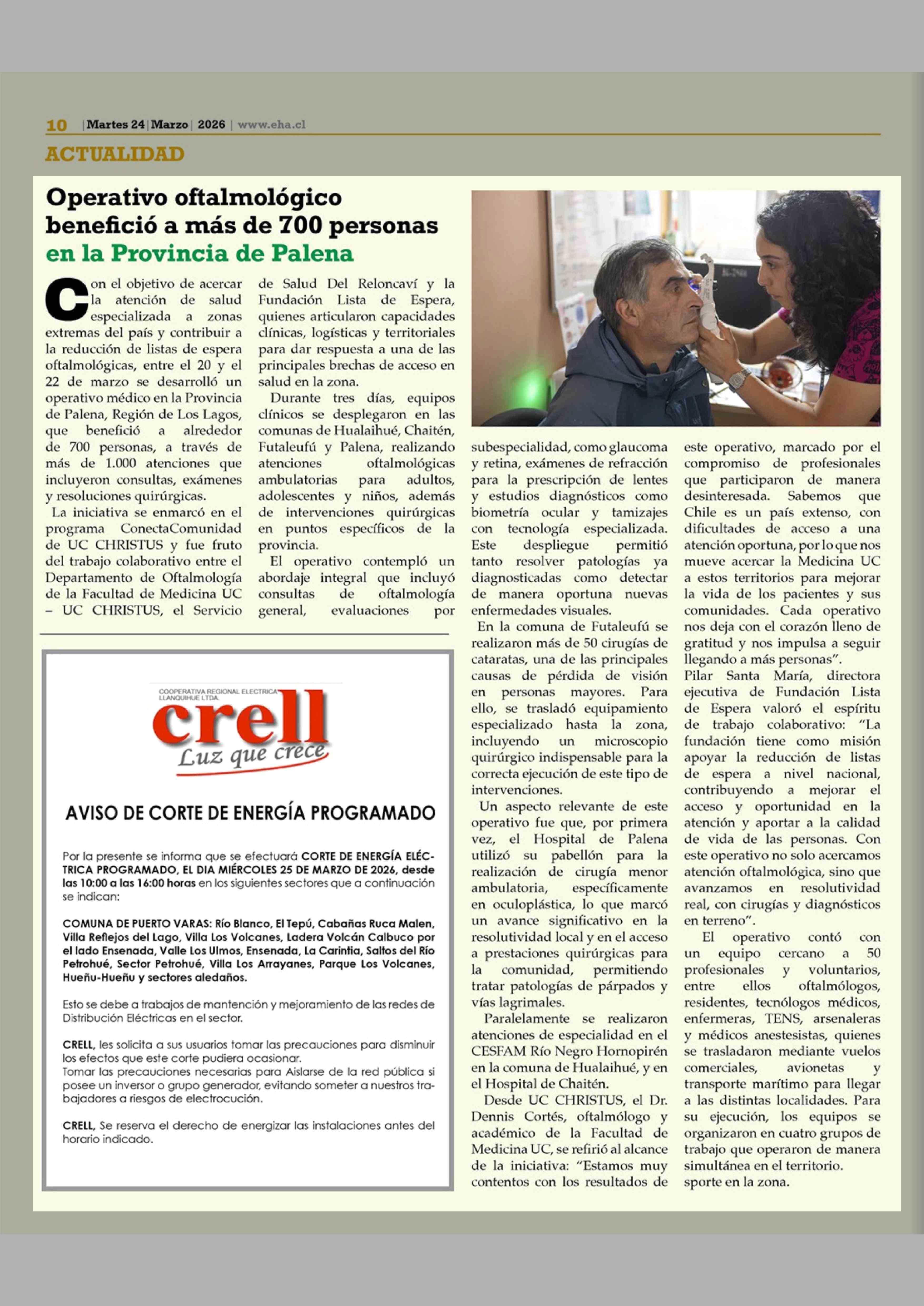 Operativo oftalmológico benefició a más de 700 personas en la Provincia de Palena 24-03-2026 El Heraldo Austral |